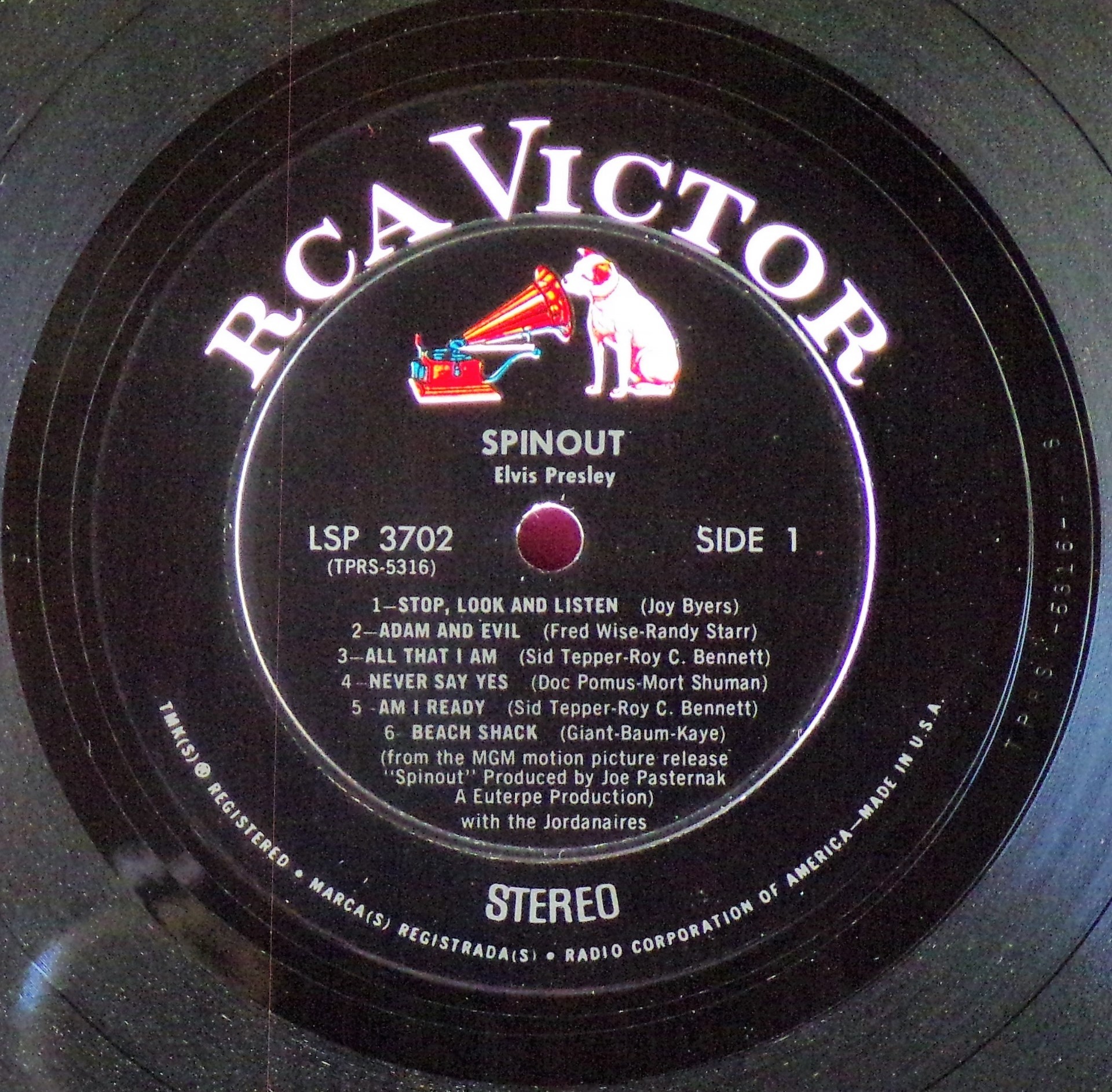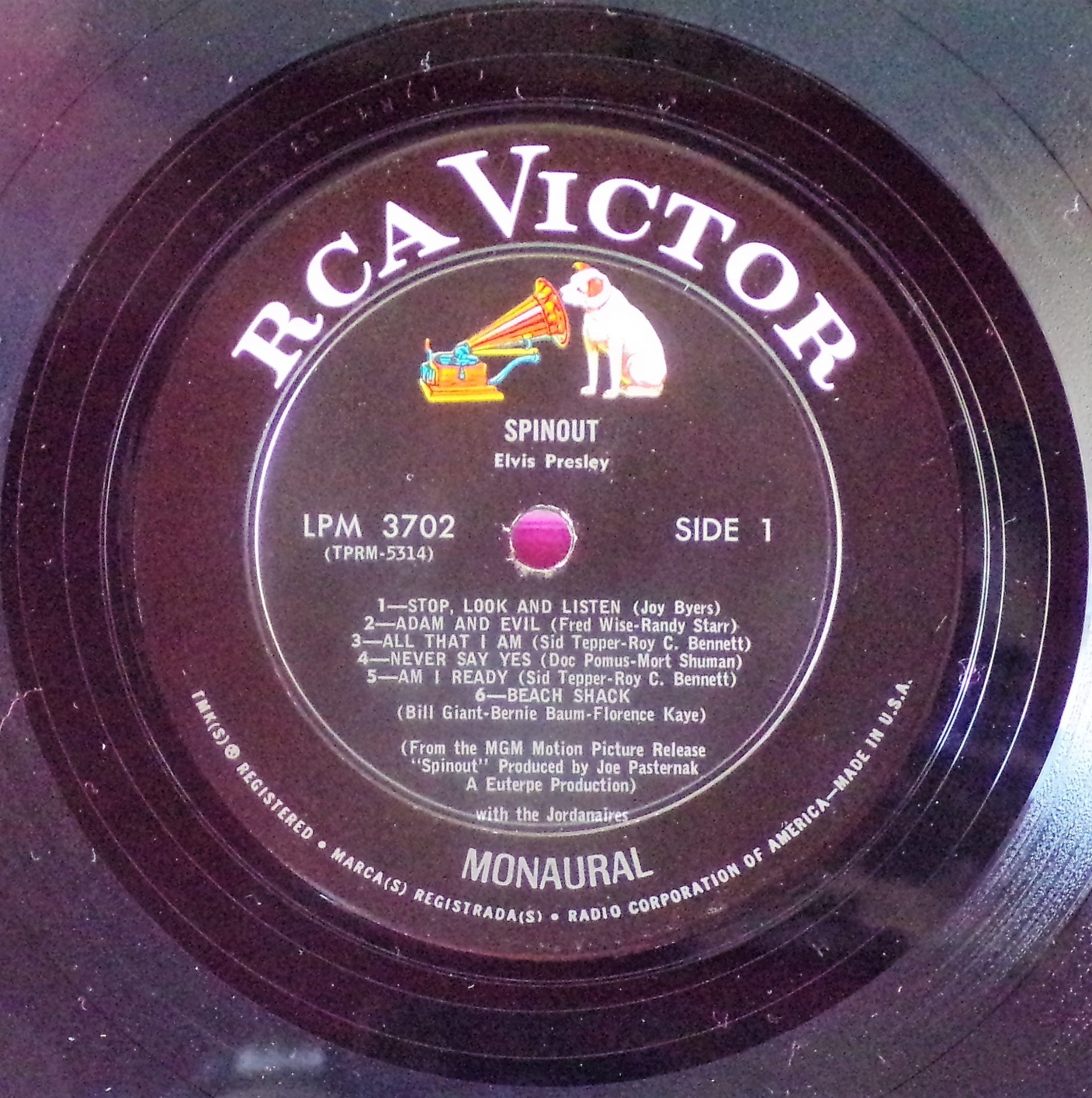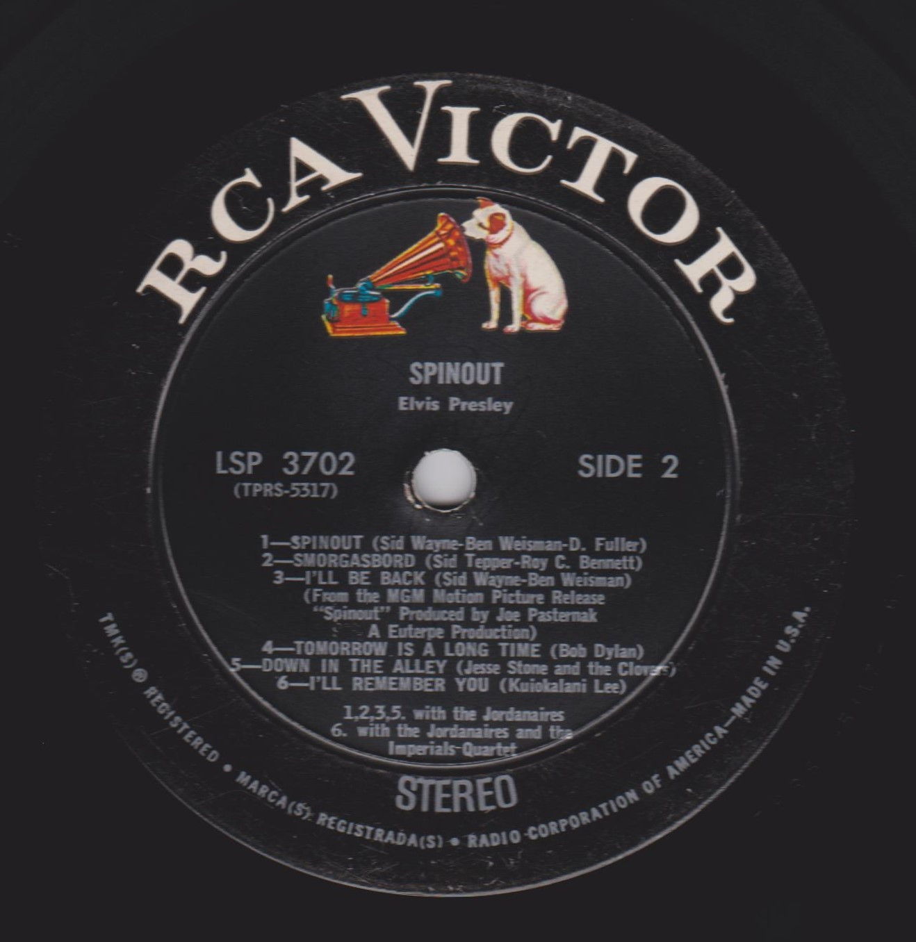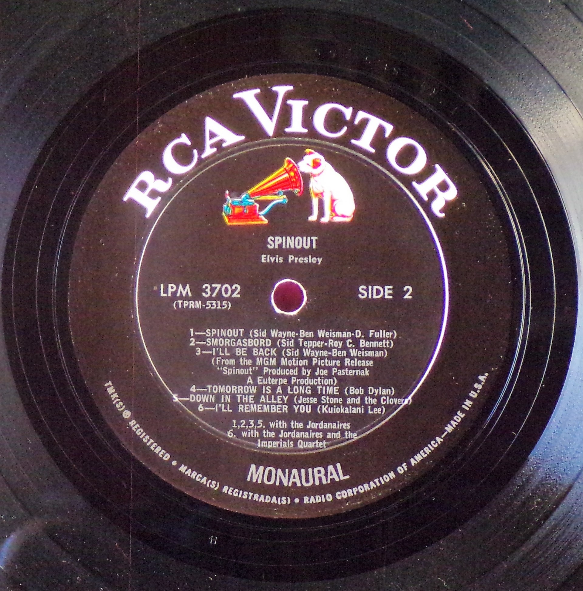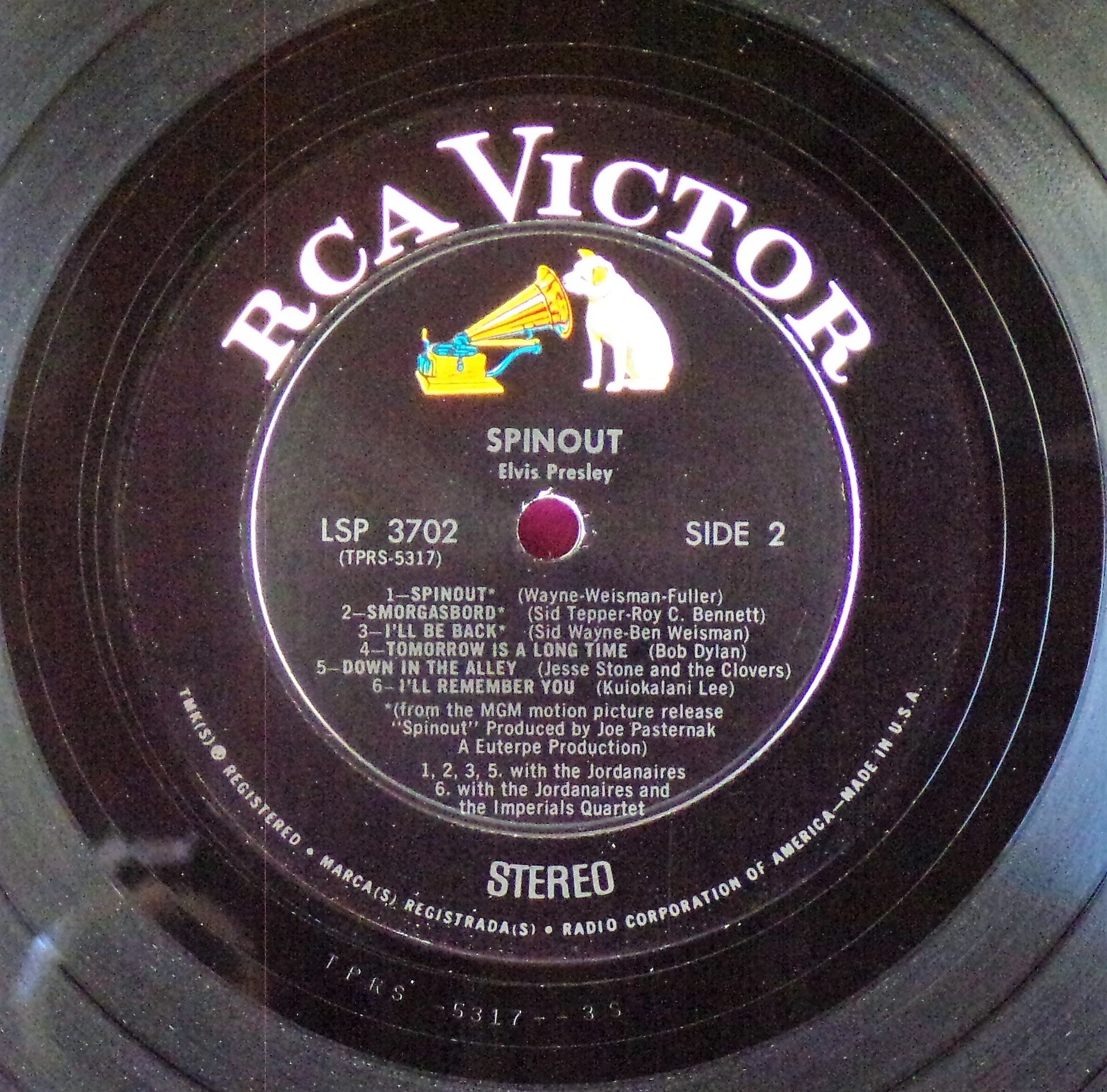 left. Rear Cover : 9 Photos of Elvis. Catalogue number top right Mono LPM 3702 / Stereo LSP 3702. Printed in U.S.A. bottom right. Label : Black with silver lettering & dog on top. RCA Victor Logo in white. Side 1 : STEREO at bottom. Side 2 : STEREO at bottom. Pressing Plant : Hollywood Matrix Number Side 1 : TPRS - 5316 - 5S A1 (Machine Stamped) Matrix Number Side 2 : TPRS - 5317 - 6S A (Machine Stamped) *NOTE* Hype Sticker attached to announce a 11 X 11 inch photo was given away free for a period during this release. It was enclosed inside the album. Side 1 song 6 on 2 lines. Side 2 MGM |