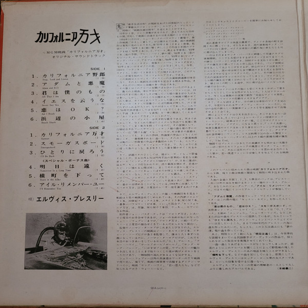 | Label: RCA – RPL-2021 Series: エルヴィス・オン・スクリーン1800 Format: Vinyl, LP, Album, Reissue, Stereo Country: Japan Released: Aug 1982 Phonographic Copyright ℗ – RCA Records Previously released in Japan in 1966 and 1969. This version was released with obi and insert containing English lyrics and Japanese liner notes. Matrix / Runout (Runout Side A - Stamped): RPL-2021A 121 Track 3, Side 2 misspelled track "Shout it out", listed as "Shot it out" |