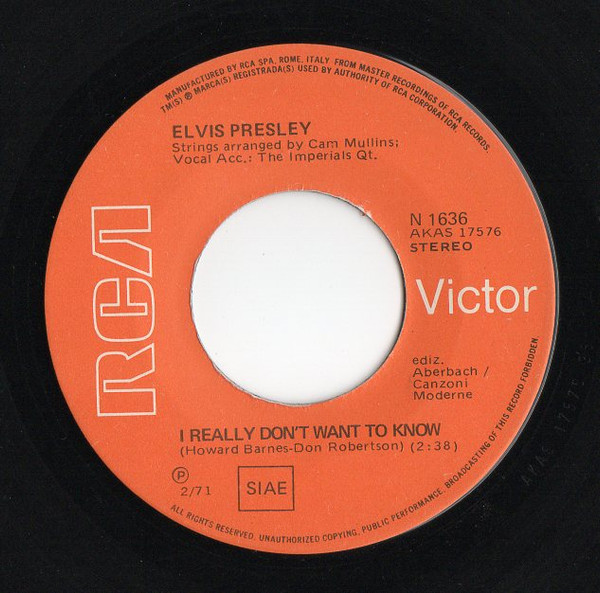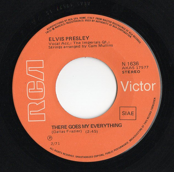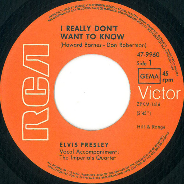 | Label: RCA Victor – 47-9960 Format: Vinyl, 7", 45 RPM, Single, Red Cover Country: Germany Released: 1970 Published By – Hill & Range Accompanied By [Vocal] – The Imperials Quartet* Coming soon ★ New Album Rights Society (Boxed): GEMA |