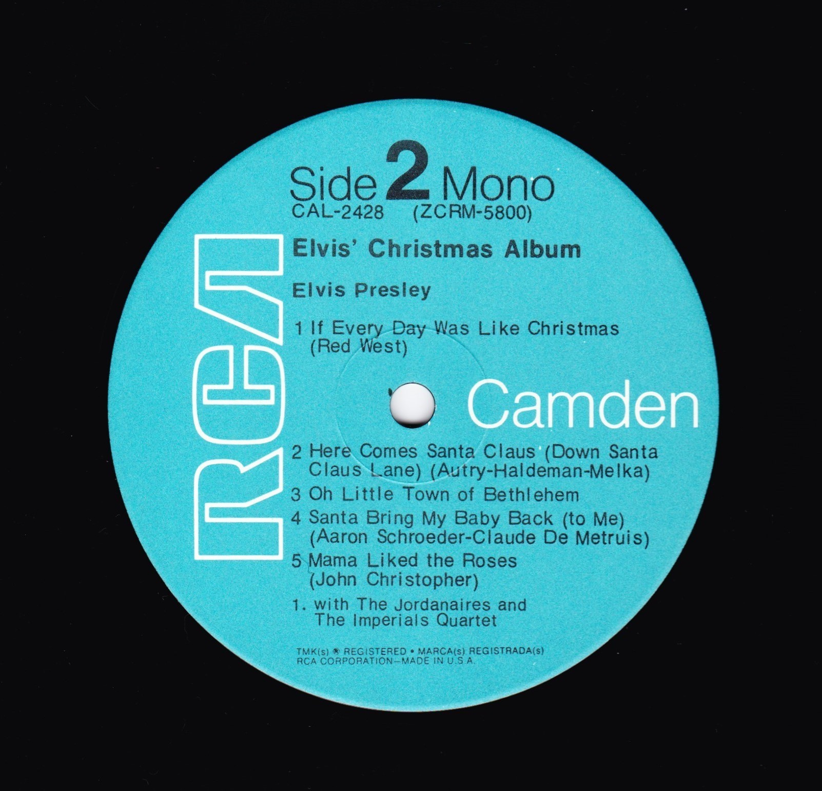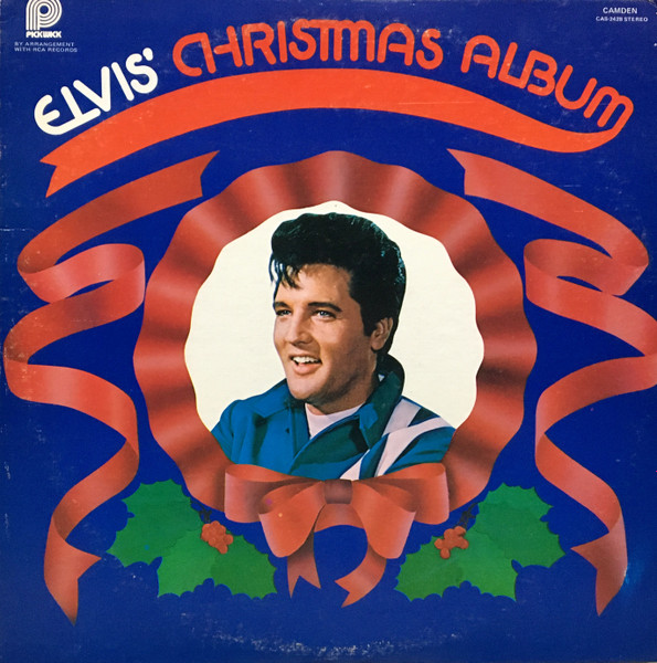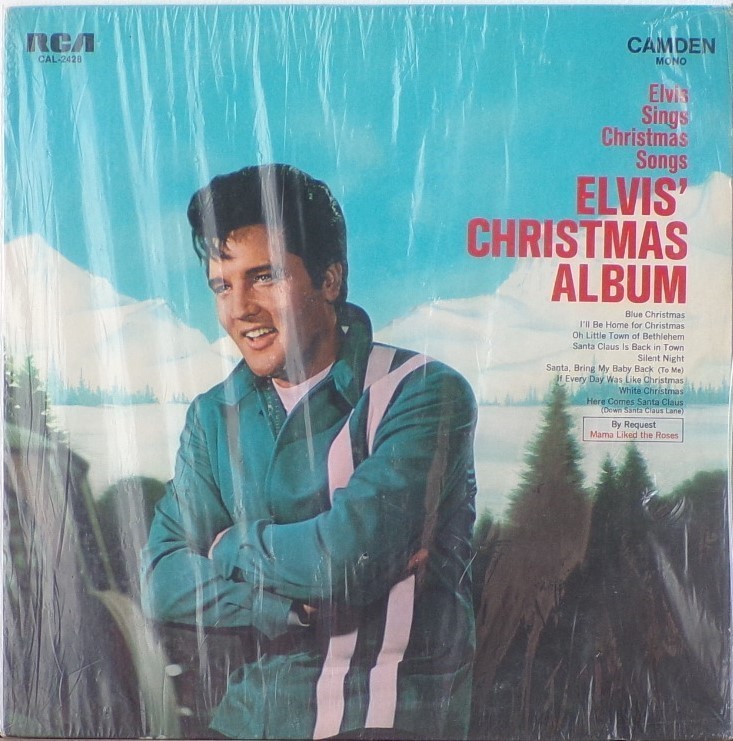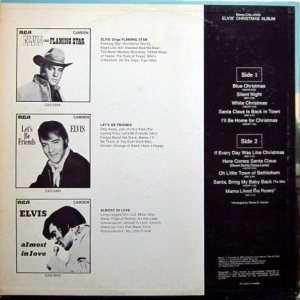 CHRISTMAS ALBUM (LP) The original Elvis' Christmas Album was out of print by the late 1960s. Interest in the album prompted RCA to re-release it in an altered version on its budget label RCA Camden in November, 1970. This version eliminated the four gospel tracks from the Peace in the Valley EP and added the 1966 holiday single "If Every Day Was Like Christmas," along with the 1970 non-seasonal B-side "Mama Liked the Roses", issued as the flip to Elvis' top ten single "The Wonder of You." With ten tracks and a shorter running time, it fit the standard for the budget label issues. The religious and secular Christmas songs were also mixed. The initial cover of this revised version echoed that of the 1958 reissue, except a more recent mid-60s vintage photograph with Elvis wearing a blue racing jacket with two white stripes on the left was used from the set of the 1967 movie Speedway. The album was also released in the UK with an album cover that featured Elvis' face from the 1970 Camden release in a circle in the middle surrounded in white with the title and the song selections in red, RCA Camden 1155. Details : Front Cover : Photo of Elvis. Title top right.