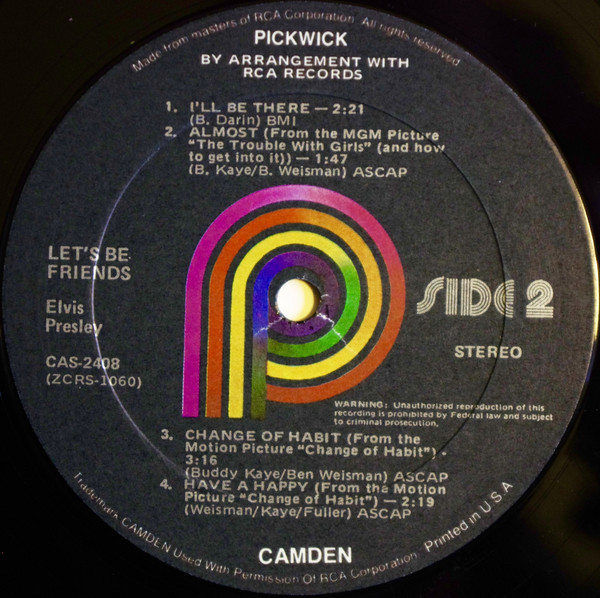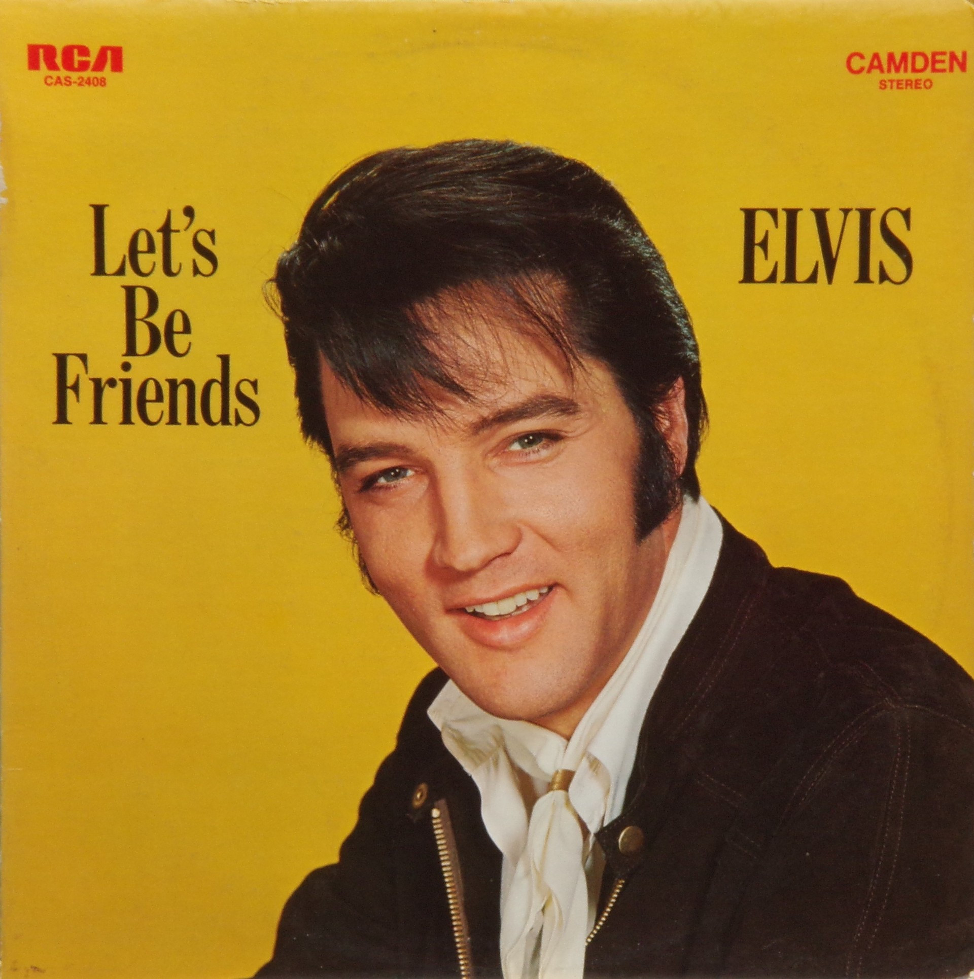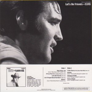 Hollywood, March 28, 1962 Let's Be Friends is the thirty-seventh album by Elvis Presley, released on RCA Camden Records CAS 2408, in April 1970. It is the second Presley budget album to appear on the RCA subsidiary label. It peaked at #105 on the Billboard 200 album chart. It was certified Gold on 7/15/1999 and Platinum on 1/6/2004 by the RIAA. Similar to its predecessor Elvis Sings Flaming Star, Let's Be Friends collects mostly unreleased songs recorded for Presley film soundtracks. Given the recent work of the revitalized Presley, in the past the Colonel might have objected to this kind of market saturation, but under the terms of Presley's agreement with RCA, budget albums brought extra cash outside of contract stipulations. Two non-movie outtakes appeared from the winter of 1969 sessions at American Sound Studio in Memphis, "I'll Be There" and "If I'm a Fool (For Loving You)." The songs "Mama," "Let's Forget About The Stars," and "Let's Be Friends" were all recorded for but not used in their respective movies. "Mama" was sung in the film Girls! Girls! Girls! by The Amigos., and Elvis' version first appeared on this album, with an alternate, abridged version included on the compact disc Elvis Double Features: Kid Galahad/Girls! Girls! Girls!. Three tracks originated from Presley's then-current film Change of Habit (including the movie's theme song), making this in essence an enhanced soundtrack release for that film. Like all Presley releases on the budget Camden label, this album has a very short running time, too short for a full-priced album in the 1970s Front Cover : Photo of Elvis. Title to the left. Catalogue