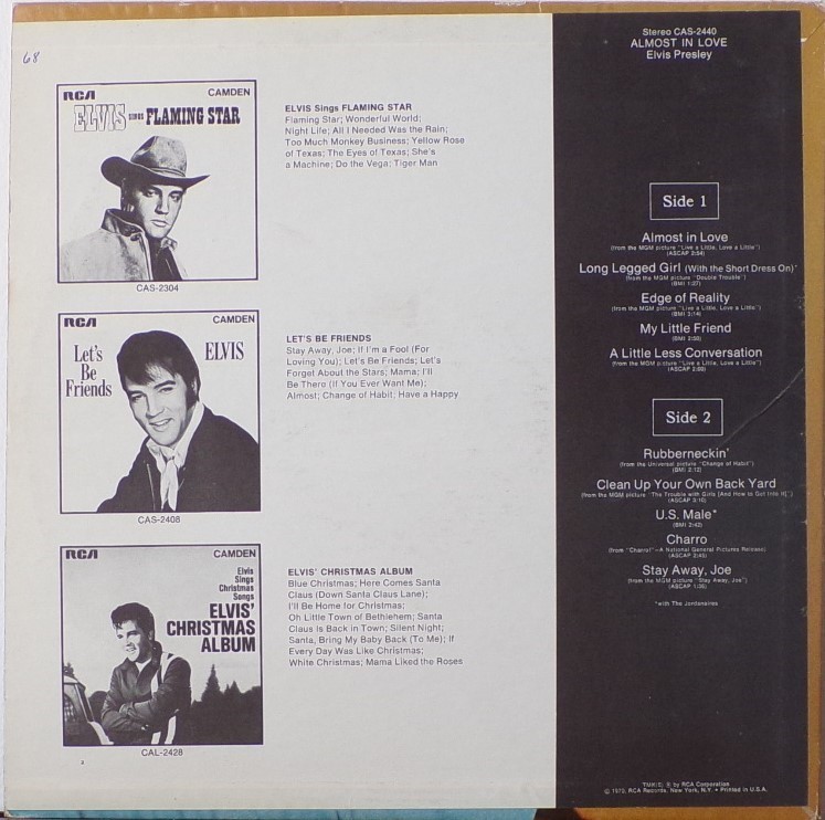| Details : 1971 Release Front Cover : Photo of Elvis. Title on top. Catalogue number top left. Rear Cover : Photo of Elvis. Catalogue number top right. Printed in U.S.A. bottom right. Label : Orange. Flexible vinyl. Side 1 : Stereo at top. Side 2 : Stereo at top. Pressing Plant : Rockaway Matrix Number Side 1 : ZPRS - 1422 - 3S A2 (Machine Stamped) Matrix Number Side 2 : ZPRS - 1423 - 4S A3 (Machine Stamped) *NOTE* The album title on the rear cover and top line is in complete red lettering. The side 1 & side 2 are surrounded by a red border. The bottom recording announcement text has no red border. |