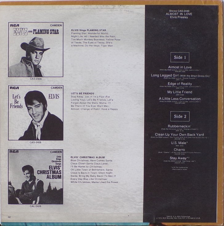 | Details : 1972 Re-issue release Front Cover : Photo of Elvis. Title bottom left. Catalogue number top left. Camden top right. Rear Cover : Promoting Camden releases of Flaming Star, Let's Be Friends & Elvis' Christmas. Catalogue number top right. Printed in U.S.A. bottom right. Label : Blue. Flexible vinyl. Side 1 : Stereo at top. Side 2 : Stereo at top. Pressing Plant : Indianapolis Matrix Number Side 1 : ZCRS - 5966 - 2S B1 (Machine Stamped) Matrix Number Side 2 : ZCRS - 5967 - 11S B1 (Machine Stamped) *NOTE* 1972 reissue with the song "Stay Away" replacing "Stay Away, Joe" as the latter was already issued previous. The number "2" was more to the left on the original release. These are the only changes to this album from the original. Rear cover "RE" bottom left & number "2" bottom right. |