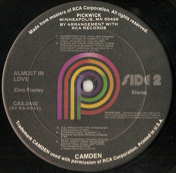 | Label: Pickwick – CAS-2440 Format: Vinyl, LP, Compilation, Reissue, Keel Pressing Country: US Released: 1975 Record Company – Pickwick International, Inc. Previously released on Camden Records. A1, A3, A5 from MGM picture "Live a little, love a little" Official innersleeve with this LP is a "Pickwick" company innersleeve (a white sleeve, with on both sides, in blue lettering, pickwick logo's printed sideways), with on the bottom corner 'Printed in U.S.A.'. Rights Society: BMI. Rights Society: ASCAP Matrix / Runout (Label A-Side): ZCRS-5966 |