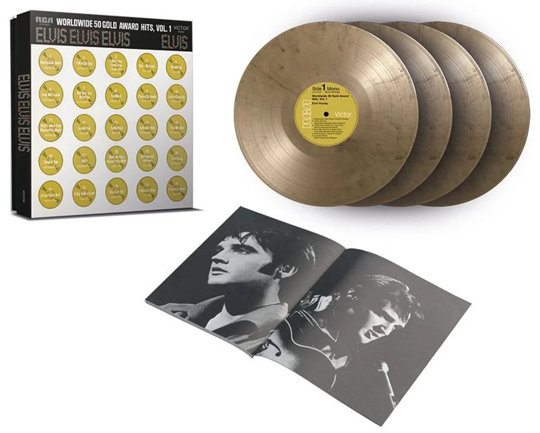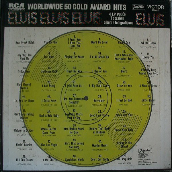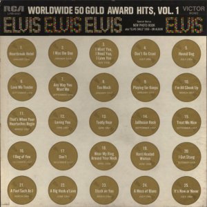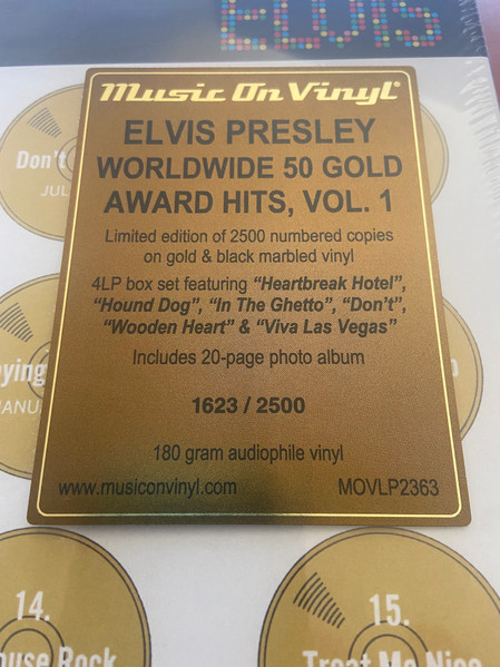 50 GOLD AWARD HITS, VOLUME 1 (4 x LP) Details : *NOTE* This box is bound to the left and opens like a book. Front cover gold records 1 - 25 are a flat gold colour, but the rear cover gold records 26 - 50 are a bright gold colour. The first above booklet came with this release. Worldwide 50 Gold Award Hits Vol. 1 is a compilation album by Elvis Presley. The album was released in August, 1970, as his 38th album. It was certified Gold on 2/13/1973, Platinum on 3/27/1992 and 2x Platinum on 6/17/1992 by the RIAA. This is a 4 LP box set and was released with 2 different photo albums included. |