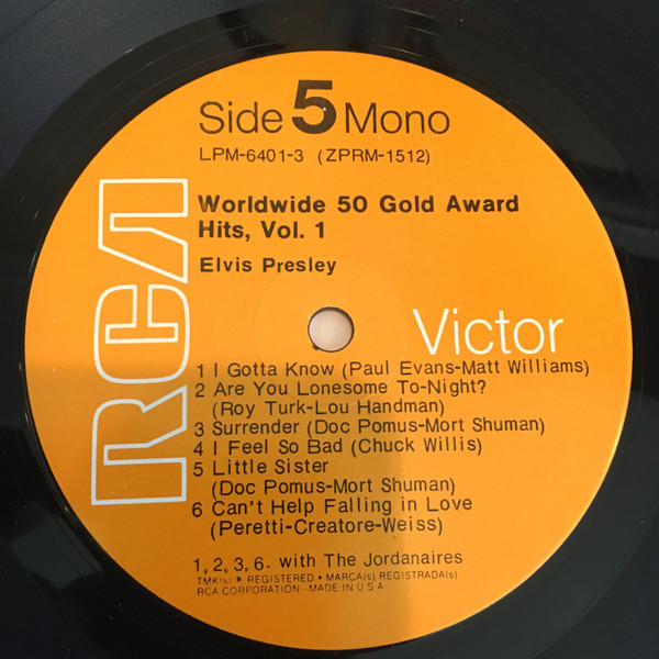 | Details : 1977 Release Front Cover : Photo of Elvis. Title top centre. Catalogue number top left. Rear Cover : 12 Photos of Elvis. Catalogue number top right. Printed in U.S.A. bottom centre. Label : Black. Flexible vinyl. Side 1 : RCA at top Side 2 : RCA at top Pressing Plant : Indianapolis Matrix Number Side 1 : ZPRS - 1867 - 5S A1 (Machine Stamped) NN (Hand Etched) Matrix Number Side 2 : ZPRS - 1868 - 6S C1 (Machine Stamped) J (Hand Etched) *NOTE* Font on label is a bright silver finish. |
