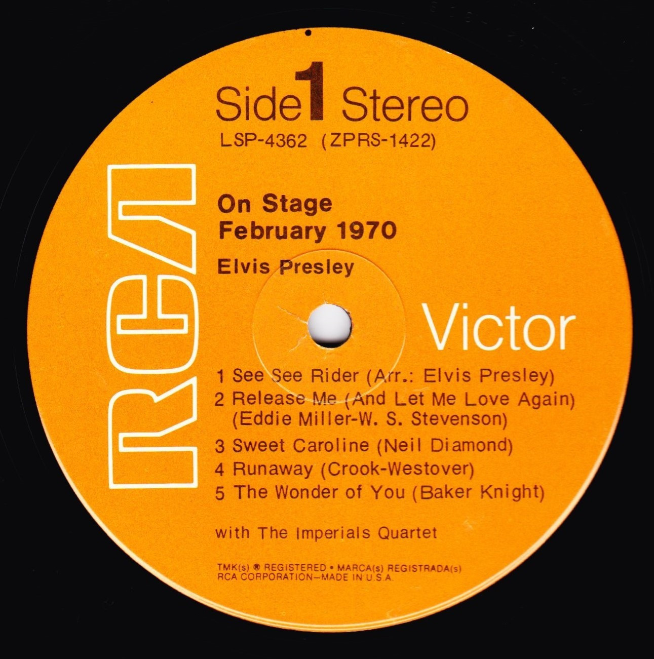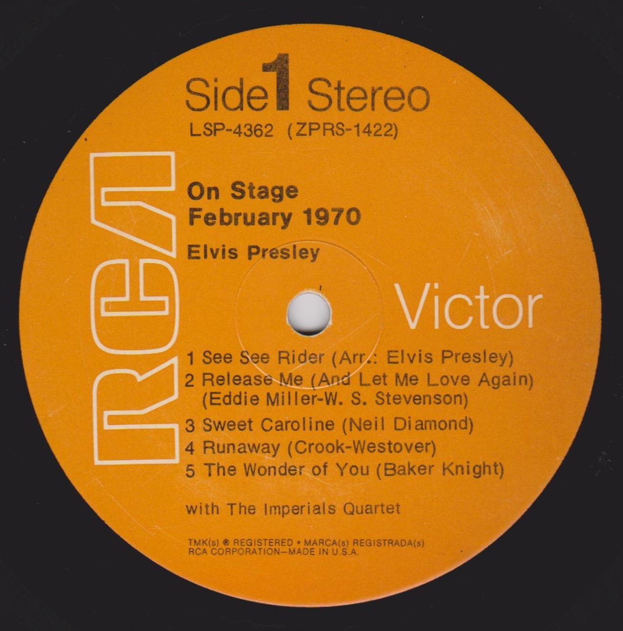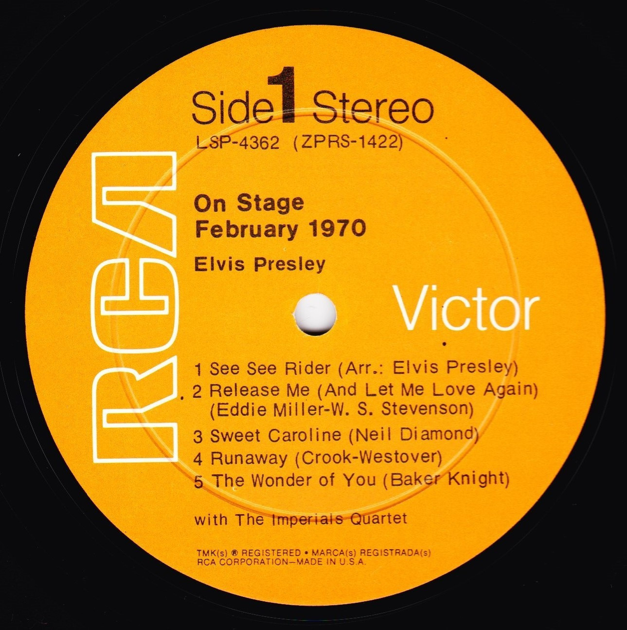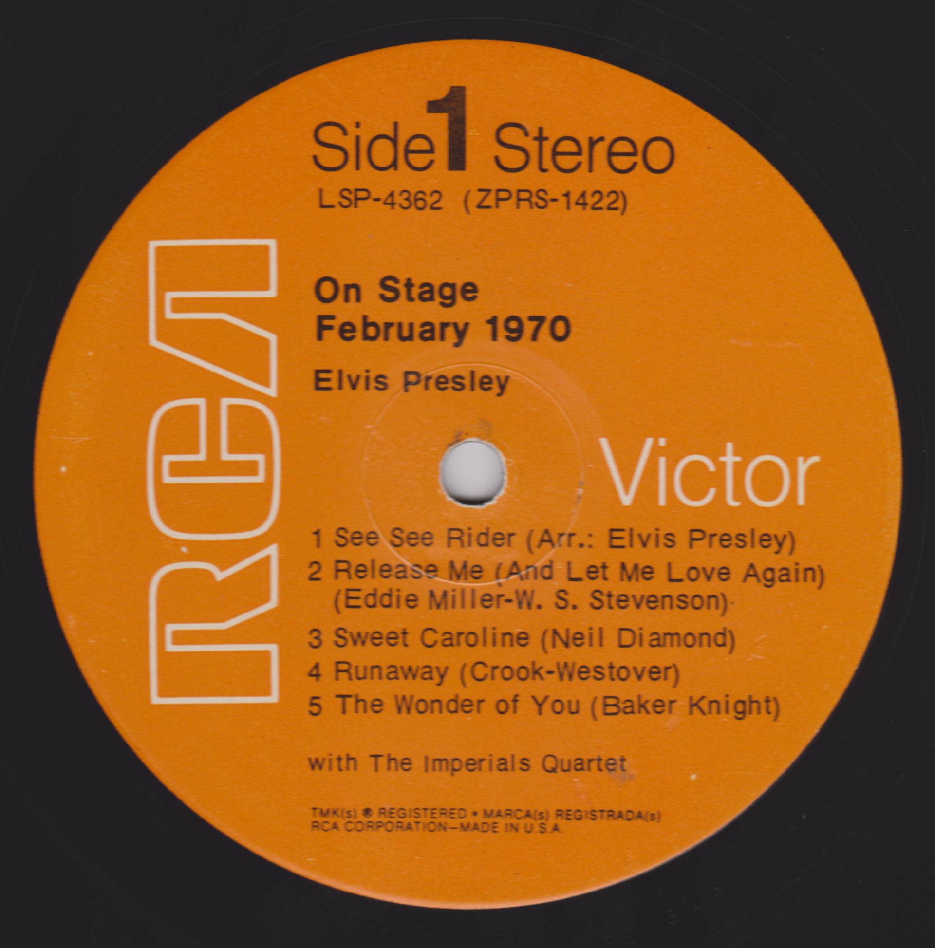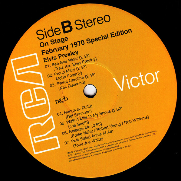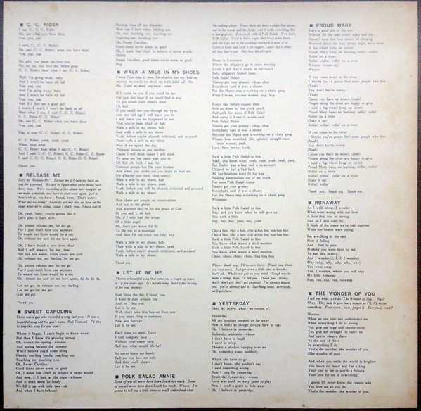 STAGE - FEBRUARY 1970 (LP) (US) RCA LSP 4362 Released: June 1, 1970 Side 1 See See Rider **** Release Me **** Sweet Caroline ** Runaway * Wonder Of You **** Side 2 Polk Salad Annie **** Yesterday * Proud Mary ** Walk A Mile In My Shoes ***** Let It Be Me *** * Recorded:
