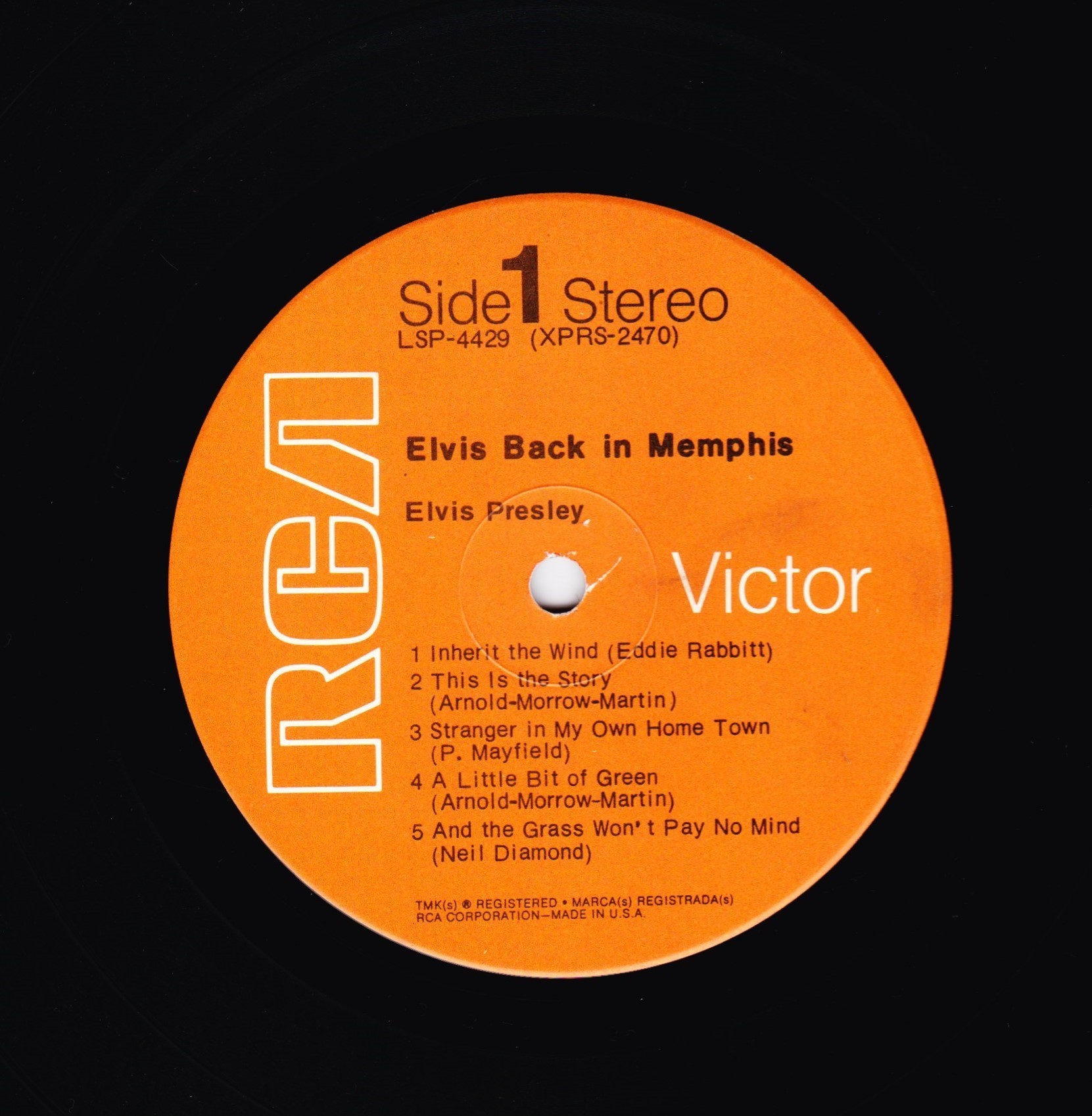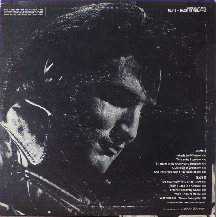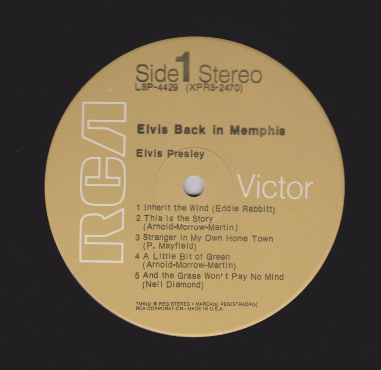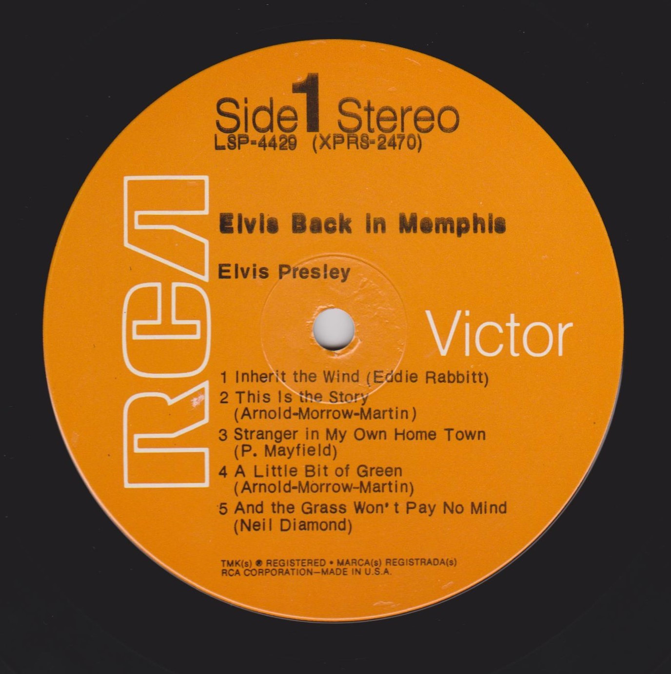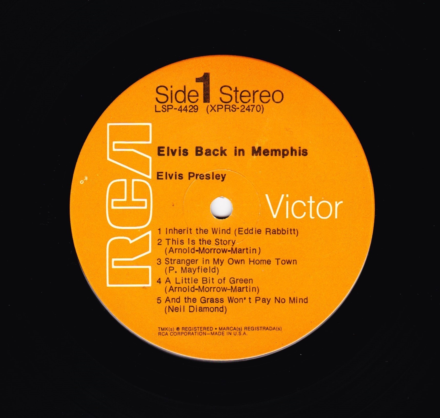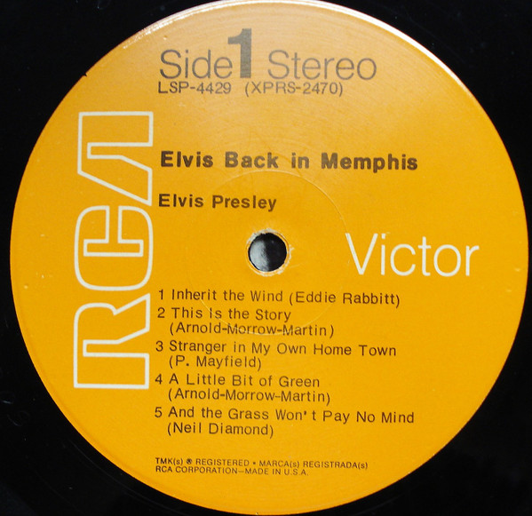 IN MEMPHIS (LP) Brief History : This single LP is the second half of the double album "LSP-6020 From Memphis to Vegas / From Vegas to Memphis". In November 1970, RCA reissued this as an individual album. It has been issued separately ever since. Label: RCA Victor – LSP-4429 1st pressing with orange labels. Matrix / Runout (Side A Label): XPRS 2470 |