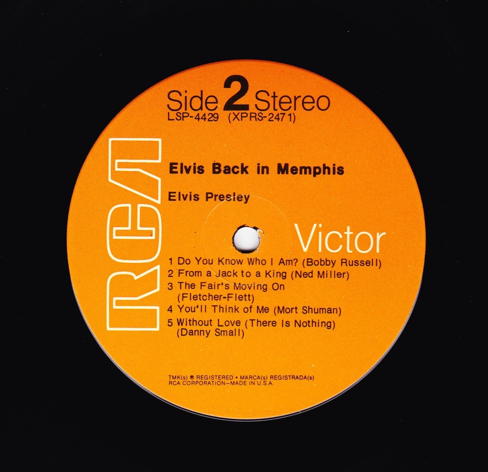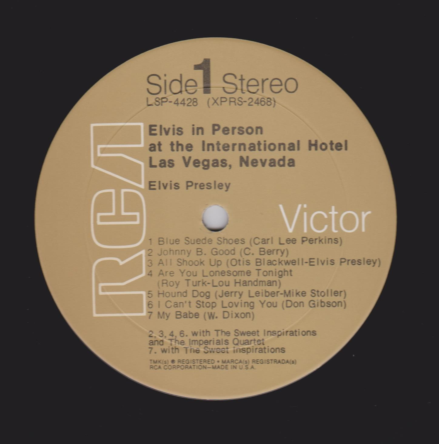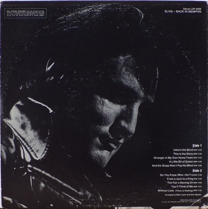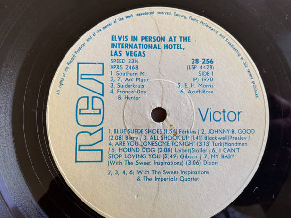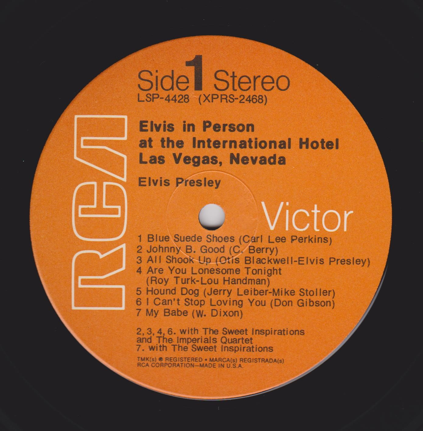 IN MEMPHIS (LP) Brief History : This single LP is the second half of the double album "LSP-6020 From Memphis to Vegas / From Vegas to Memphis". In November 1970, RCA reissued this as an individual album. It has been issued separately ever since. Label: RCA Victor – LSP-4429 1st pressing with orange labels. Matrix / Runout (Side A Label): XPRS 2470 |
