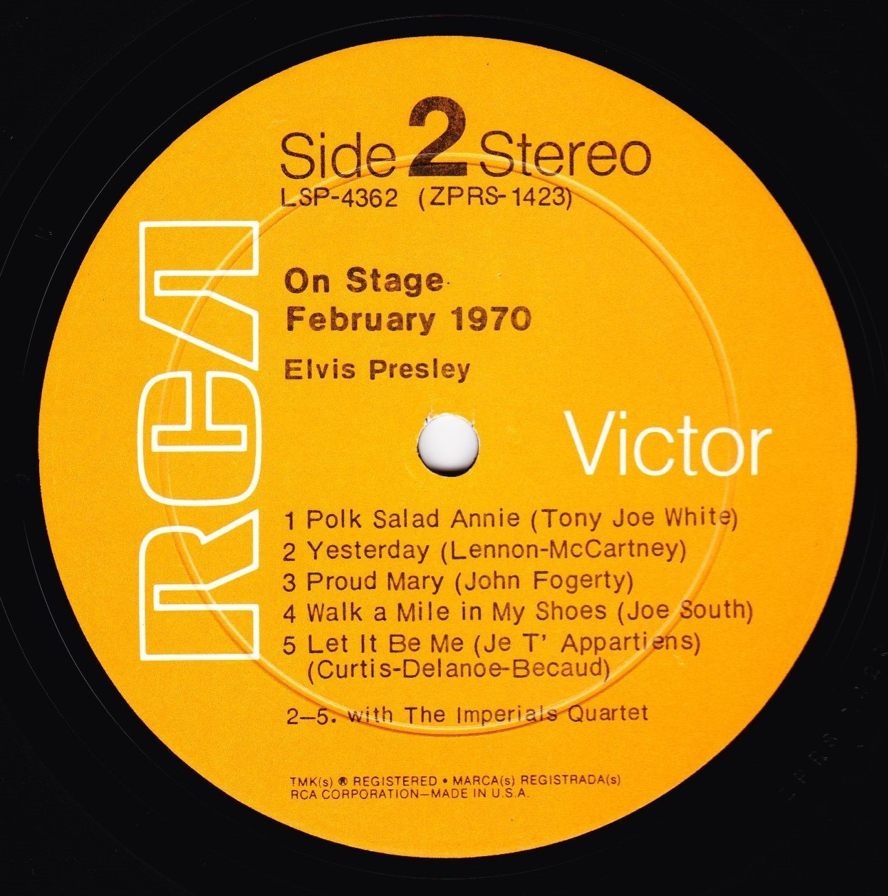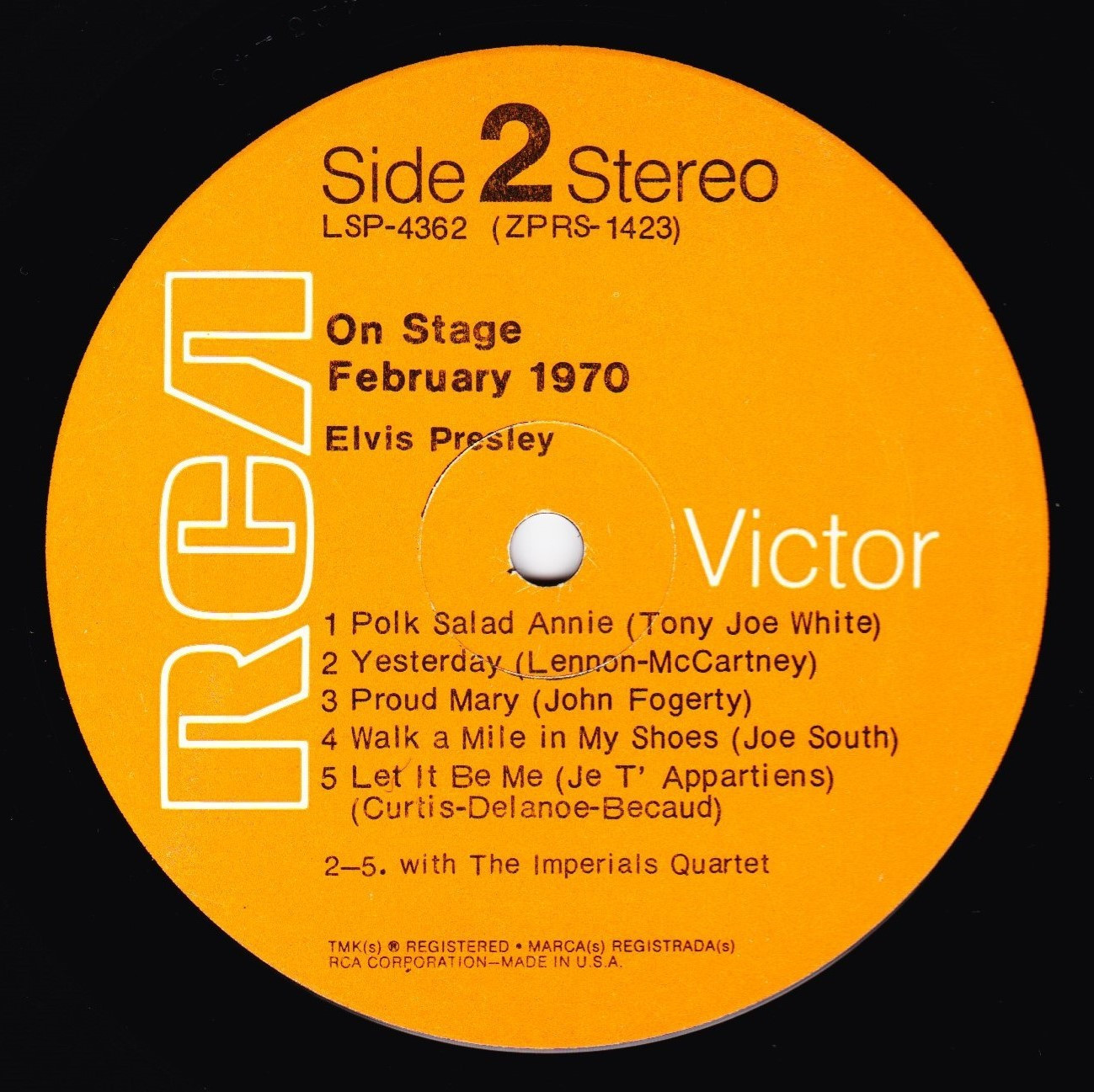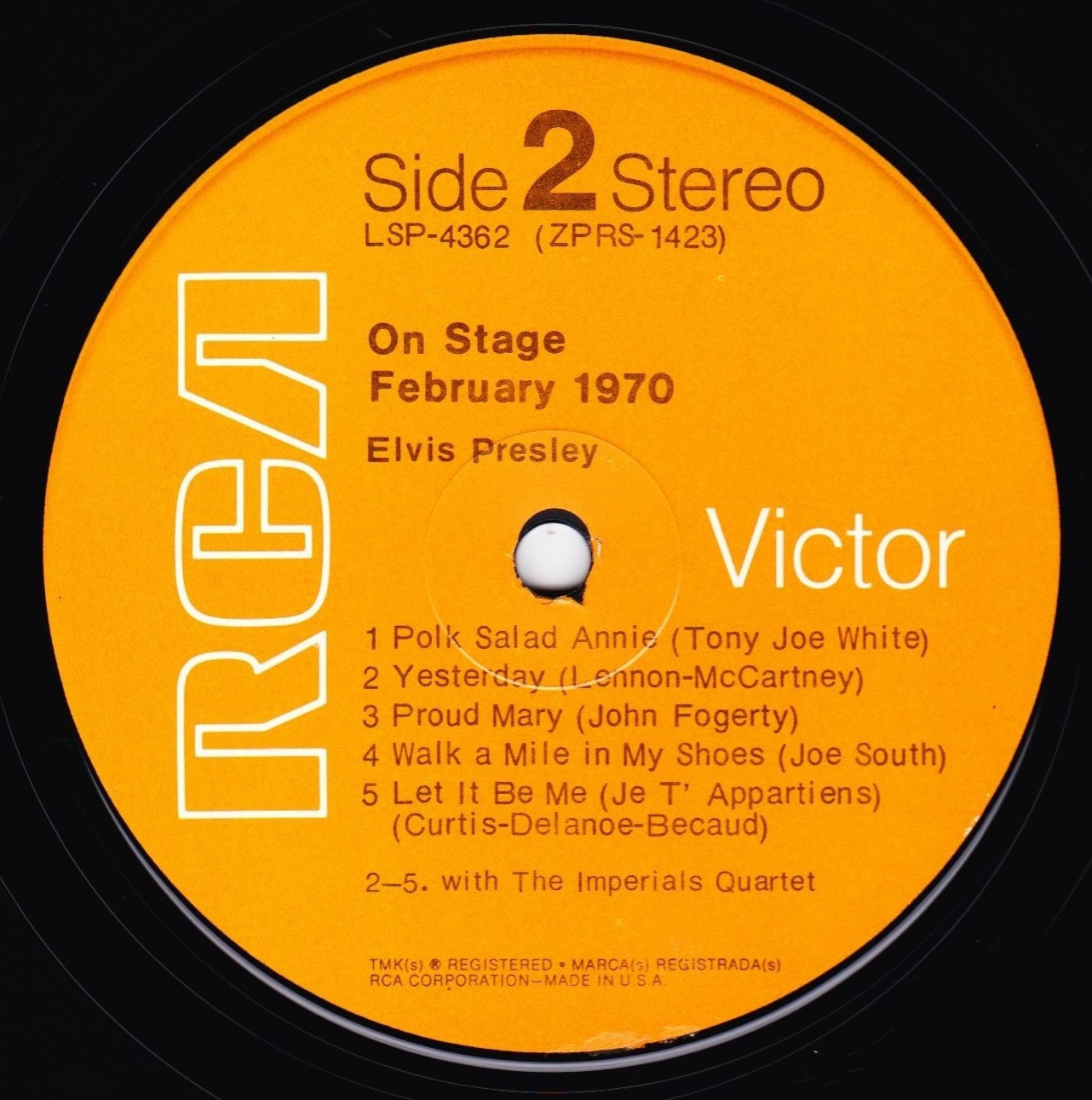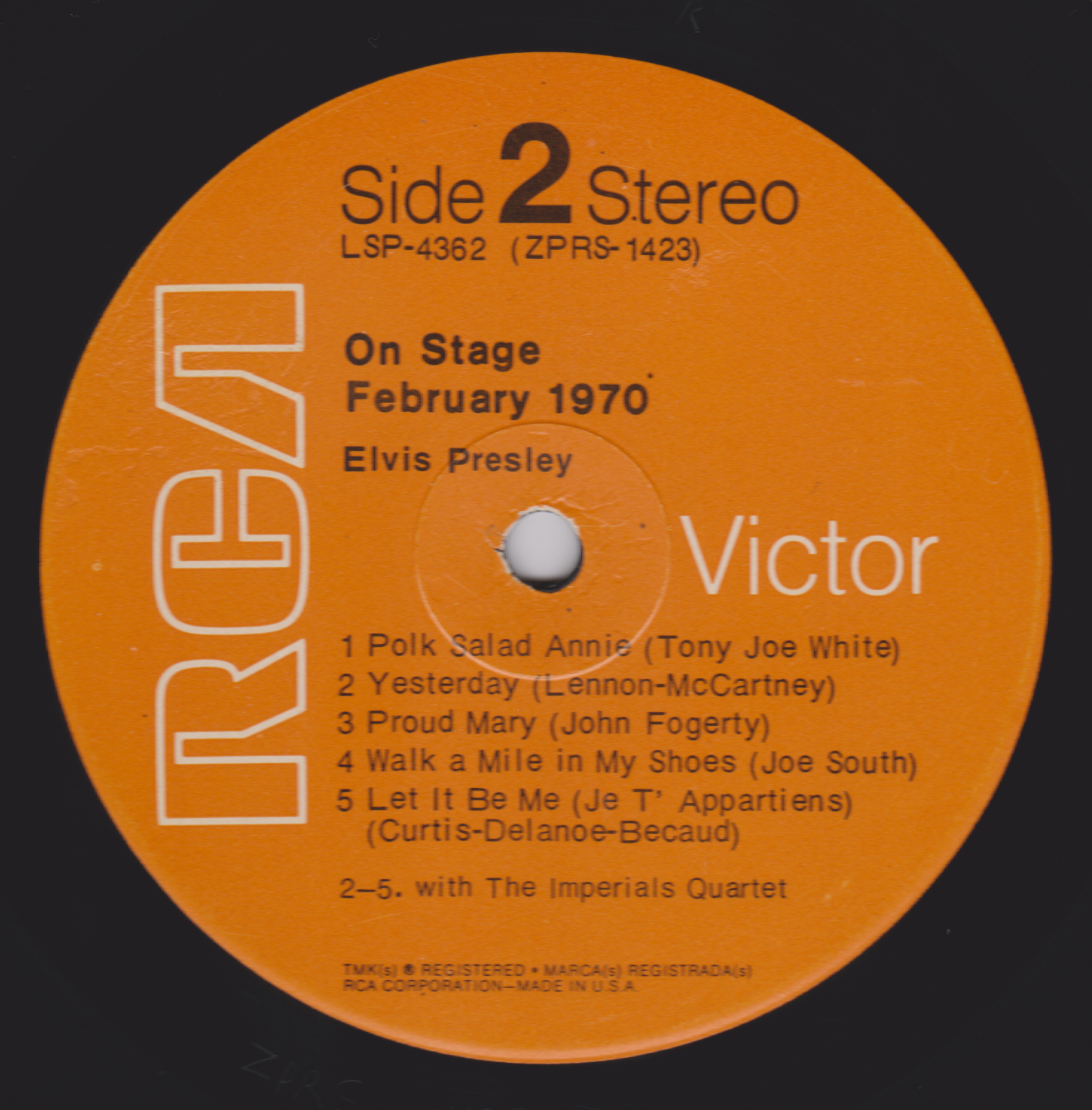 IN MEMPHIS (LP) Brief History : This single LP is the second half of the double album "LSP-6020 From Memphis to Vegas / From Vegas to Memphis". In November 1970, RCA reissued this as an individual album. It has been issued separately ever since. Label: RCA Victor – LSP-4429 1st pressing with orange labels. Matrix / Runout (Side A Label): XPRS 2470 |