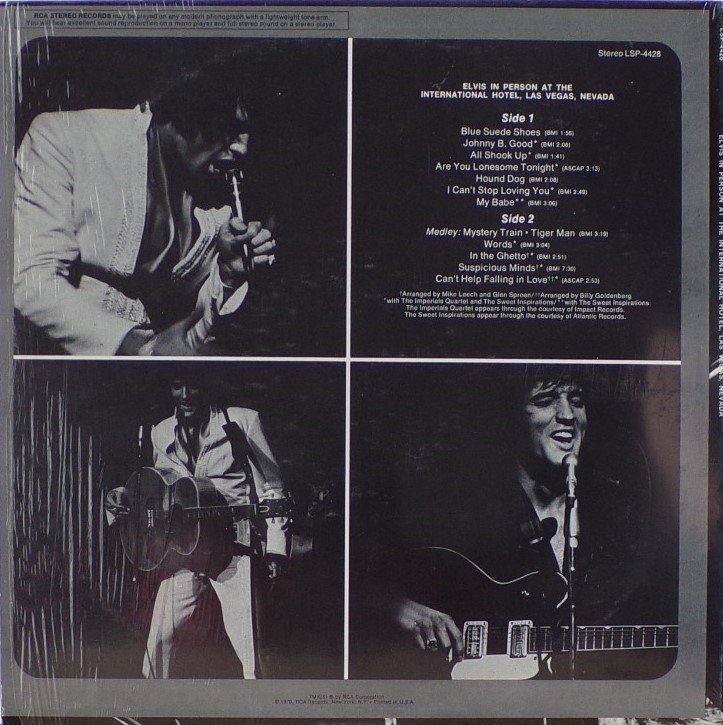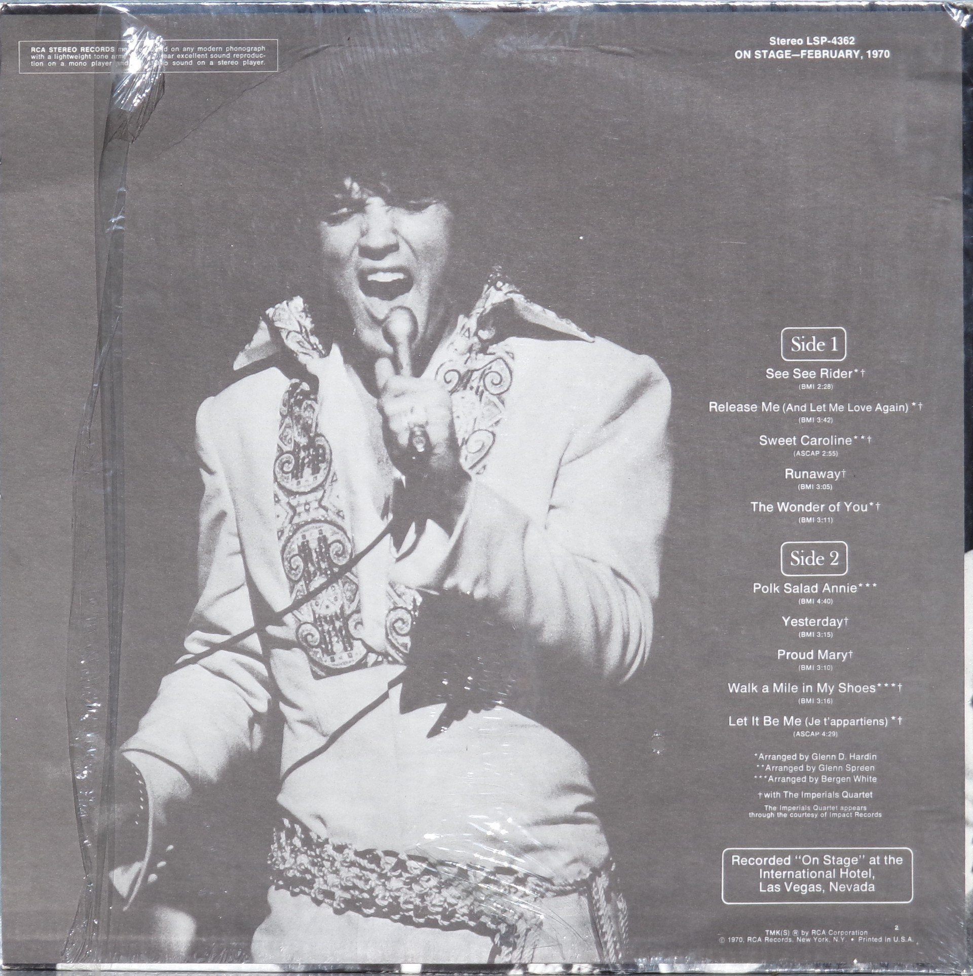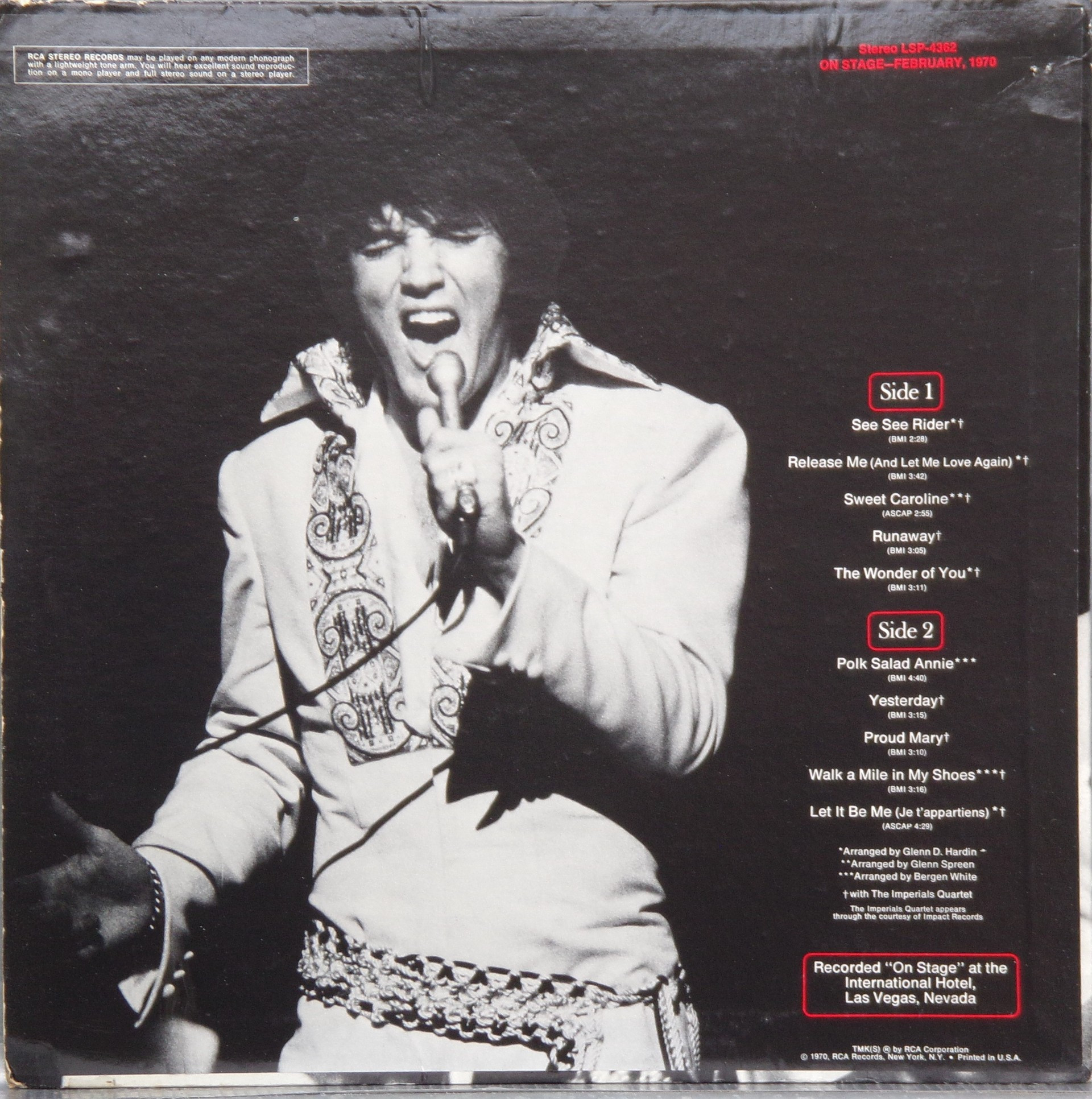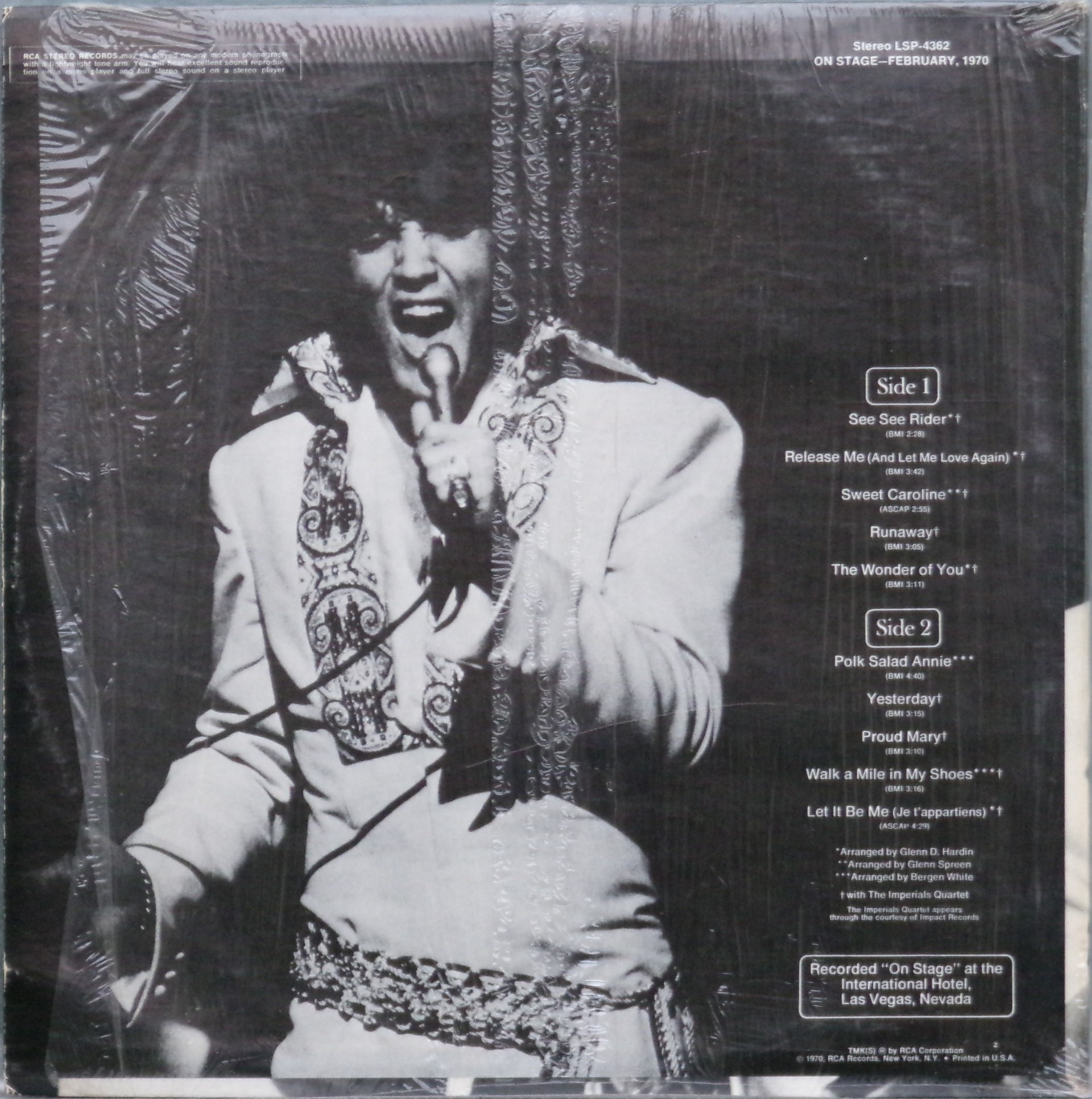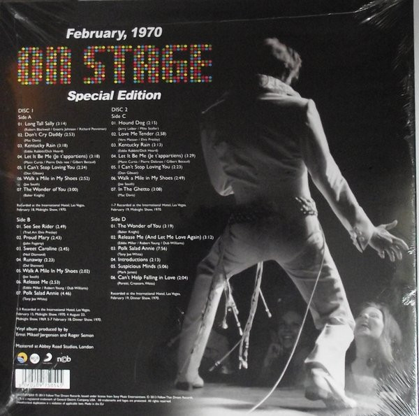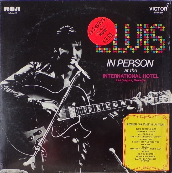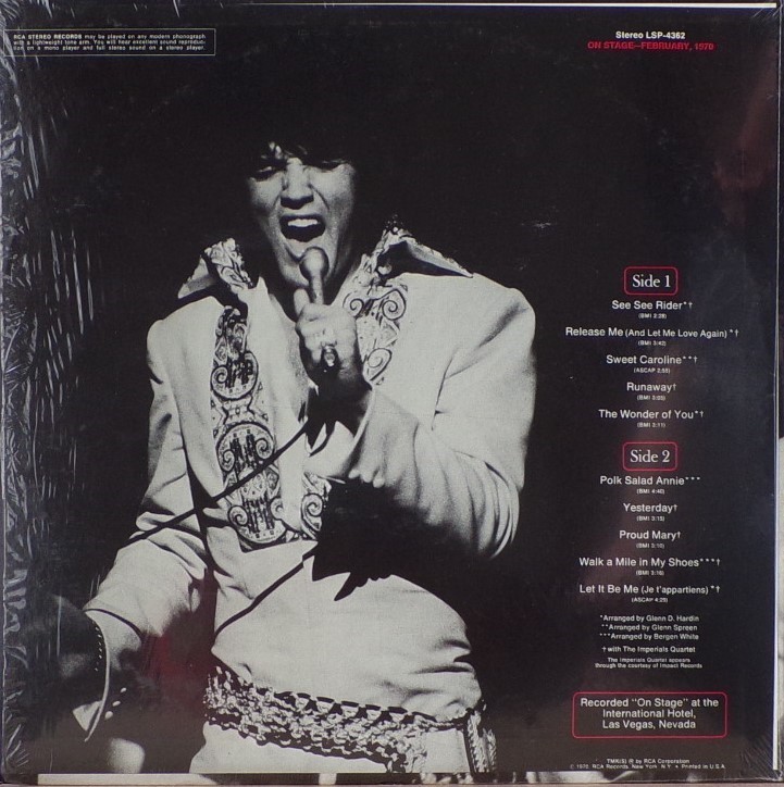 International Hotel, Las Vegas, August 25, 1969 DS On Stage is an Elvis Presley live album recorded between February 17 and 19, 1970 at the International Hotel, Paradise, Nevada. Released on RCA Records LSP-4362.It features the world-wide #1 single "The Wonder of You", which topped both the United States AC tracks chart and the British music chart. It was an immediate follow up to From Memphis to Vegas/From Vegas to Memphis, which also featured live recordings. Unlike the previous release, however, this album focused on songs that were not, at the time, associated with Elvis. This album was released in June 1970 and peaked on the chart in July 1970. It was certified Gold on 2/23/1971 and Platinum on 7/15/1999 by the RIAA. Other selections include "See See Rider", Paul McCartney's "Yesterday", Tony Joe White's "Polk Salad Annie", Del Shannon's "Runaway", and a version of "Let It Be Me". "See See Rider" would go on to become Elvis' frequent introductory number at his concerts, while "Polk Salad Annie" also became a regular part of his repertoire. The album is notable for not showing Elvis' name anywhere on the cover. The album has remained in print since its release date and has sold more than ten million copies globally. On January 8, 2010 it was announced that a Legacy Edition would be released, to follow the Legacy Edition release of "From Elvis In Memphis", in the spring of 2010. Details : Front Cover : Photo of Elvis. Title on top. Catalogue