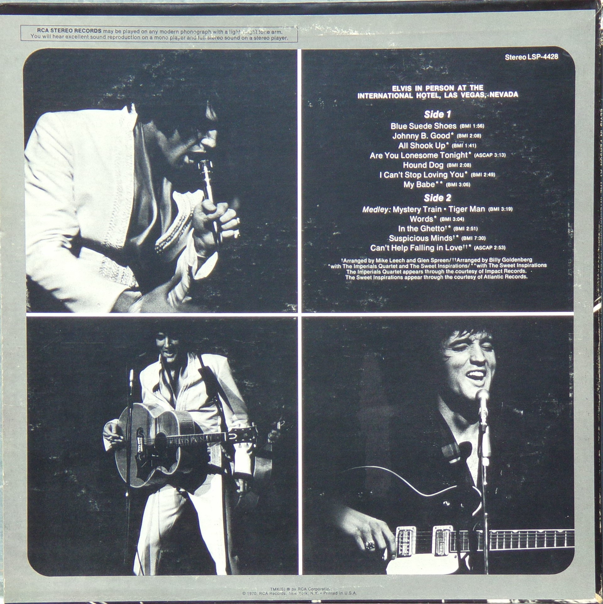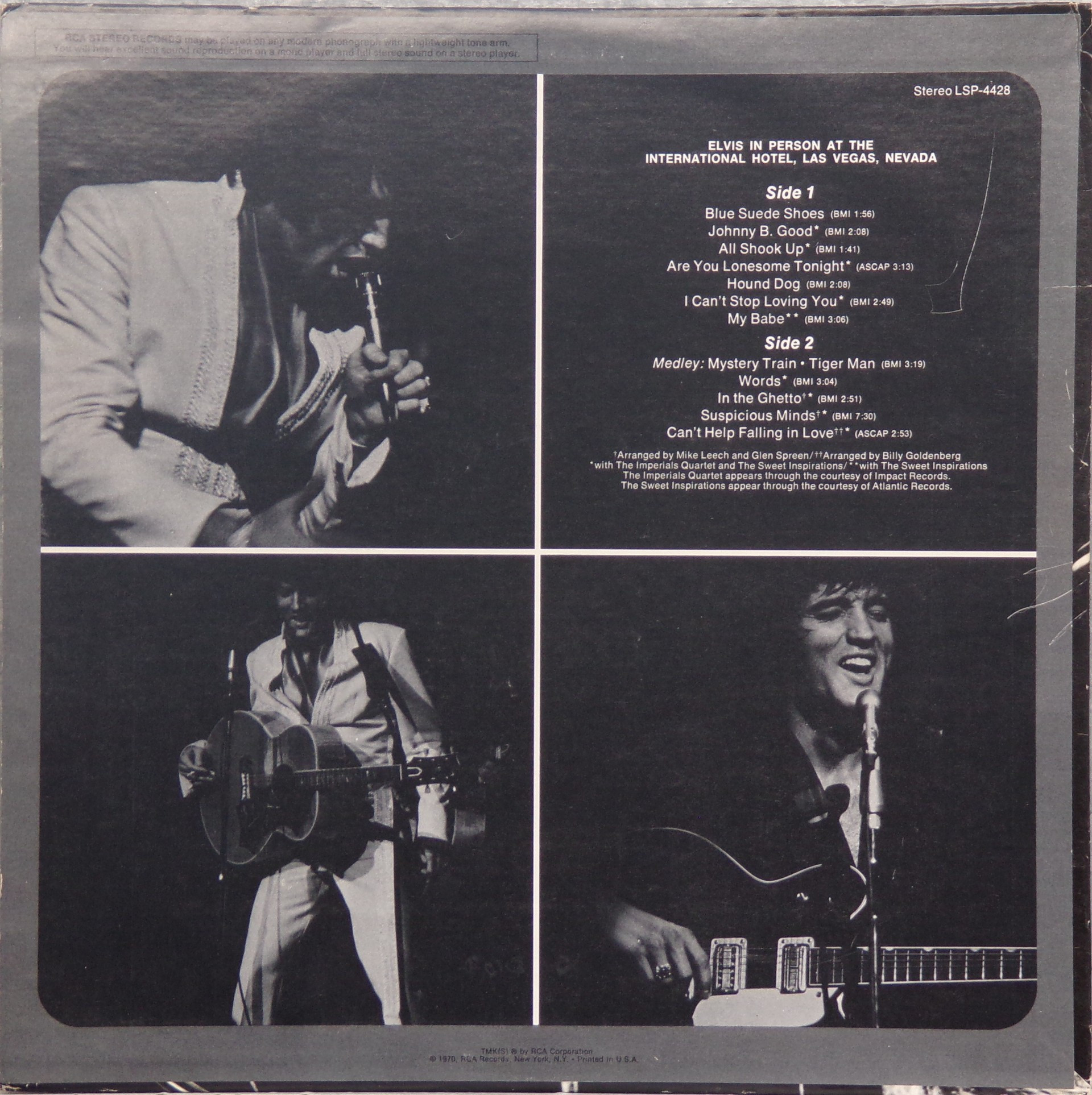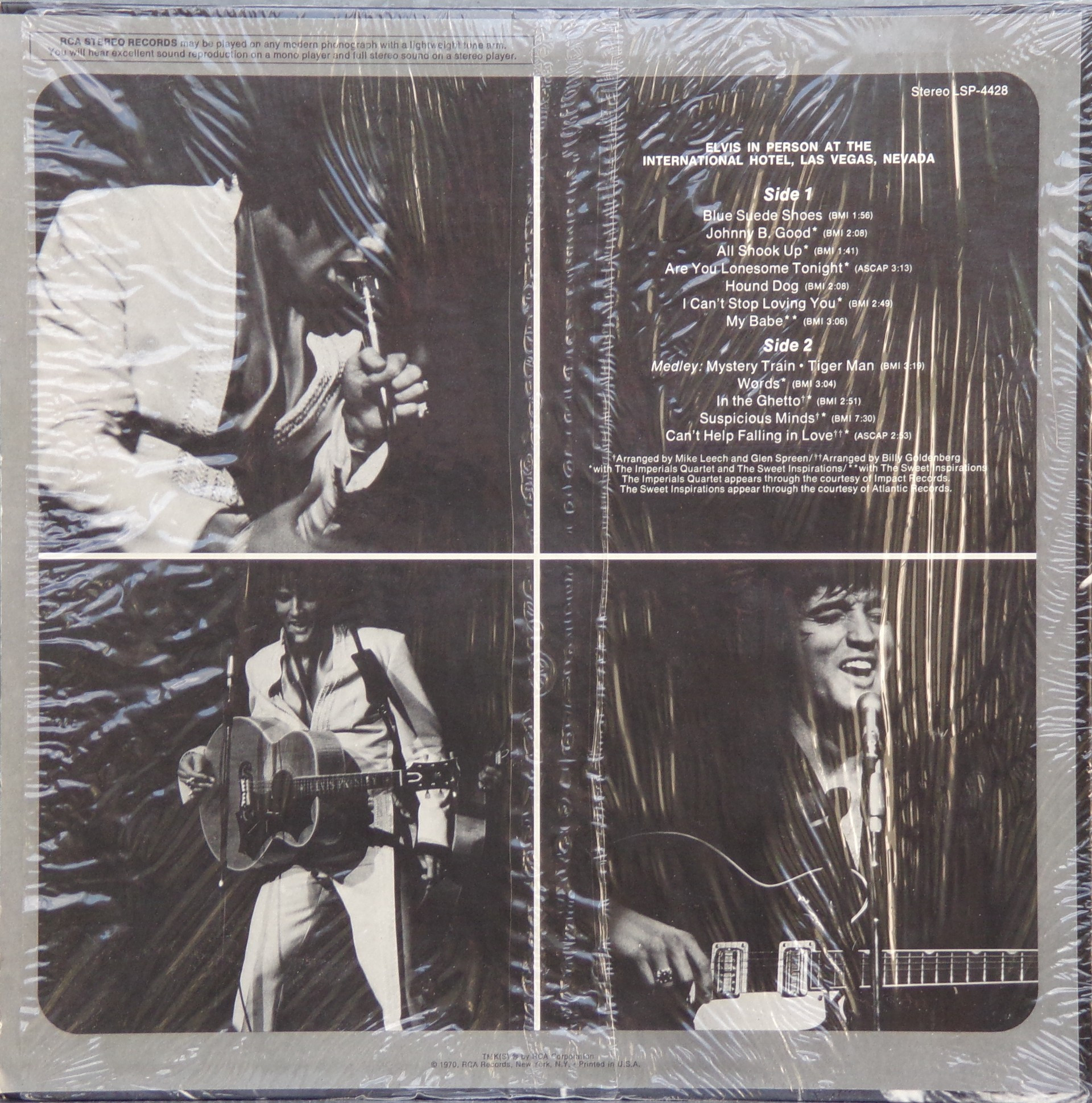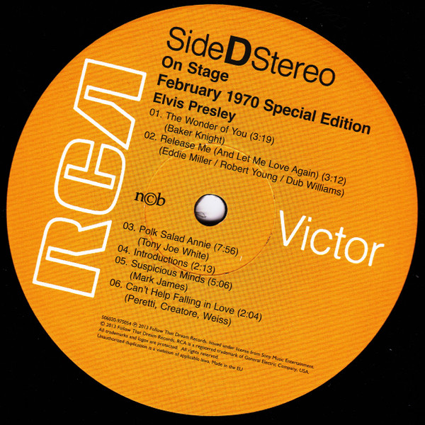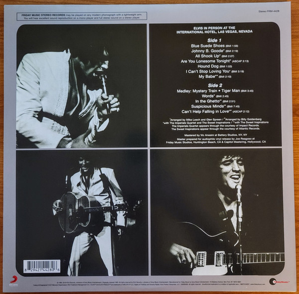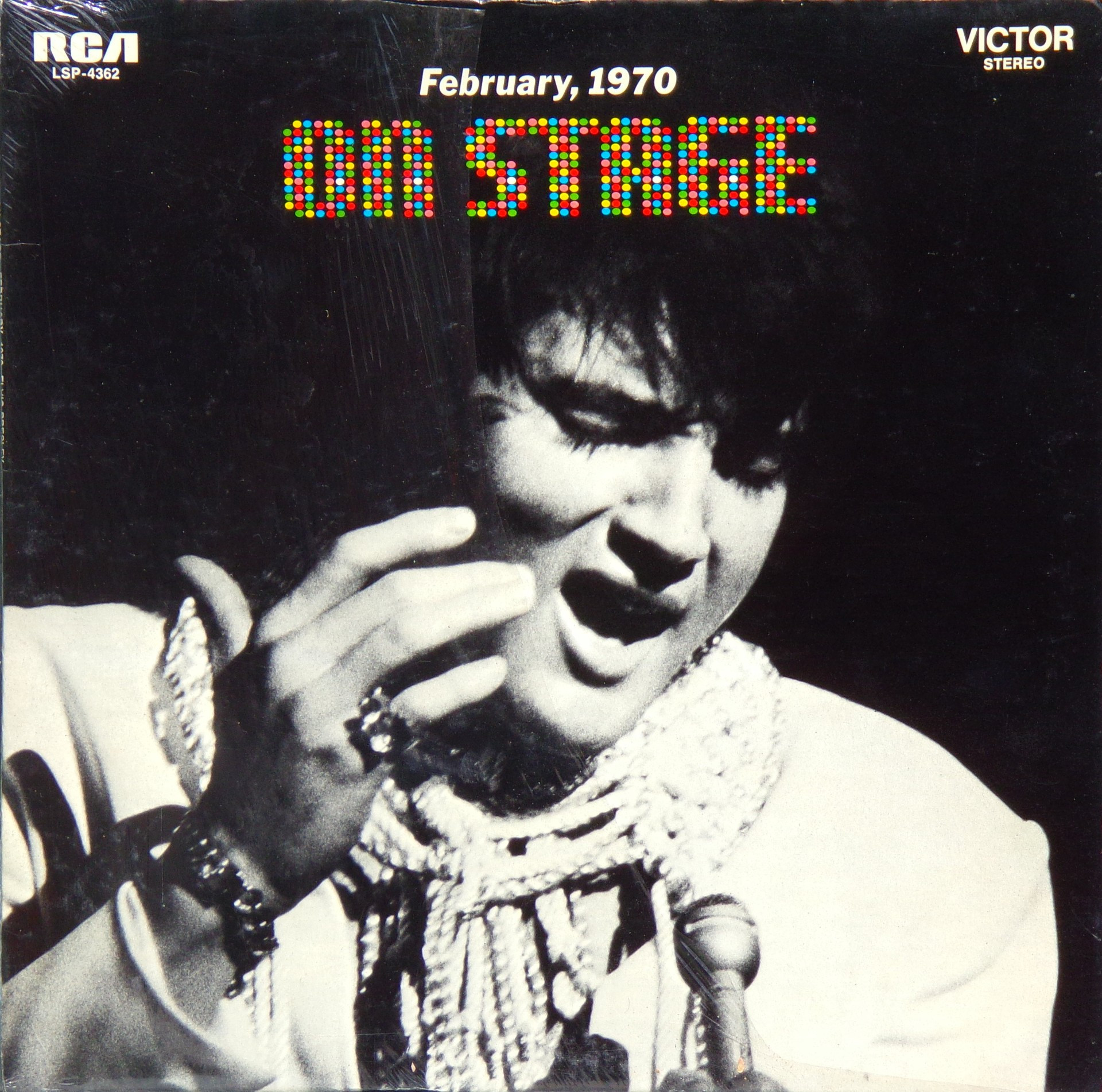 International Hotel, Las Vegas, August 25, 1969 DS On Stage is an Elvis Presley live album recorded between February 17 and 19, 1970 at the International Hotel, Paradise, Nevada. Released on RCA Records LSP-4362.It features the world-wide #1 single "The Wonder of You", which topped both the United States AC tracks chart and the British music chart. It was an immediate follow up to From Memphis to Vegas/From Vegas to Memphis, which also featured live recordings. Unlike the previous release, however, this album focused on songs that were not, at the time, associated with Elvis. This album was released in June 1970 and peaked on the chart in July 1970. It was certified Gold on 2/23/1971 and Platinum on 7/15/1999 by the RIAA. Other selections include "See See Rider", Paul McCartney's "Yesterday", Tony Joe White's "Polk Salad Annie", Del Shannon's "Runaway", and a version of "Let It Be Me". "See See Rider" would go on to become Elvis' frequent introductory number at his concerts, while "Polk Salad Annie" also became a regular part of his repertoire. The album is notable for not showing Elvis' name anywhere on the cover. The album has remained in print since its release date and has sold more than ten million copies globally. On January 8, 2010 it was announced that a Legacy Edition would be released, to follow the Legacy Edition release of "From Elvis In Memphis", in the spring of 2010. Details : Front Cover : Photo of Elvis. Title on top. Catalogue