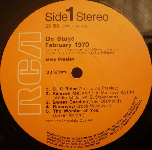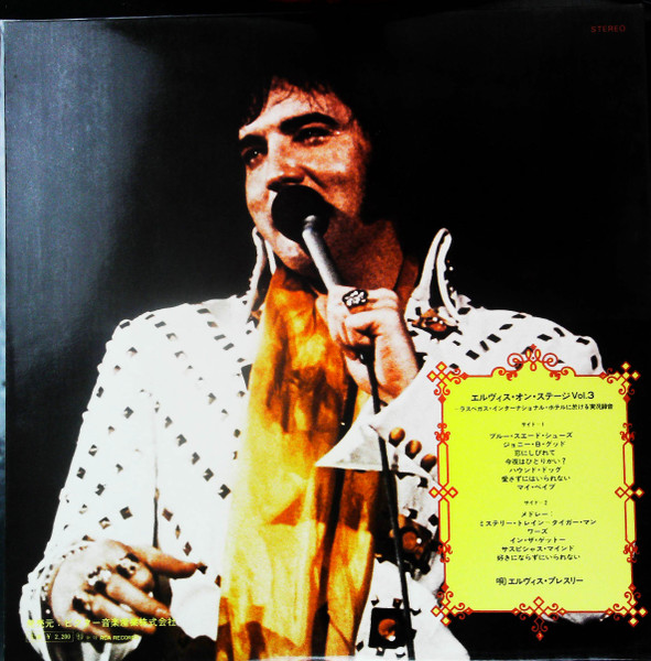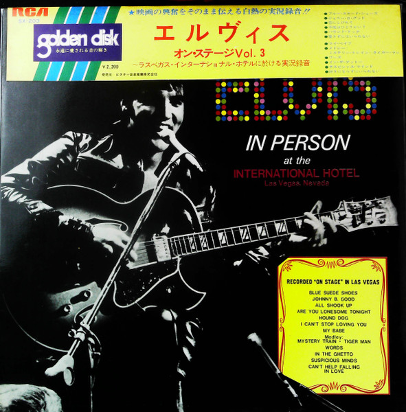 | Label: RCA – SX-201 Series: Golden Disk Format: Vinyl, LP, Album, Reissue, Box Country: Japan Released: Oct 1972 Manufactured By – Victor Musical Industries, Inc. Later Japanese pressing packaged in a box with obi and 6-page booklet containing Japanese liner notes and lyrics in English. Japanese title is "Elvis On Stage Vol. 1" and it appears on the obi, the spine of the box and both labels. Matrix / Runout (Runout - Side A - stamped): JS Ⓑ ZPRS 1867