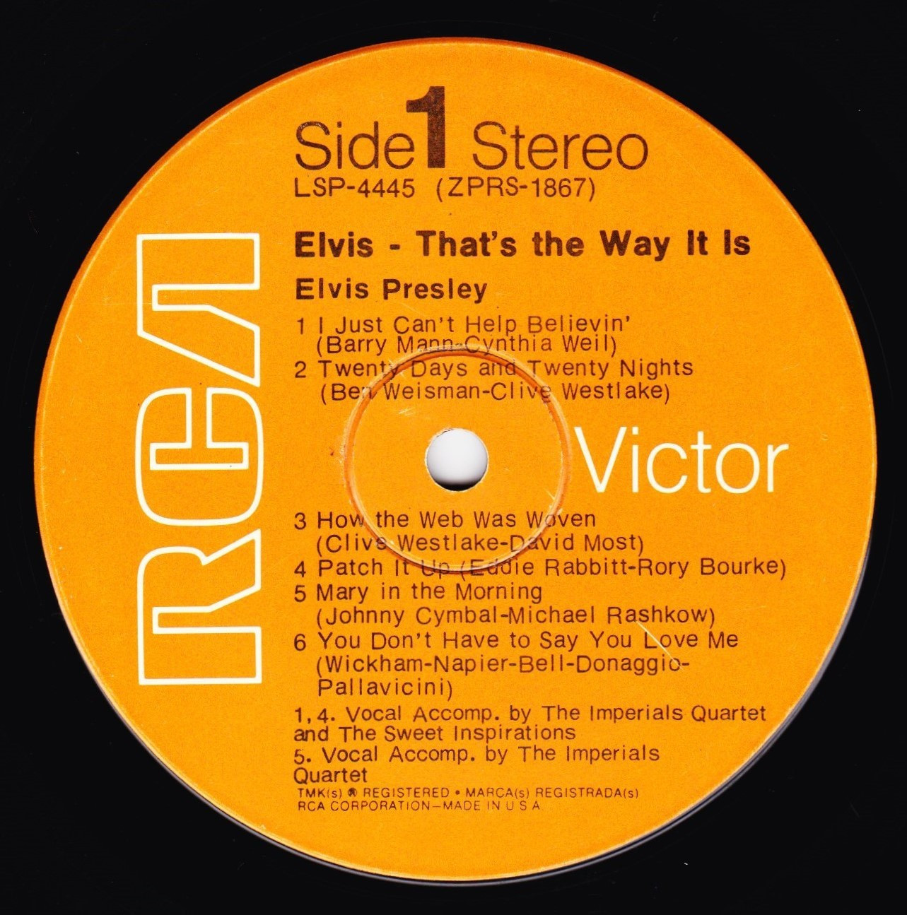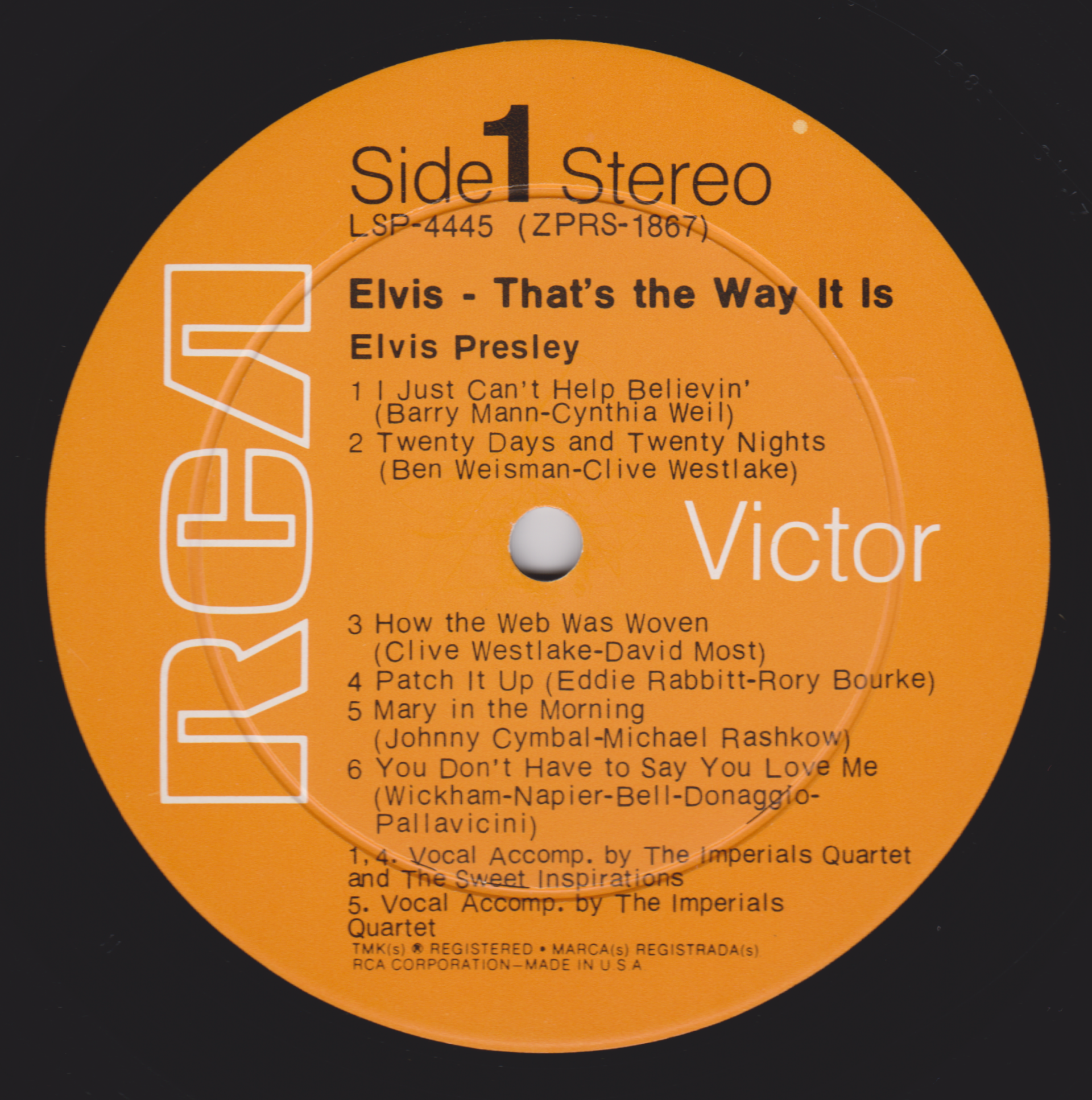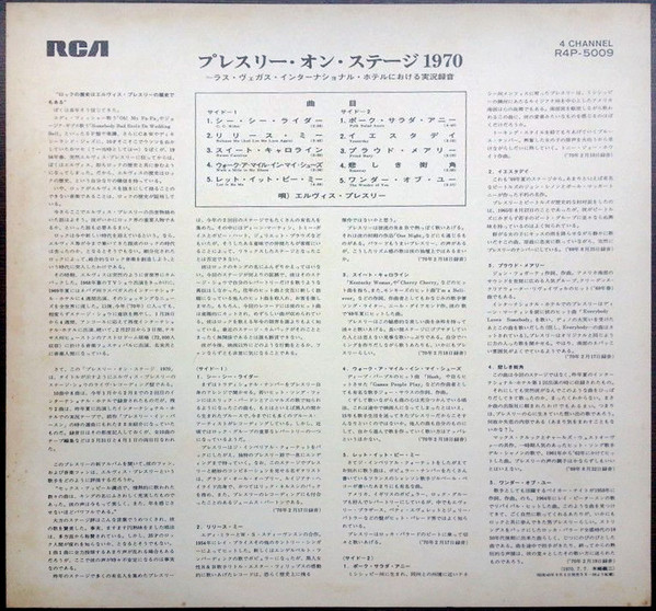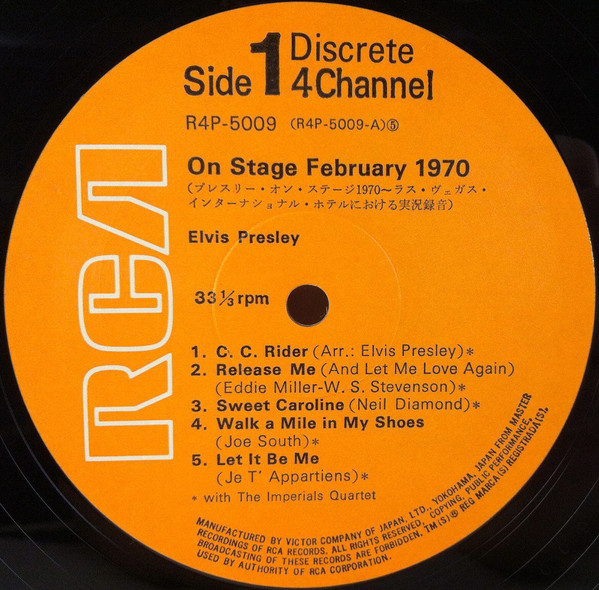 Label: RCA – R4P-5009 Manufactured By – Victor Company Of Japan, Ltd. Accompanied By – The Imperials Quartet* (tracks: A1-A5, B2-B5) Includes 12x12 lyric insert. One side in English (lyrics), One side in Japanese (liner notes.) Japanese QuadraDisc CD-4 4-Channel Discrete quadraphonic LP release. Back cover states "Manufactured by Victor Musical Industries, Inc." while the record labels read "Manufactured by Victor Company of Japan" Ltd." Matrix / Runout (Side A Label): R4P-5009-A |