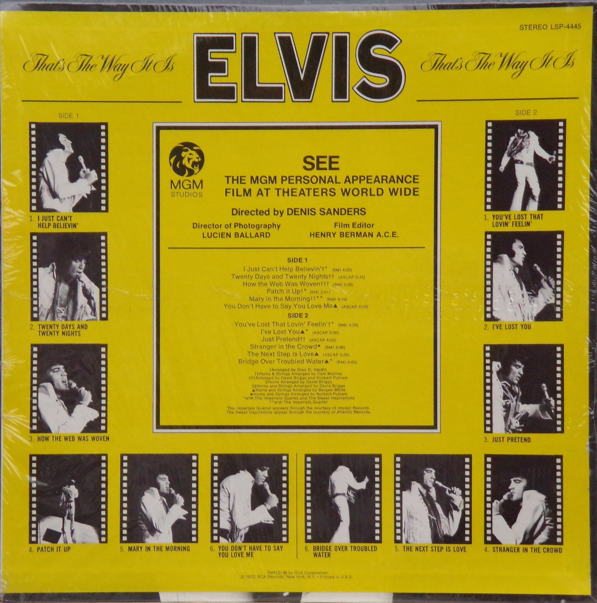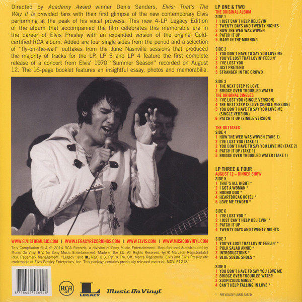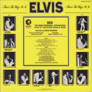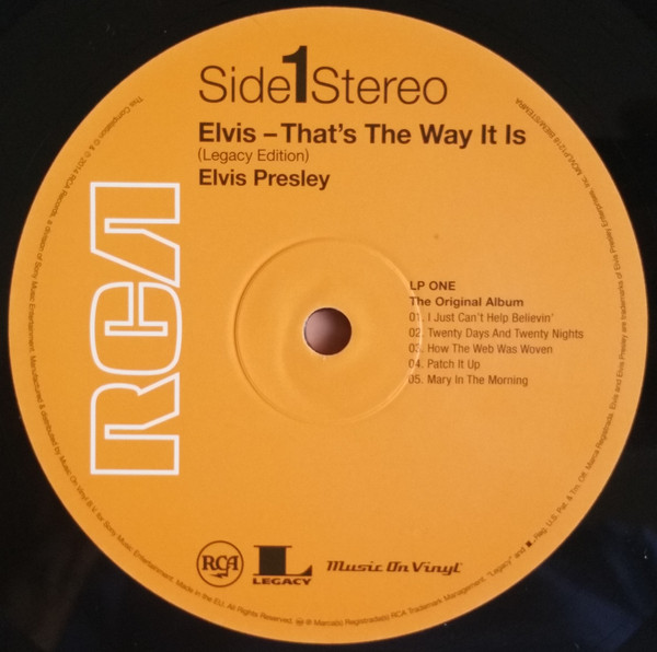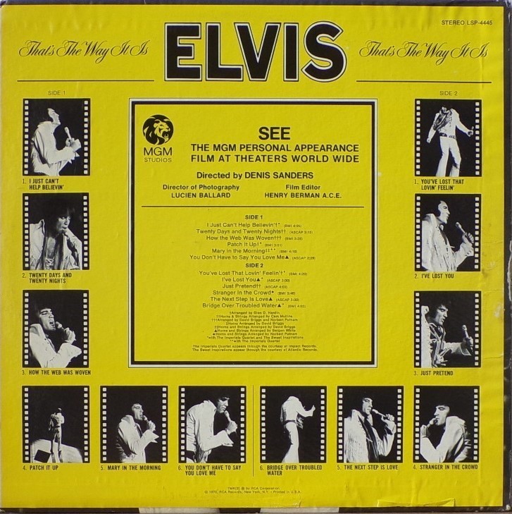 Recorded: RCA Studio B, Nashville, June 4, 1970 Brief History : Elvis: That's the Way It Is is the 40th album by Elvis Presley, released on RCA Records, LSP 4445, in November 1970. It consists of eight studio tracks recorded at RCA Studio B in Nashville, and four live in-concert tracks recorded at The International Hotel in Las Vegas. It accompanied the theatrical release of the documentary film of the same name (although it is not generally considered a soundtrack album), and peaked at #21 on the Billboard 200. It was certified gold on June 28, 1973 by the RIAA. The original vinyl LP consisted of eight tracks recorded in the studio in Nashville at the marathon sessions in June 1970 that would also yield several singles and the Elvis Country album, and four tracks from his August 1970 engagement at The International Hotel in Las Vegas. The track "You Don't Have to Say You Love Me" had been released as the advance single on October 6; its b-side "Patch It Up" appears in a live version here. "The Next Step Is Love" had previously been released as a b-side in July 1970, and its A-side "I've Lost You" appears in a live version here as well. The concert version of "I Just Can't Help Believin'" from this album would be released as a single in the United Kingdom in November 1971 and go to #6 on their charts; its b-side "How the Web Was Woven" was also taken from this album. A rehearsal version of the latter song was featured in the 1970 documentary Elvis: That's the Way It Is. Details : 1970 Release |