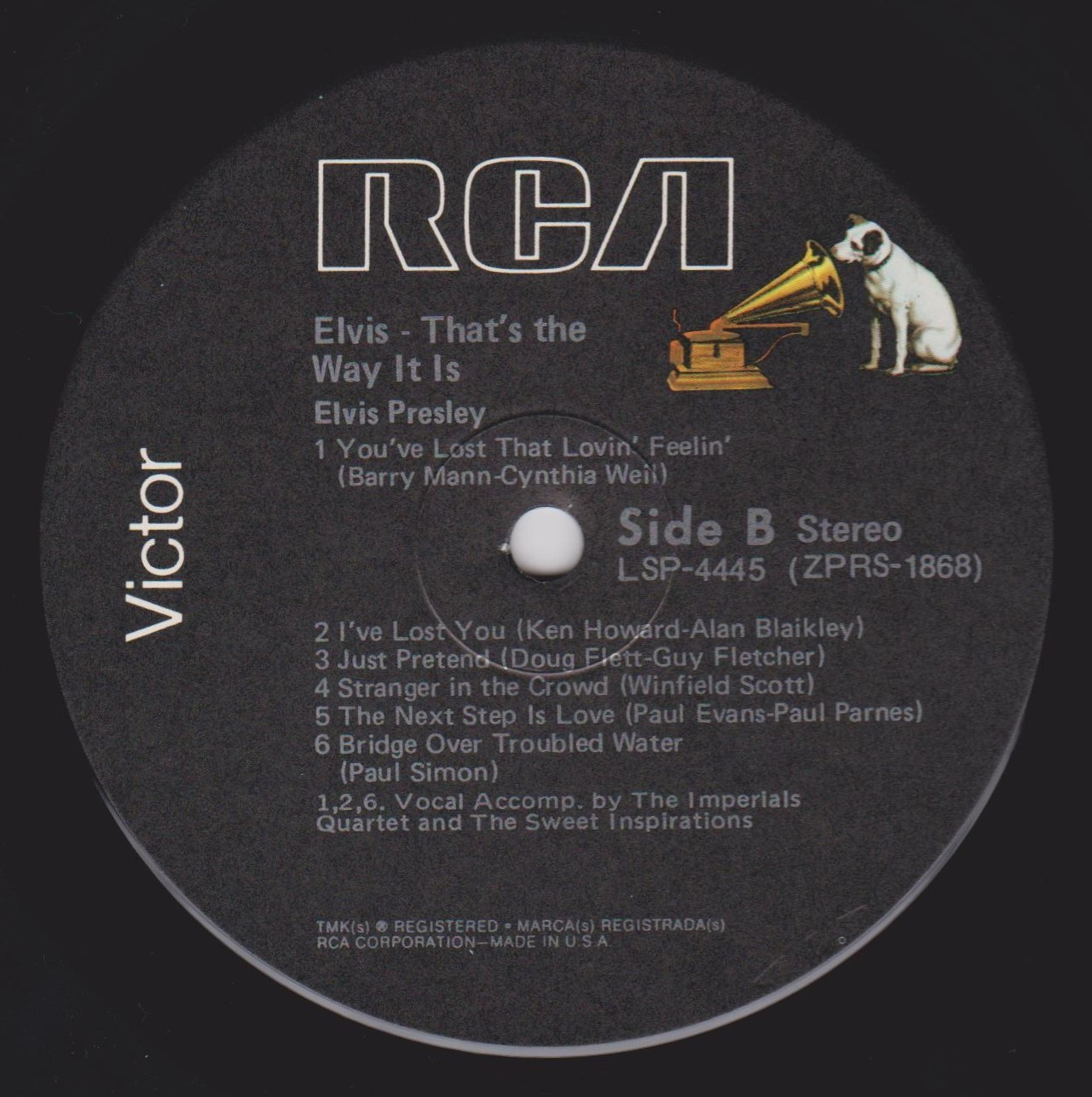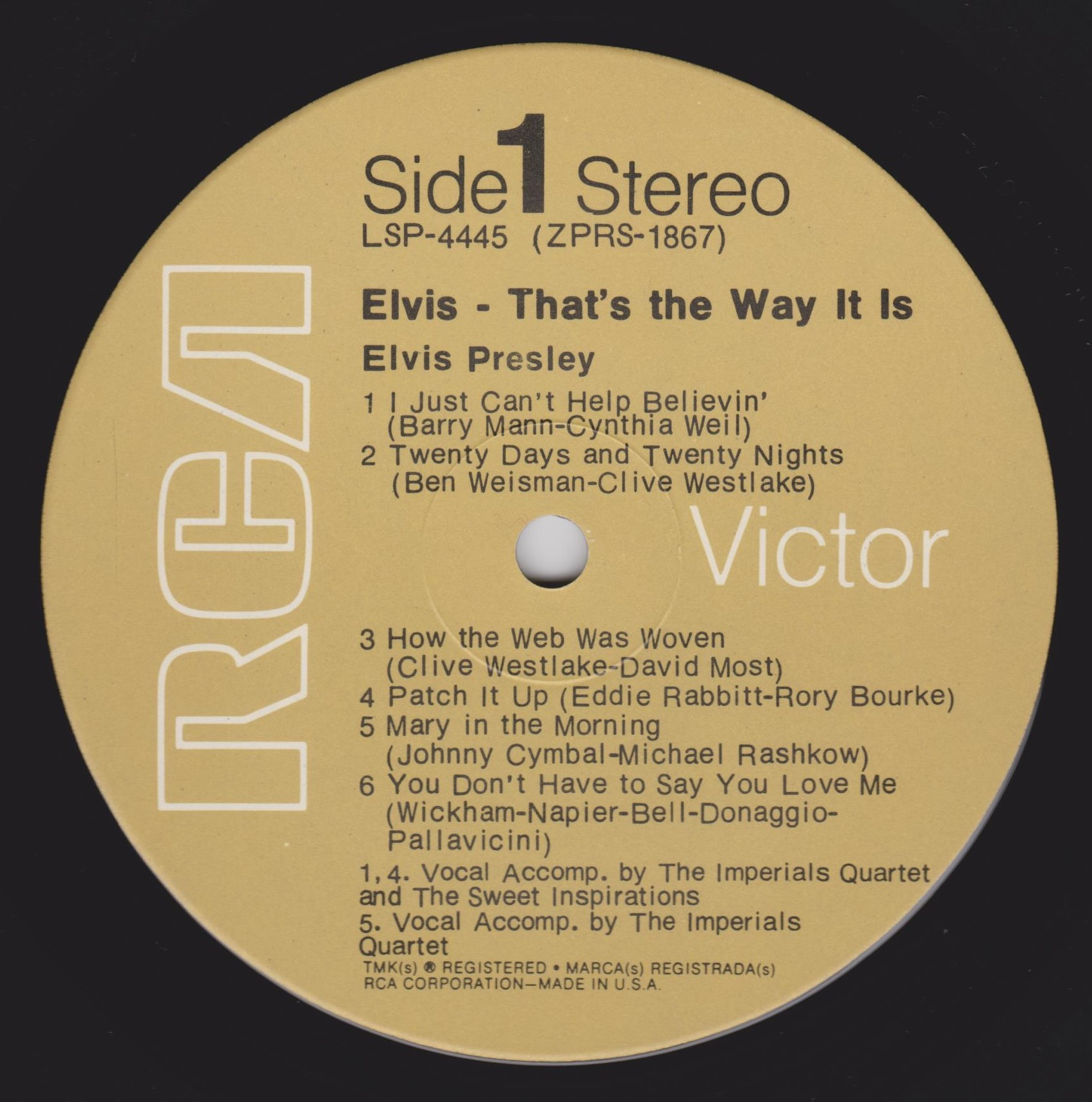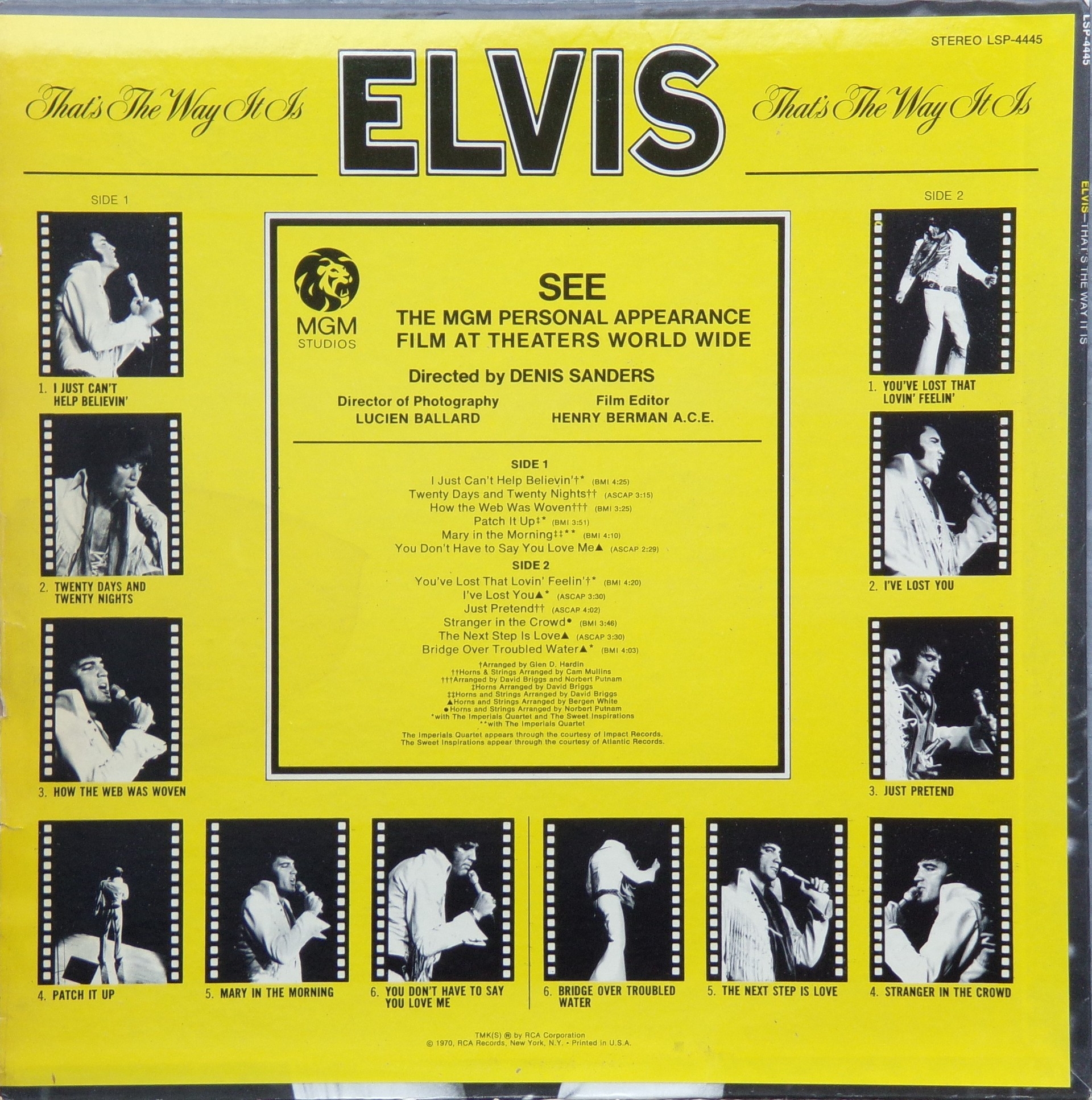 - THAT'S THE WAY IT IS (LP) (US) RCA LSP 4445 Released: November 1970 Side 1 I Just Can't Help Believin' **** Twenty Days and Twenty Nights * How The Web Was Woven ** Patch It Up ***** Mary In The Morning ** You Don't Have To Say You Love Me Side 2 You've Lost That Lovin' Feelin' ****** I've Lost You **** Just Pretend *** Stranger In The Crowd ** Next Step Is Love Bridge Over Troubled Water ** *