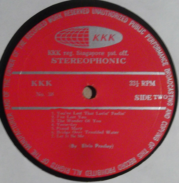 | Label: KKK (2) – No. 38 Format: Vinyl, LP, Album, Unofficial Release Country: Singapore Released: 1970 While the cover of this record seeks to pass it off as a legitimate version of RCA-Victor LSP-4445 - even down to claiming "Printed in U.S.A." on the back - it is in fact an unofficial release (or "pirate" record as they were known in Southeast Asia). The KKK record label was never registered at the Singapore Patent Office as claimed, since no such label officially existed. The pirates even had the nerve to print "unauthorised...copying of this record prohibited" around the edge of the label when that is exactly what they were doing ! Note that all titles are as shown on the labels (there are some minor differences to the list of titles printed in the centre of the back cover. The title sequence varies from that on the original release, and includes some extra titles and tracks. Strangely, the back cover also lists the original titles in the correct sequence ( showing 6 tracks each side when the record actually has seven). Finally, the catalogue number of this release was also assigned to another completely different record on the KKK label ("Let It Be" by the Beatles). |