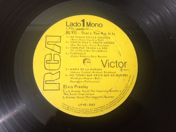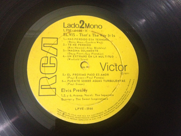 | Label: RCA Victor – LPM-4445-X Format: Vinyl, LP, Album, Promo, Mono, Yellow label Country: Chile Released: 1971 Phonographic Copyright – RCA S.A. Electrónica Promo edition, yellow labels and back cover. There's also a variation of this one with white labels and back cover. Matrix / Runout (Side A): LPVE-5943 |