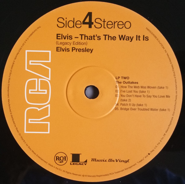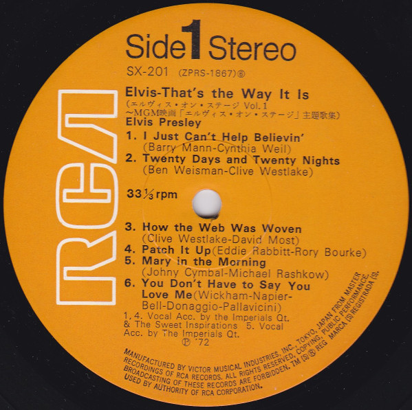 Label: RCA – SX-58 Manufactured By – Victor Company Of Japan, Ltd. Backing Vocals – The Imperials Quartet* (tracks: A1 to A5, B2 to B5) Second Japanese edition with obi, laminated gatefold sleeve and bound-in booklet with lyrics in Japanese & English. Orange RCA labels. The obi text makes reference to the MGM film, That's The Way It Is, which came out after this album. Pressed on translucent (see-thru) vinyl. Matrix / Runout (Label side A): ZPRS-1422 |