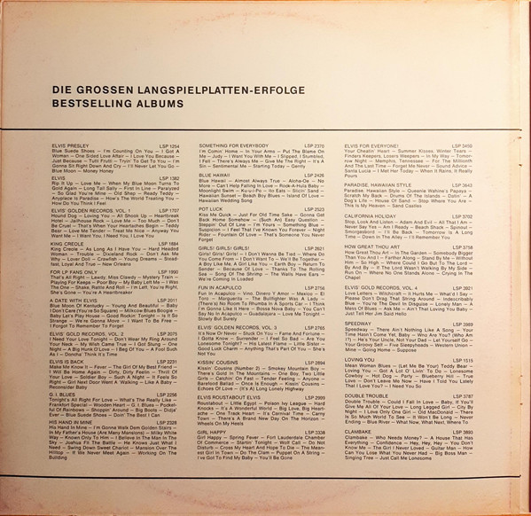 Label: RCA Victor – SRS 558 Side 1: Side 2: Record Company – Radio Corporation Of America Gatefold cover includes liner notes in German and English, a clipped double sided portrait and a presentation of 28 other Elvis releases (up to year 1968) in pictures and tracklists. "Manufactured by Teldec" on labels