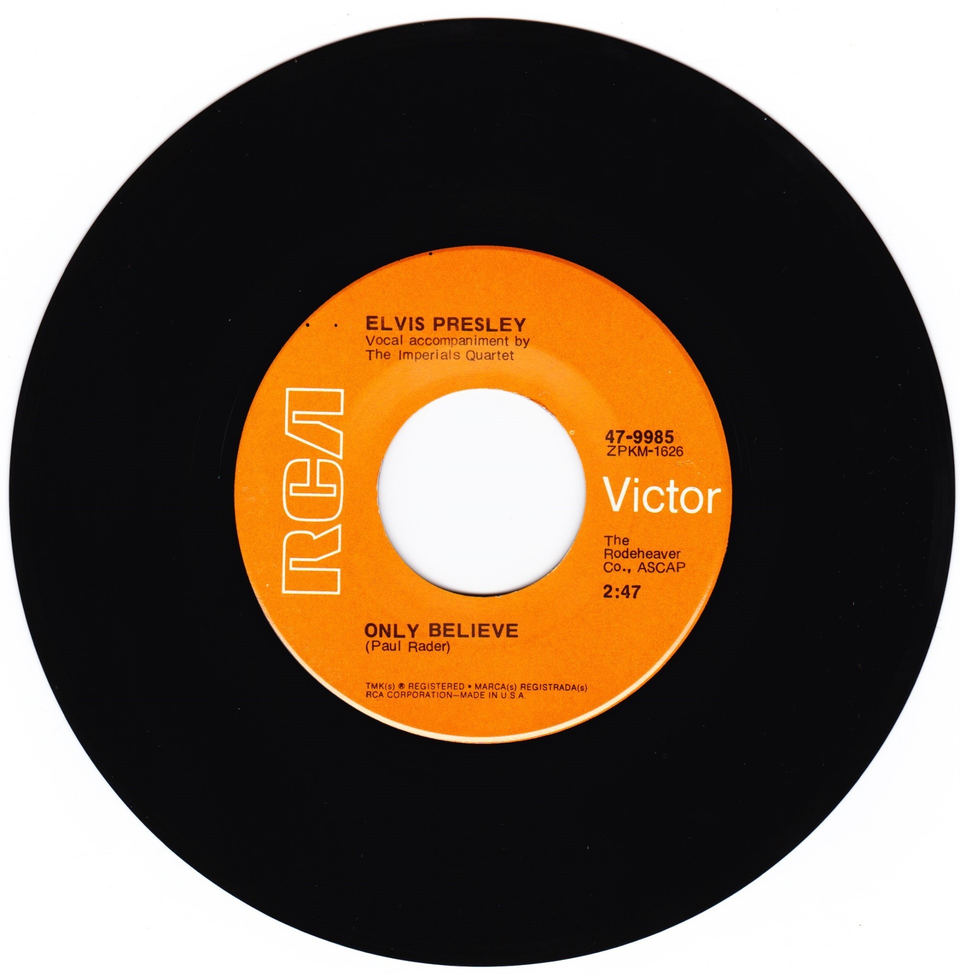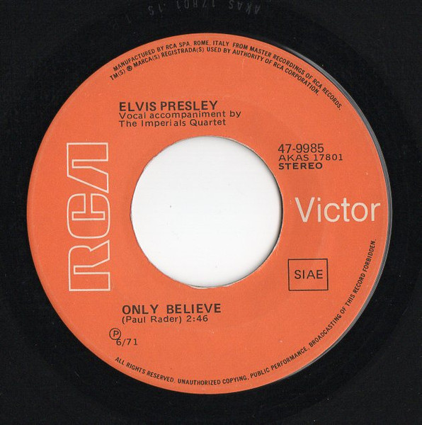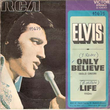 | Label: RCA Victor – 3-10640 Format: Vinyl, 7", 45 RPM, Single, Promo, Stereo Country: Spain Released: 1971 A: Only Believe = Solo Creer Manufactured By – RCA, S.A. White background label Promo. Spanish titles on front cover, back cover and labels Publishers Rights Society: SGAE |