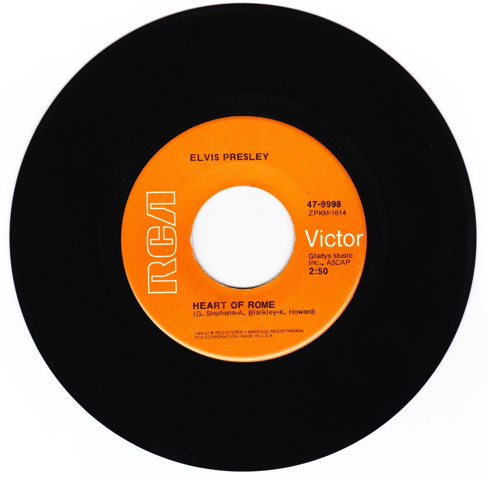 Title on top. Catalogue number top left. Rear Cover : Photo of Elvis in between song titles. Catalogue number top centre. Printed in U.S.A. bottom centre. Label : Orange. Non Flexible vinyl. Side 1 : Stereo at top. Side 2 : Stereo at top. Pressing Plant : Rockaway (Hand Etched) Matrix Number Side 1 : ZPRS - 1825 - 9S AIG (Hand Etched) Matrix Number Side 2 : ZPRS - 1826 - 7S A5A (Hand Etched) *NOTE* 7inch x5inch bonus photo enclosed with this release. Colour photo front & b&w photo rear. |