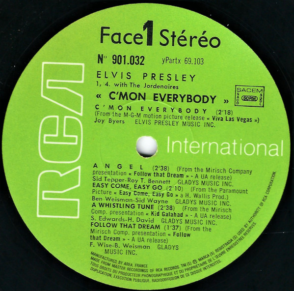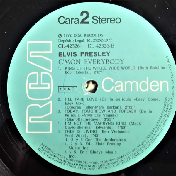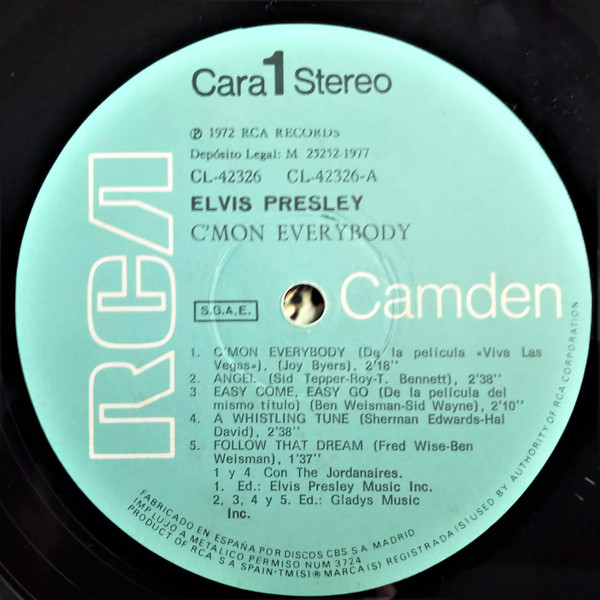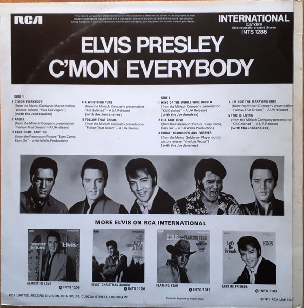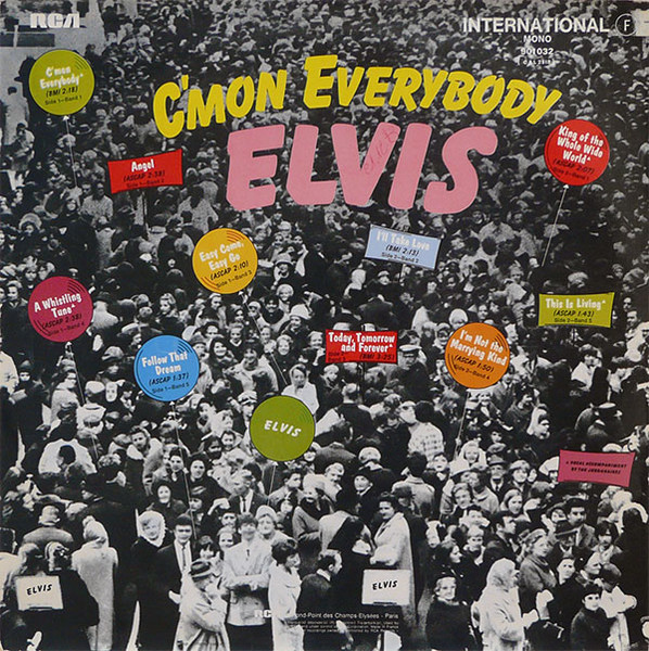 EVERYBODY (LP) Brief History : C'mon Everybody is a compilation album by Elvis Presley. The album was released in July 1971. All tracks from this album originated from four of Elvis's films and were only released on soundtrack EP's prior to this issue. The remaining EP tracks from the same four movies were compiled into another album, "I Got Lucky", released three months later. It was certified Gold on 1/6/2004 by the RIAA. Front Cover : Photo of Elvis. Title top right. Catalogue
