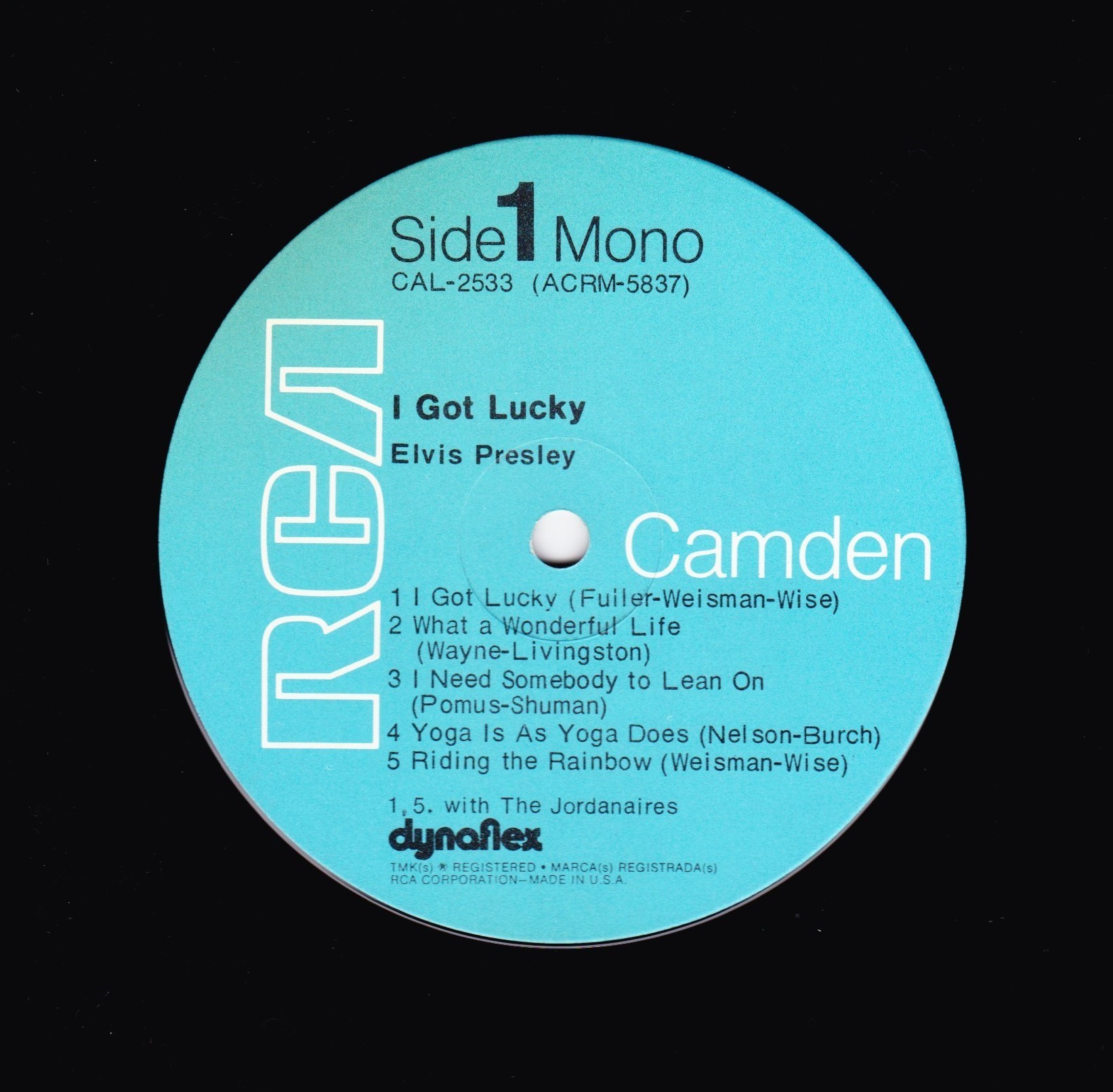 number top left. Camden top left. *NOTE* Rear cover number "2" bottom right. Copyright – RCA Records This is for an RCA Records Indianapolis pressing of the CAL-2533 catalog number. This release has the blue RCA Camden labels and a cover code "2" printed on the back bottom right corner of the cover. The first catalog number appears on the spine, front and back covers and labels. The second catalog number appears on the bottom left corner of the back cover. This release is very similar in label and cover composition (aside from the lack of a printed cover code) to Elvis Presley - I Got Lucky. Matrix / Runout (Side A label): ACRM-5837 |