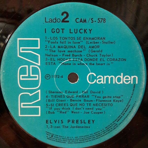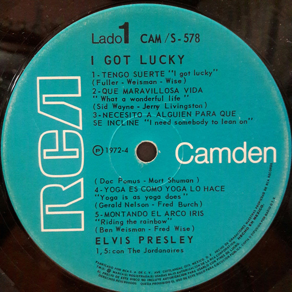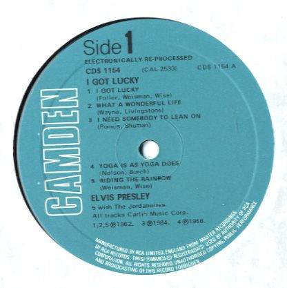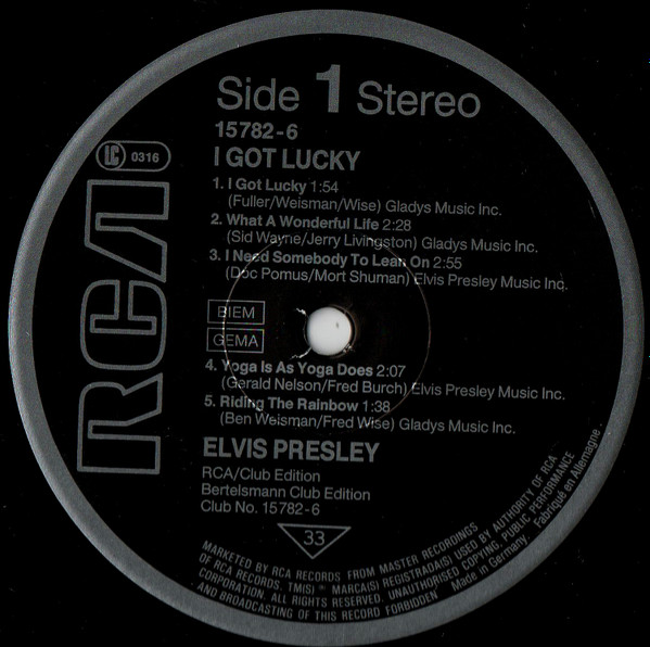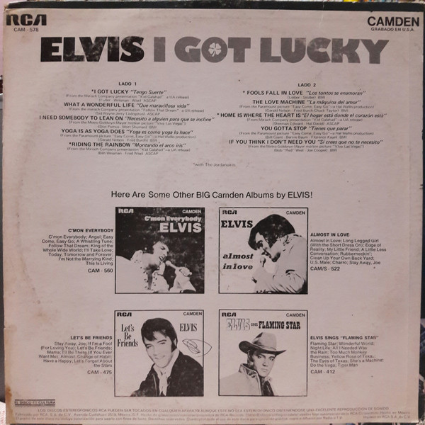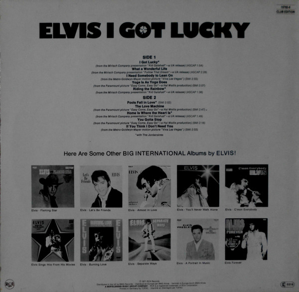 GOT LUCKY (LP) Brief History : I Got Lucky is a compilation album by Elvis Presley. The album, released in October 1971, is a follow-up to the "C'mon Everybody" album as it features the remaining tracks from the soundtrack EP's (previously unissued on LP) of the same four films from the first compilation plus one non-movie/non-LP track. It was certified Gold on 1/6/2004 and Platinum on 9/15/2011 by the RIAA. Front Cover : Photo of Elvis. Title top right. Catalogue