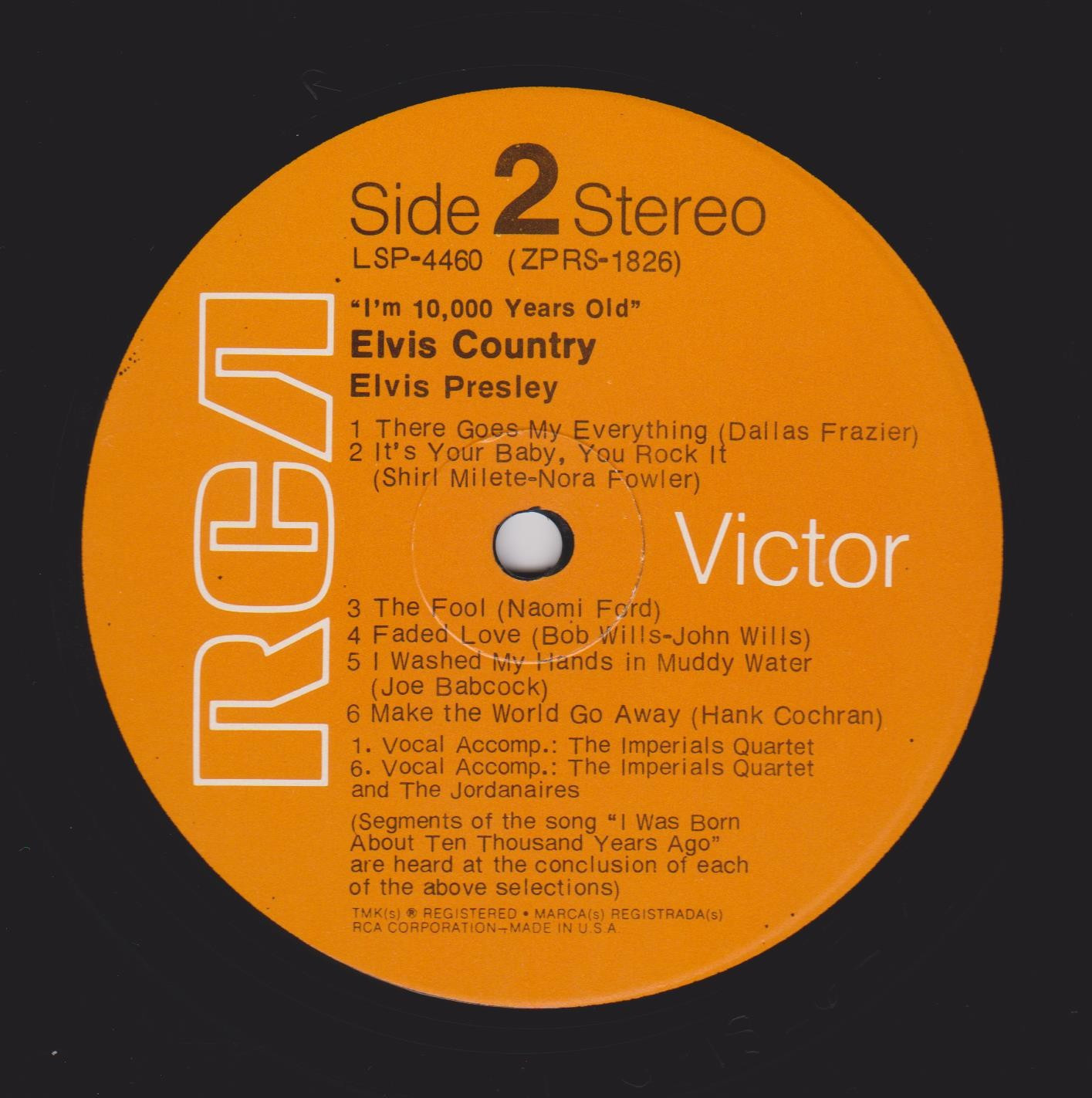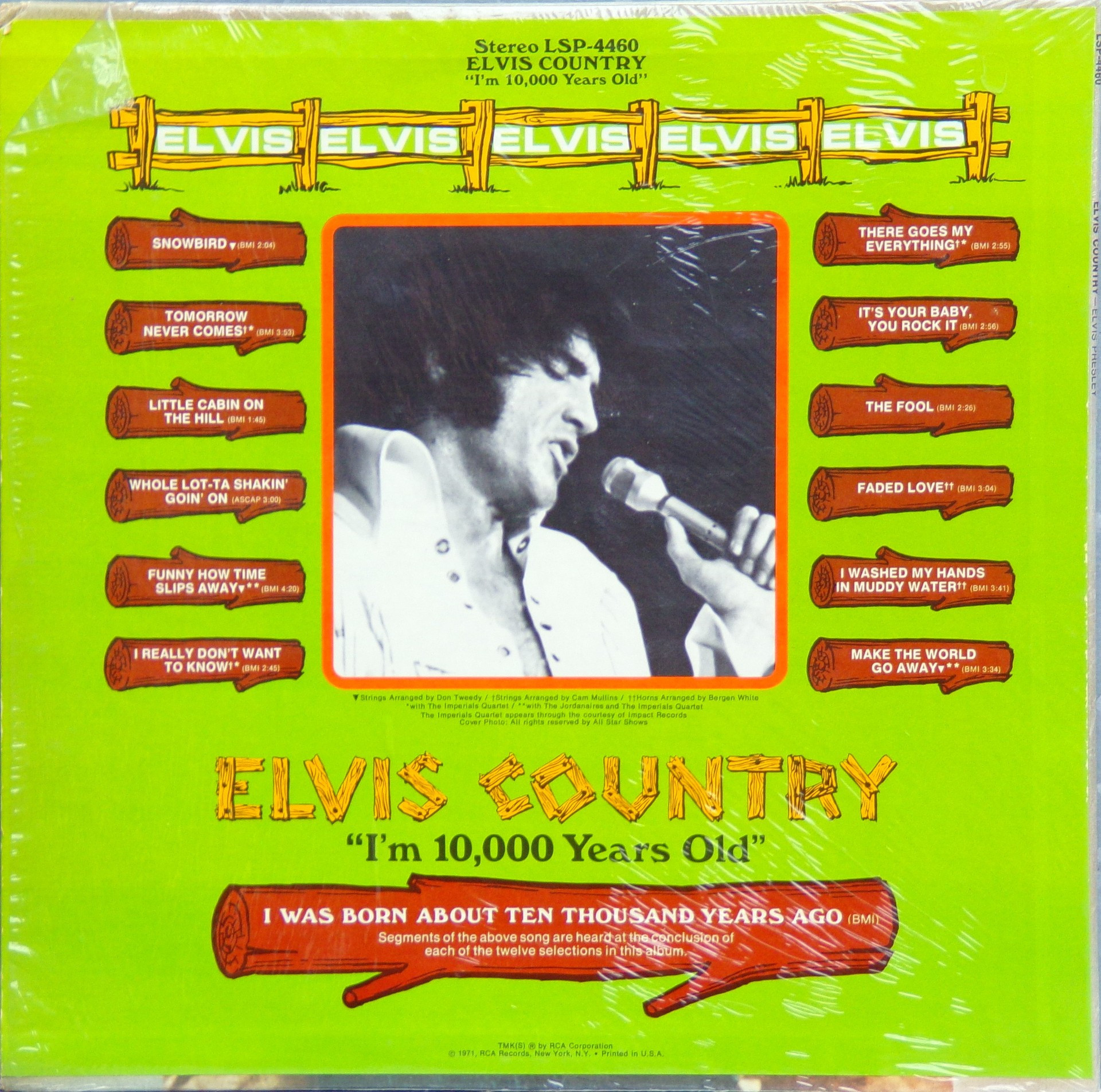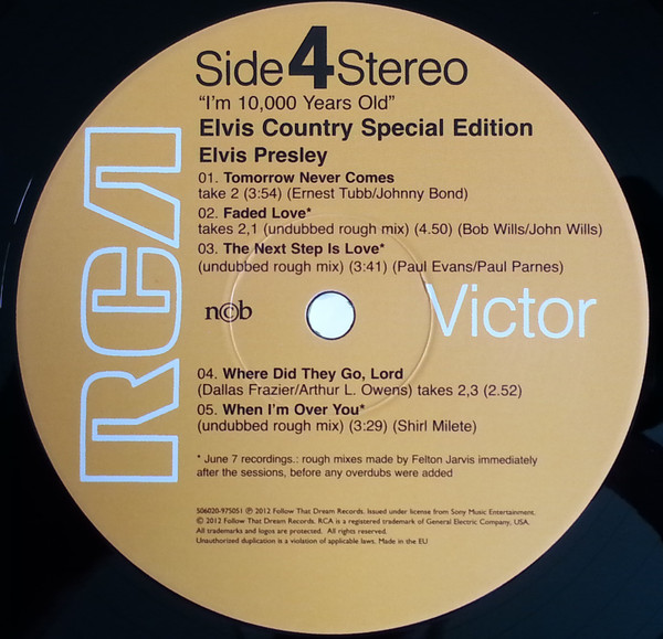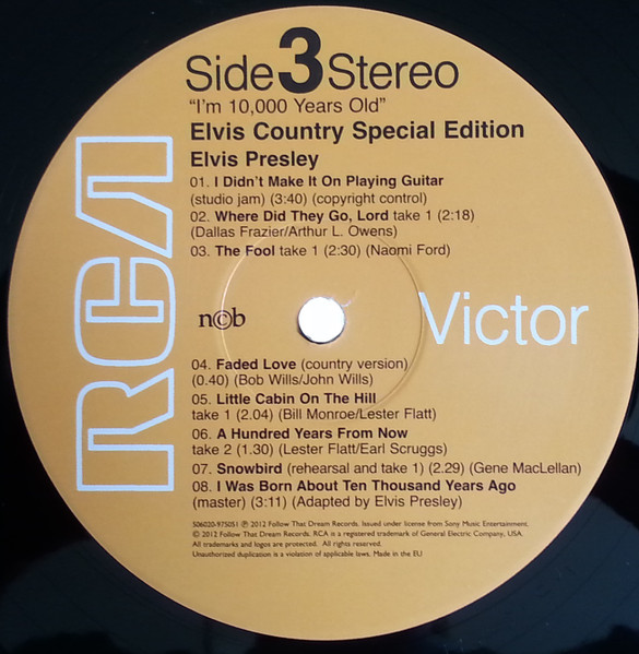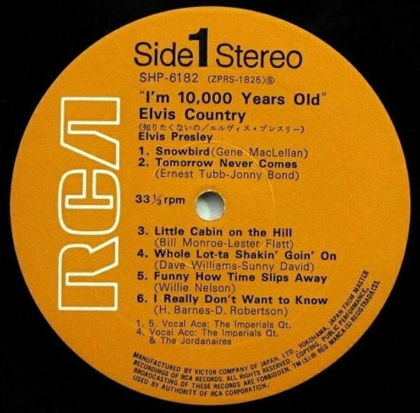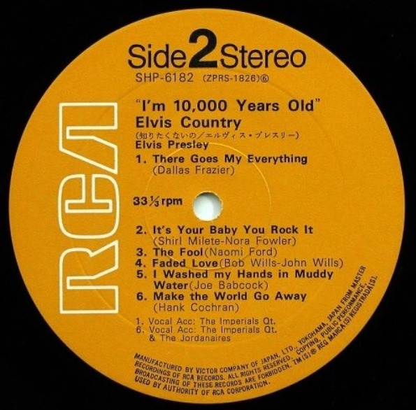 10,000 YEARS OLD, ELVIS COUNTRY (LP) (US) RCA LSP 4460 Released: January 7, 1971 Side 1 Snowbird **** Tomorrow Never Comes *** Little Cabin On The Hill * Whole Lotta Shakin' Goin' On **** Funny How Time Slips Away *** I Really Don't Want To Know Side 2 There Goes My Everything It's Your Baby, You Rock It ** Fool, The * Faded Love *** I Washed My Hands In Muddy Water *** Make The World Go Away *** * Recorded: RCA Studio B, Nashville,