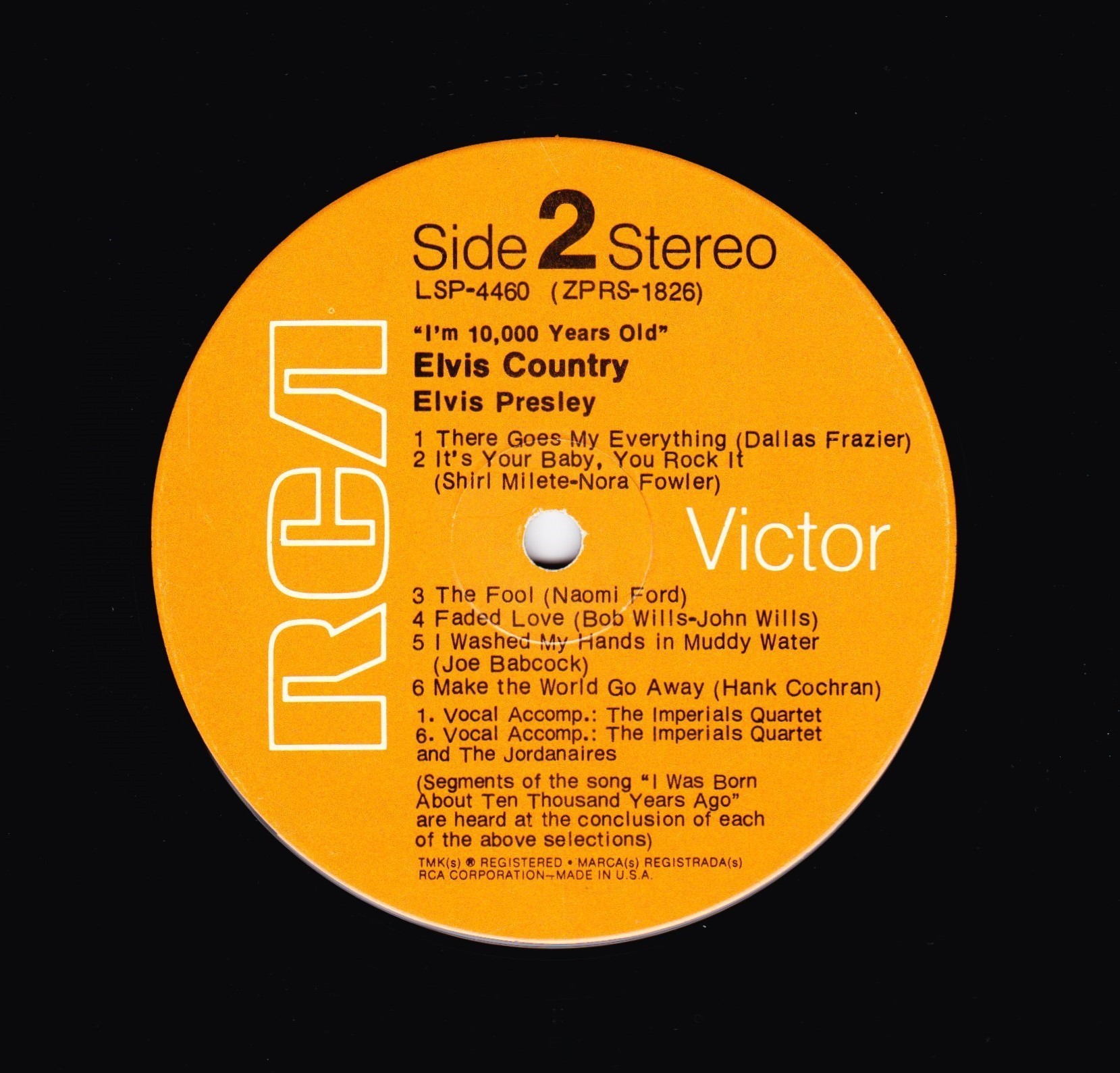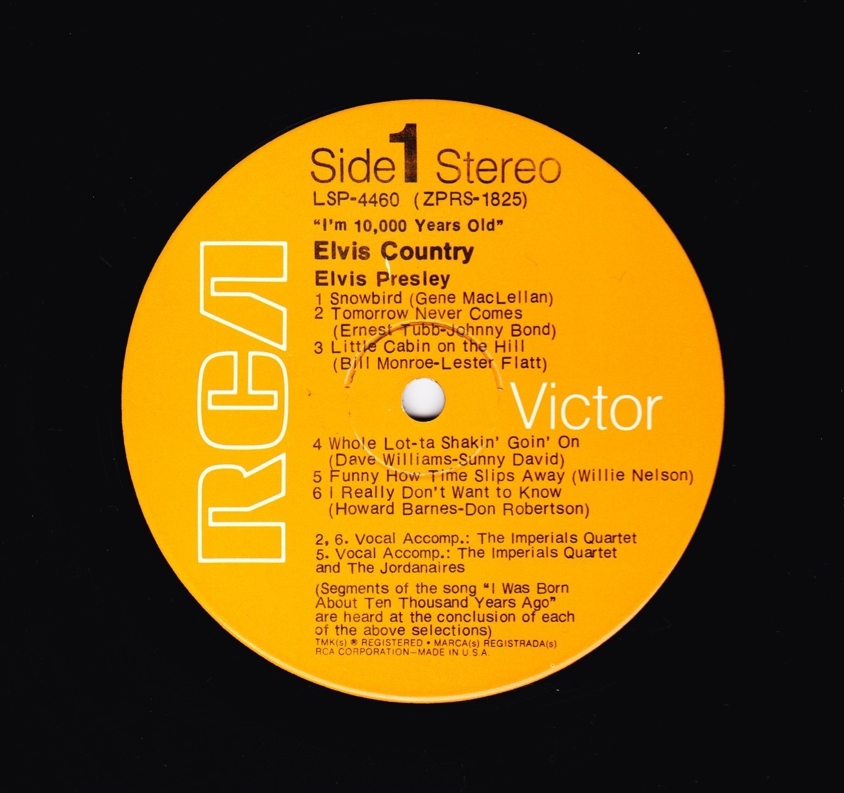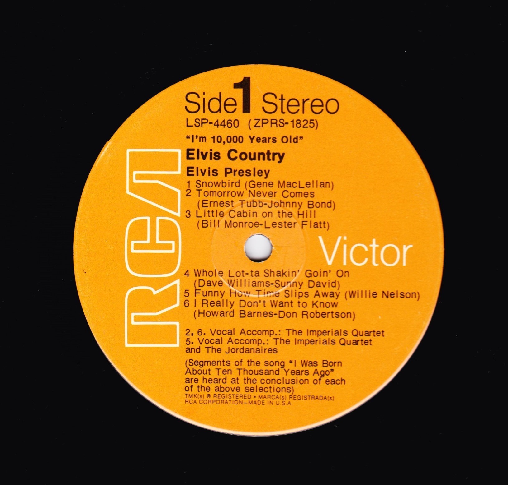 10,000 YEARS OLD, ELVIS COUNTRY (LP) (US) RCA LSP 4460 Released: January 7, 1971 Side 1 Snowbird **** Tomorrow Never Comes *** Little Cabin On The Hill * Whole Lotta Shakin' Goin' On **** Funny How Time Slips Away *** I Really Don't Want To Know Side 2 There Goes My Everything It's Your Baby, You Rock It ** Fool, The * Faded Love *** I Washed My Hands In Muddy Water *** Make The World Go Away *** * Recorded: RCA Studio B, Nashville,
