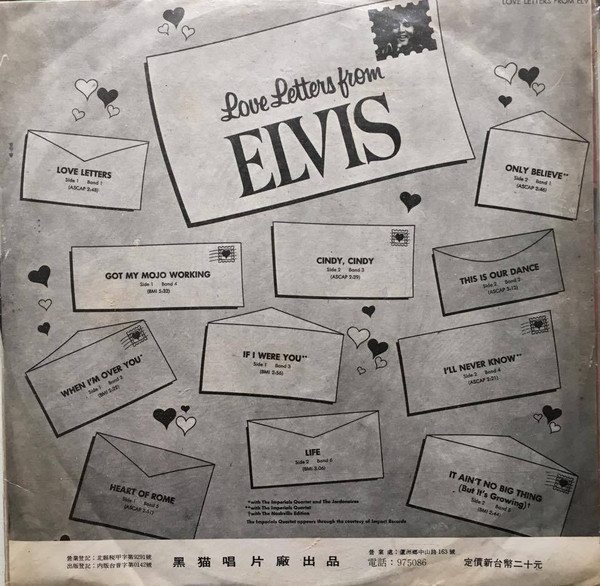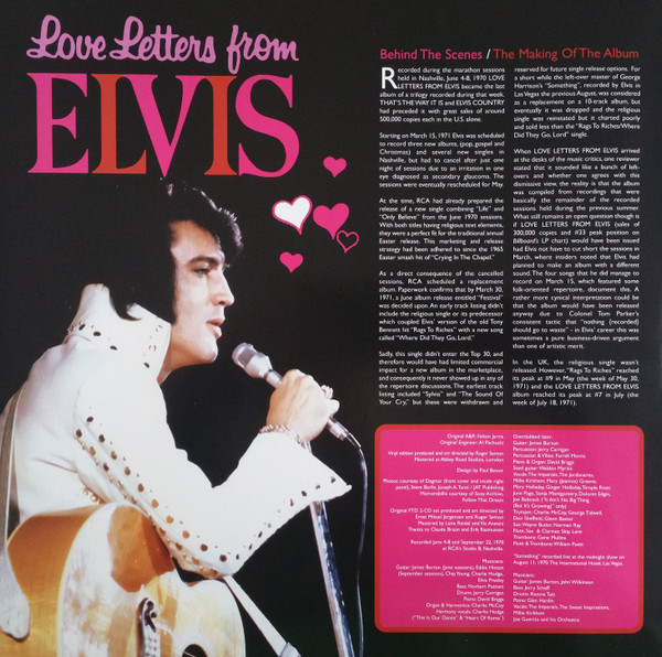 RCA Studio B, Nashville, June 4, 1970 Brief History : Love Letters from Elvis is a 1971 studio album by Elvis Presley. The album was made up of leftovers from Elvis' marathon June 1970 recording sessions in Nashville. Most of the other 35 songs recorded during those sessions had been used in Elvis' 1970 albums That's the Way It Is and Elvis Country (I'm 10,000 Years Old). Wanting to squeeze out a third album from the sessions, RCA records had producer Felton Jarvis mix, overdub and compile the remaining songs. However, few of the songs had the rock, country, or gospel feel that inspired Elvis to his greatest performances. As a result the album was critically panned upon release, and failed to crack the top 20 of the Billboard album charts. The song's title track was a rare instance of Presley re-recording a past hit in the studio, his original version of "Love Letters" having been released as a single in 1966. "Got My Mojo Working" is edited down from an impromptu jam session; Presley's version incorporates lyrics from "Hands Off", a 1955 song by Frankie Castro released on the Wing record label (RCA often mislabelled this song "Keep Your Hands Off of It" when the complete jam was issued on CD years later). Three songs from this album were released on singles. The single "Life / Only Believe" was released in March 1971 and reached only #53 on the US Billboard Singles chart. It was Elvis's lowest chart position for a single since "Almost in Love" had reached #95 in late 1968. "Heart Of Rome" was placed on the B-side of the non-album track "I'm Leavin'" released as a single in August 1971. Front Cover : 3 Photos of Elvis. Title top centre. Catalogue