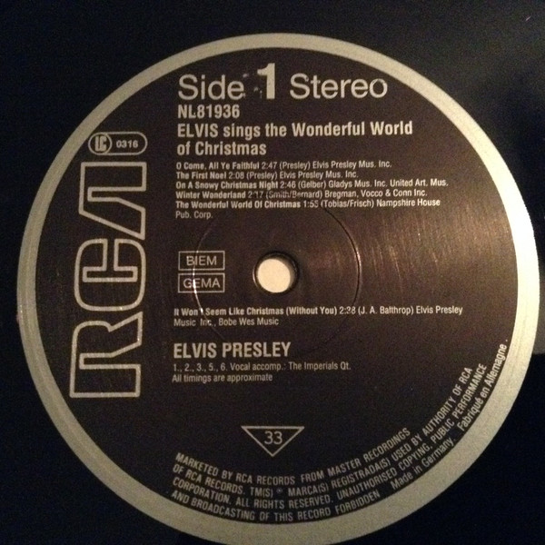 Nashville, May 15, 1971 Brief History : Elvis Sings The Wonderful World Of Christmas is a 1971 album by Elvis Presley, and Elvis' second and final Christmas album. The album was released in October 1971, followed by the single from the album "Merry Christmas Baby" / "O Come All Ye Faithful" released in November 1971. This album was a top seller and topped the Billboard Holiday Albums Chart, and would have charted high on the Billboard 200 but from 1963 to 73 Holiday albums were not allowed to chart. It did not have the commercial appeal of Elvis’ first Christmas album. Over the years, it has become a perennial favorite. It was certified Gold on 11/4/1977, Platinum on 12/1/1977, 2x Platinum on 5/20/1988 and 3x Platinum on 7/15/1999 by the RIAA. Several of the songs on the album were published by Elvis Presley's publishing company, such as "Holly Leaves And Christmas Trees", "I'll Be Home On Christmas Day", "If I Get Home On Christmas Day", and "On a Snowy Christmas Night". Orange Label Details : *NOTE* 7inch x 5inch postcard issued with this release. |