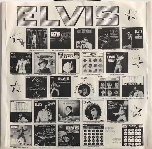 | Details : 1976 Front Cover : 3 Photos of Elvis. Title top centre. Catalogue number bottom right. Rear Cover : Catalogue number top right. Printed in U.S.A. bottom centre. Label : Tan. Dynaflex vinyl. Side 1 : Stereo at top. Side 2 : Stereo at top. Pressing Plant : Indianapolis Matrix Number Side 1 : APRS - 1392 - 31S A1 (Machine Stamped) W (Hand Etched) Matrix Number Side 2 : APRS - 1393 - 32S A1 (Machine Stamped) L (Hand Etched) *Note* Title on 3 lines. "RE" bottom left front cover. |