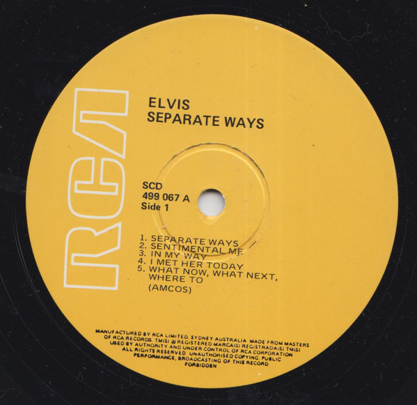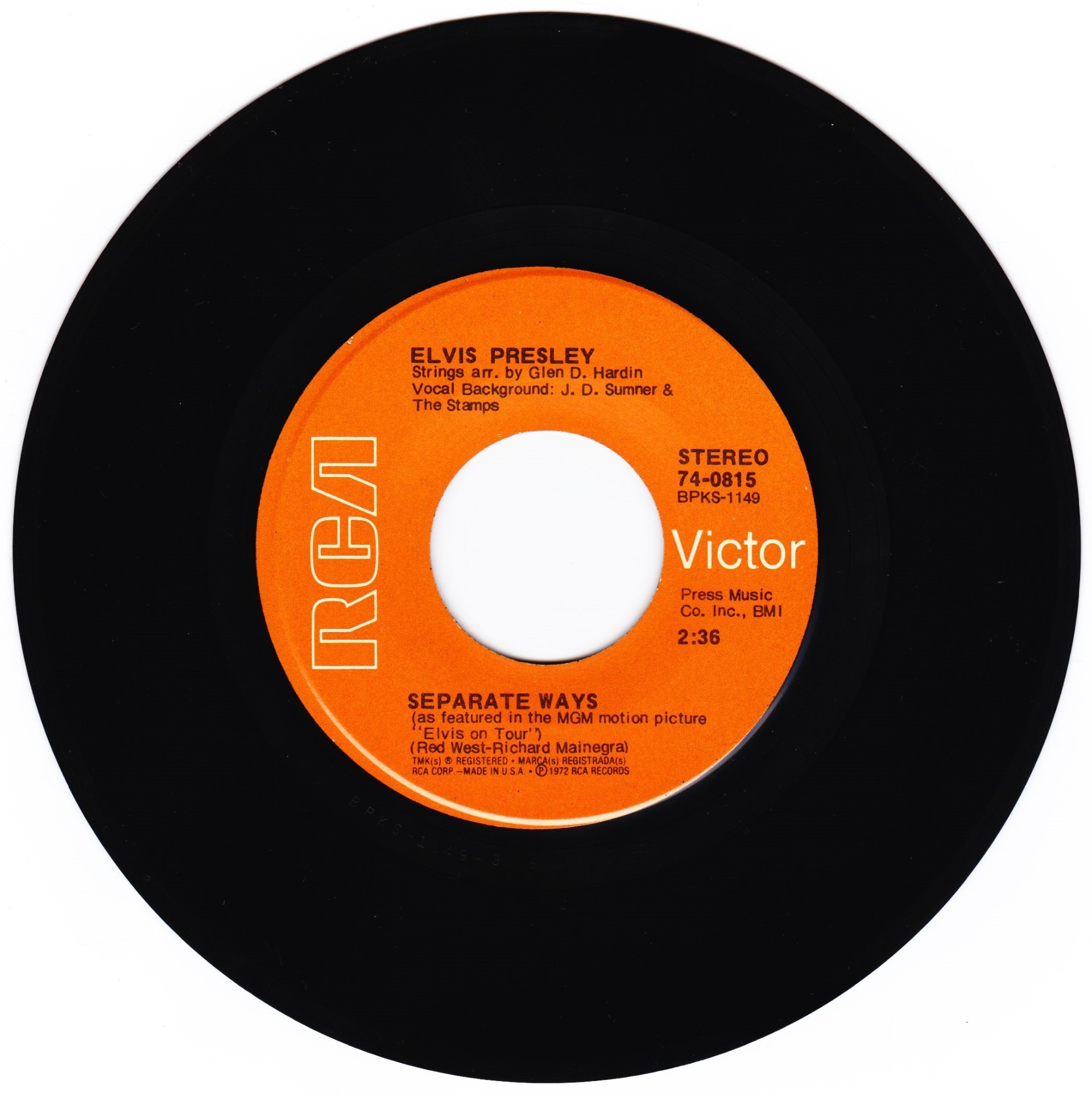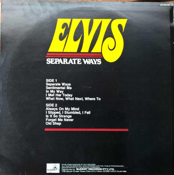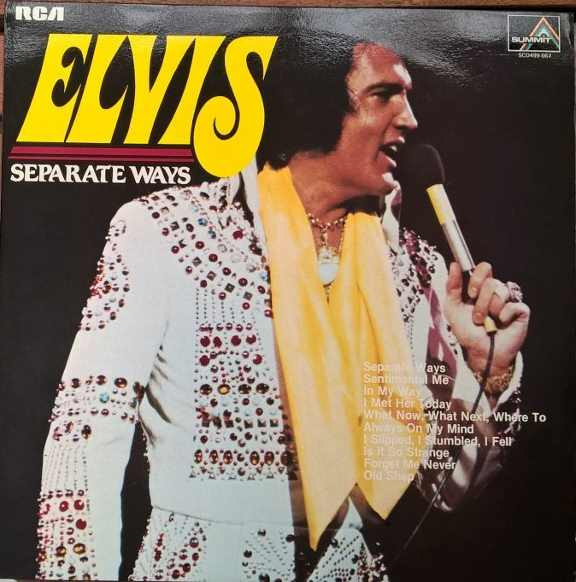 (LP) Brief History : Separate Ways is a compilation album by Elvis Presley from 1972. Released by RCA Records under its RCA-Camden subsidiary exactly one month after another compilation, Burning Love and Hits from His Movies, Volume 2, Separate Ways was the second and final attempt by RCA to repackage older Elvis recordings by pairing them with a recent hit single, in this case "Separate Ways" and its flipside "Always On My Mind". The remainder of the album -- which was not promoted as a compilation on the front cover -- consisted of a mixture of previously released recordings from Presley film soundtracks of the 1960s, plus one song, "Old Shep", dating back to 1956. The album was reissued by Pickwick/Camden utilizing the original catalogue number CAS-2611. The only apparent difference is the cover indicates Pickwick at the bottom center front, where as the original issue indicated RCA. The contents of the re-issue are exactly the same as the original issue. It just missed the top 10 of the Billboard charts on its release and has since gone on to sell over 3 million copies world-wide. It was certified Gold on 3/27/1992 and Platinum on 1/6/2004 by the RIAA. Front Cover : Photo of Elvis. Title top right. Catalogue number bottom