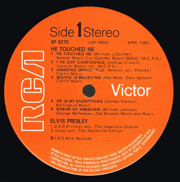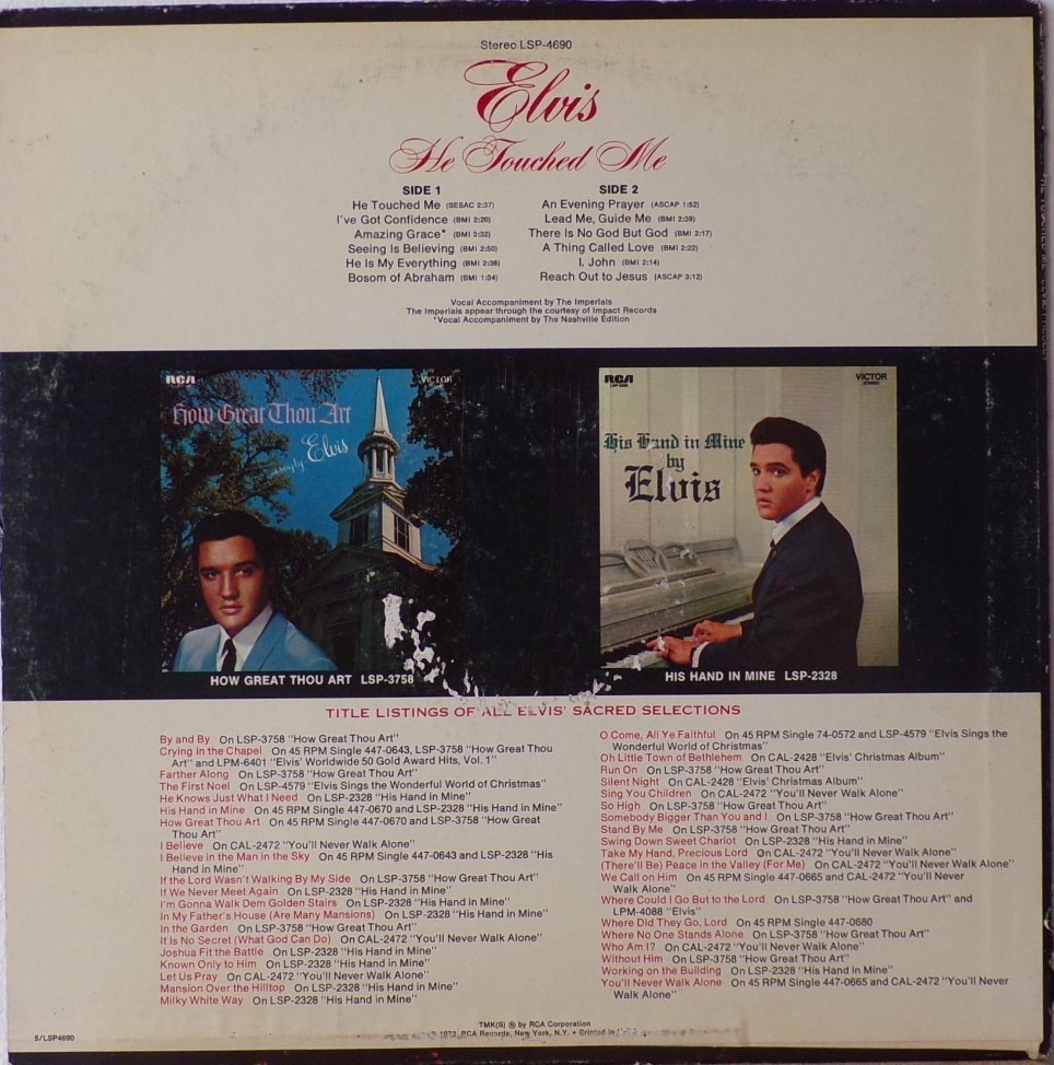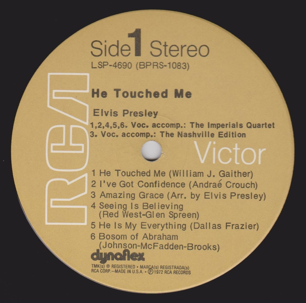 TOUCHED ME (LP) (US) RCA LSP 4690 Released: April 1972 Side 1 He Touched Me I've Got Confidence *** Amazing Grace * Seeing Is Believing **** He Is My Everything ****** Bosom Of Abraham Side 2 Evening Prayer *** Lead Me, Guide Me ** There Is No God But God ****** Thing Called Love **** I, John ****** Reach Out To Jesus ***** *