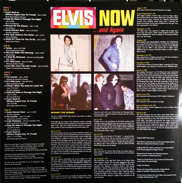 21, 1969 Brief History : Elvis Now is a gold-selling Elvis Presley album from 1972. Despite the "now" in the title, the tracks on this album were recorded anywhere from one to three years before its release. The Beatles' "Hey Jude" was a leftover from the legendary sessions at the American Studio in Memphis in early 1969 and, judging by its casual performance, not intended for an album release. Sylvia and I Was Born About Ten Thousand Years Ago were recorded during the Nashville "marathon" sessions of June 1970 (the latter had been released in fragmentary form on the Elvis Country album). The rest of the songs emanate from the more recent sessions held at RCA Studio B in Nashville in March, May, and June 1971. Unlike Elvis' other albums of that period (Elvis Country, He Touched Me and Elvis Sings the Wonderful World of Christmas, each dedicated to a particular genre) Elvis Now encompasses a variety of genres, including country, gospel, soul and pop. The only single from the album, "Until It's Time for You to Go / We Can Make The Morning" reached number 9 on the Adult Contemporary Chart in the US in March 1972 and number 5 on the UK Singles Chart in April 1972. The album was certified Gold on 3/27/1992 by the RIAA. In 2010 an extended version of the album was released as part of the FTD collector series. It consists of the original 1972 album and a number of bonus tracks, originating from the 1971 Nashville sessions: two non-album singles from 1971 (I’m Leavin’ and It’s Only Love), a b-side from the upcoming An American Trilogy single (First Time Ever I Saw Your Face) as well as plenty of outtakes, including Don't Think Twice, It's All Right informal jam, lasting more than nine minutes (its shortened version having been included on the 1973 Elvis album). |