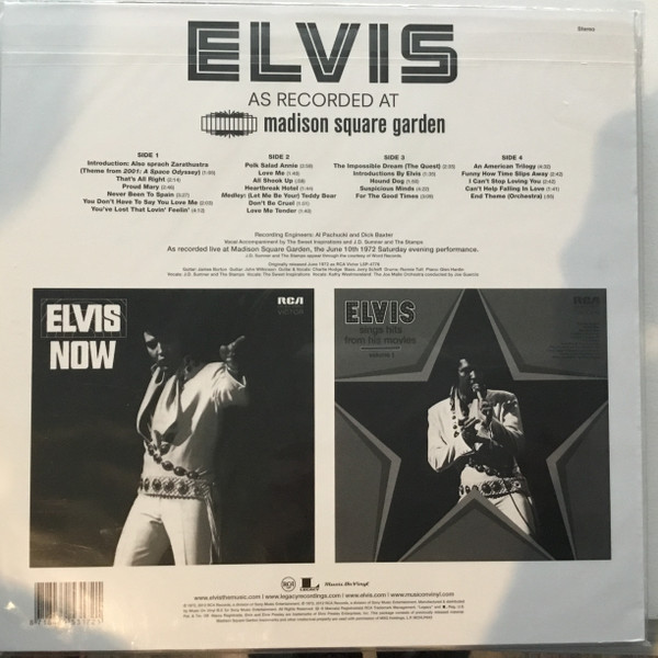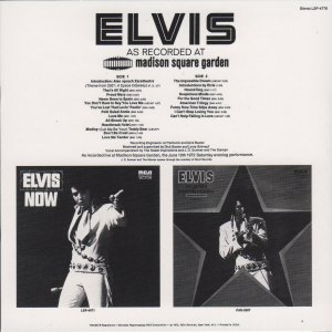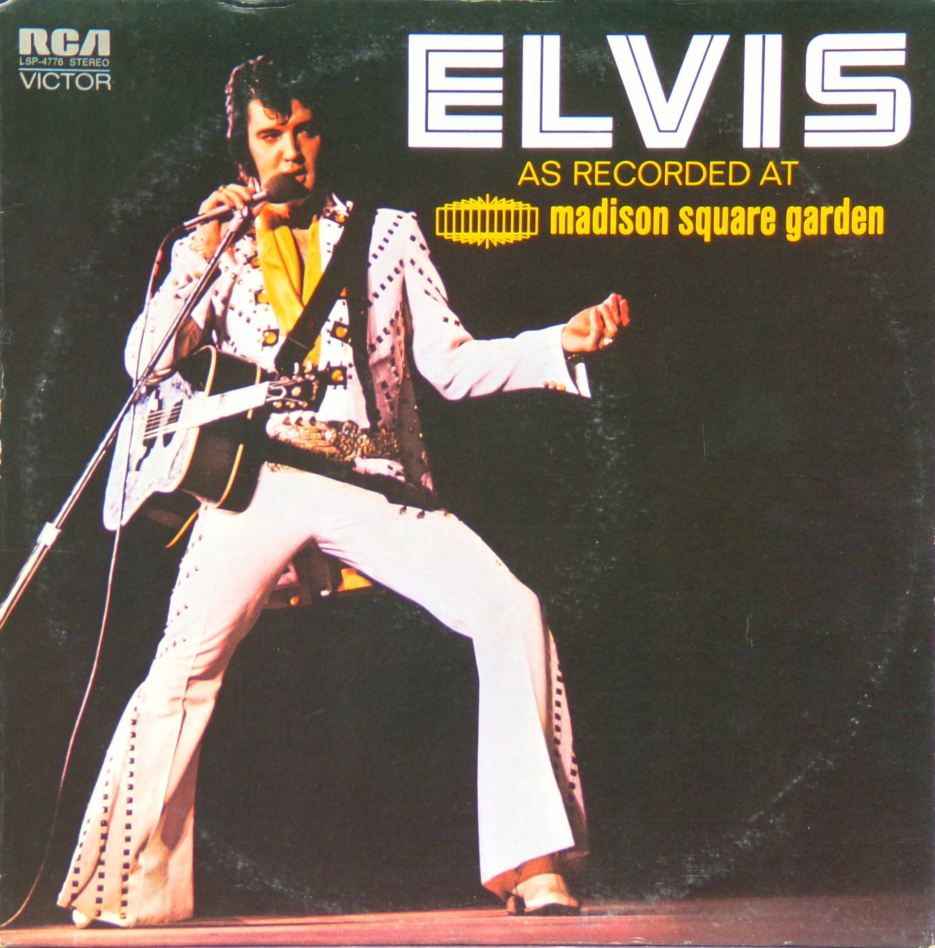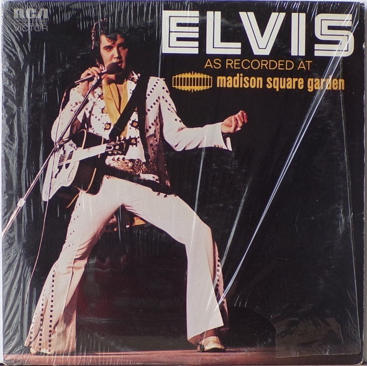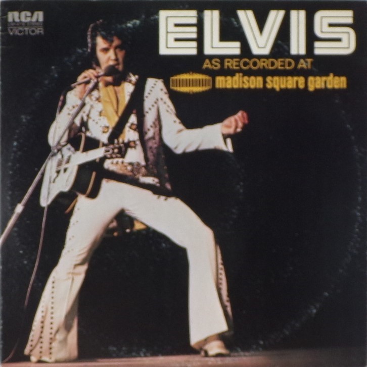 Square Garden, New York City, Brief History : Elvis: As Recorded at Madison Square Garden is a live musical album recorded by Elvis Presley and released in June 1972 by RCA Records peaking on the charts in July 1972. Recorded at the Madison Square Garden arena in New York City on Saturday June 10, 1972, the concert, and the subsequent album, were promoted as being Presley's first live concerts in the Big Apple since the 1950s. It was certified Gold on 8/4/1972, Platinum on 5/20/1988, 2x Platinum on 3/27/1992 and 3x Platinum on 7/15/1999 by the RIAA. Despite the lengthy track listing, the release was only a single disc, and the record was released only a week after the concert itself. Elvis' very next album would also be a live recording featuring many of the same songs: Aloha from Hawaii: Via Satellite. The concert included on this album was the evening show. An afternoon performance was also recorded, but except for a performance of "I Can't Stop Loving You" which appeared in the 1977 compilation, Welcome to My World, it remained unreleased until the 1990s when it was issued as An Afternoon in the Garden. Drummer Ronnie Tutt claimed in an interview in 2009 for the BBC documentary Elvis in Vegas that Colonel Tom Parker sped up the mixes so that more tracks could be on the album, increasing his publishing royalties. Tutt's account has never been proven as factual. Front Cover : Photo of Elvis. Title top right. Catalogue number top