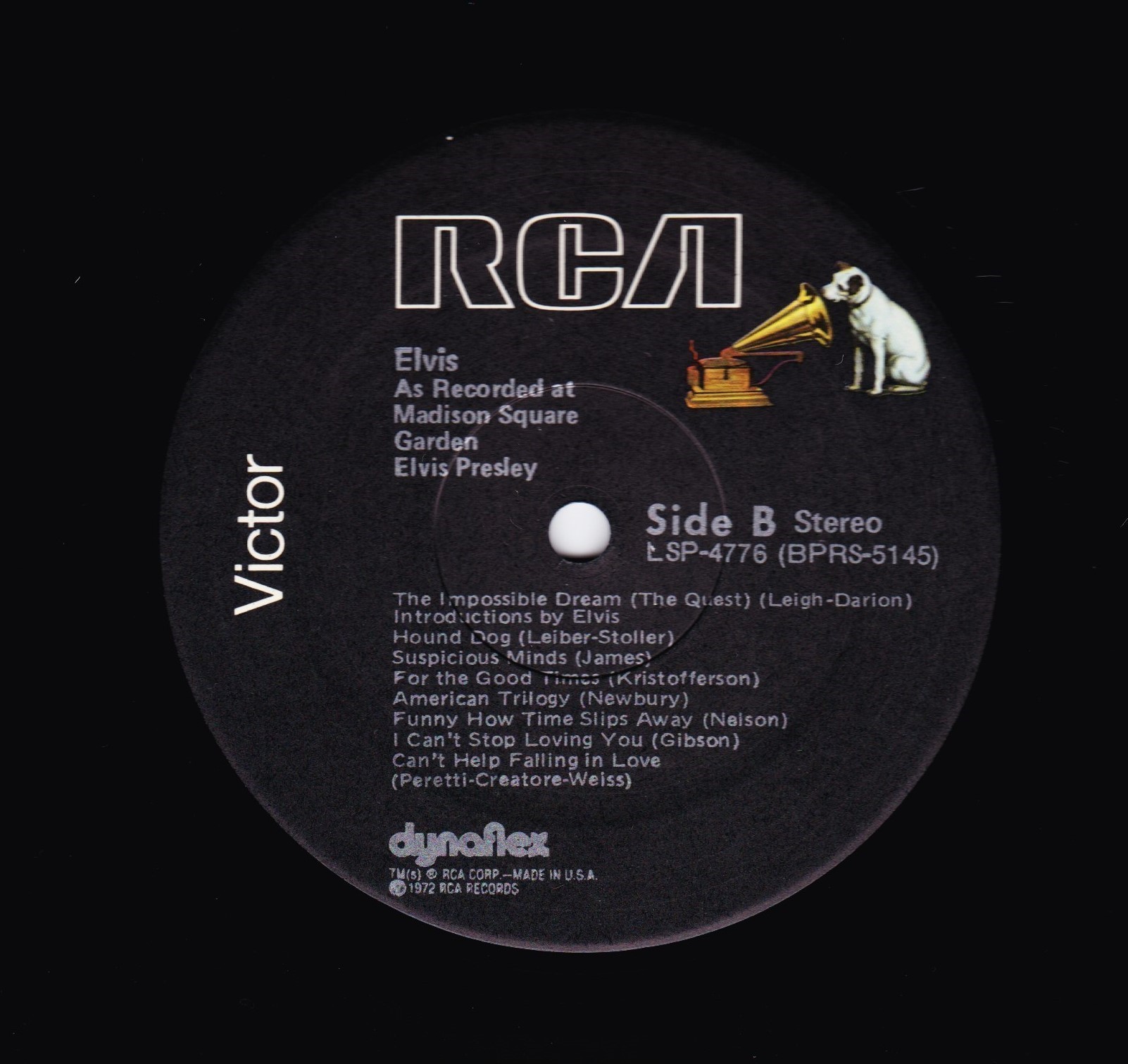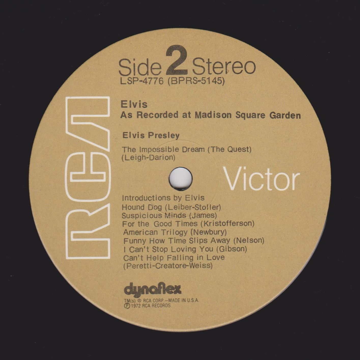 AS RECORDED AT MADISON SQUARE GARDEN (LP) (US) RCA LSP 4776 Released: June 1972 Side 1 Introduction: Also Sprach Zarathustra * That's All Right * Proud Mary * Never Been To Spain * You Don't Have To Say You Love Me * You've Lost That Lovin' Feelin' * Polk Salad Annie * Love Me * All Shook Up * Heartbreak Hotel * Teddy Bear / Don't Be Cruel * Love Me Tender * Side 2 Impossible Dream * Introduction By Elvis * Hound Dog * Suspicious Minds * For The Good Times * American Trilogy * Funny How Time Slips Away * I Can't Stop Loving You * Can't Help Falling In Love * End Theme * * Recorded: Madison