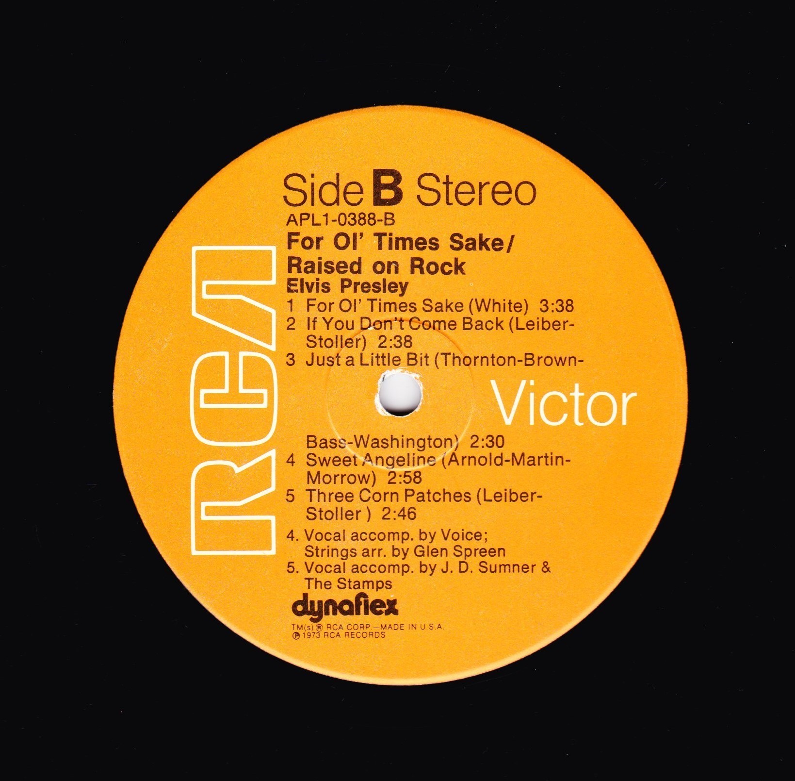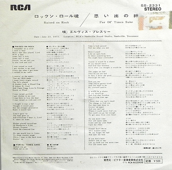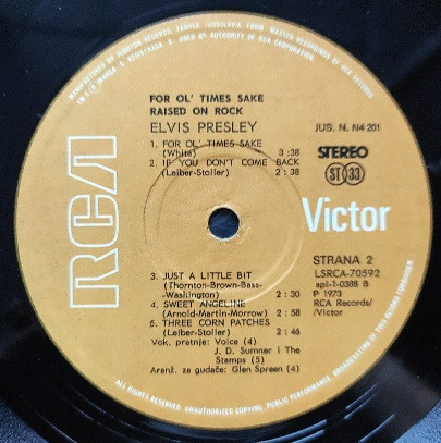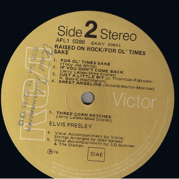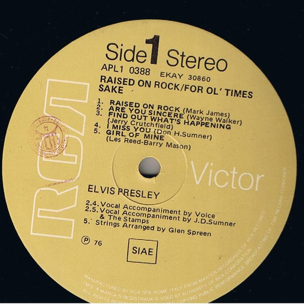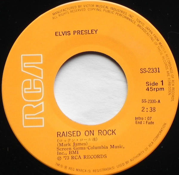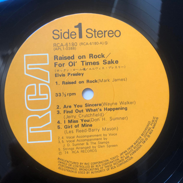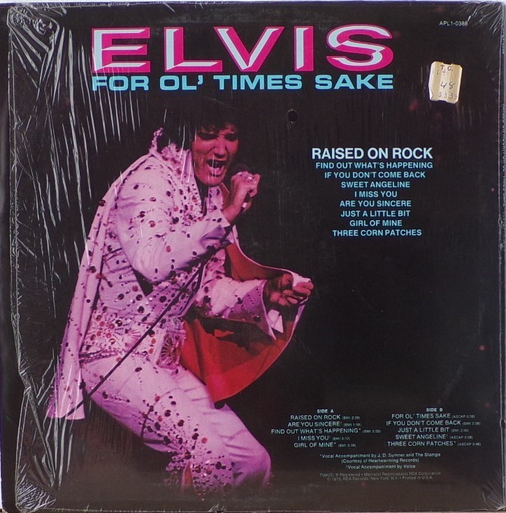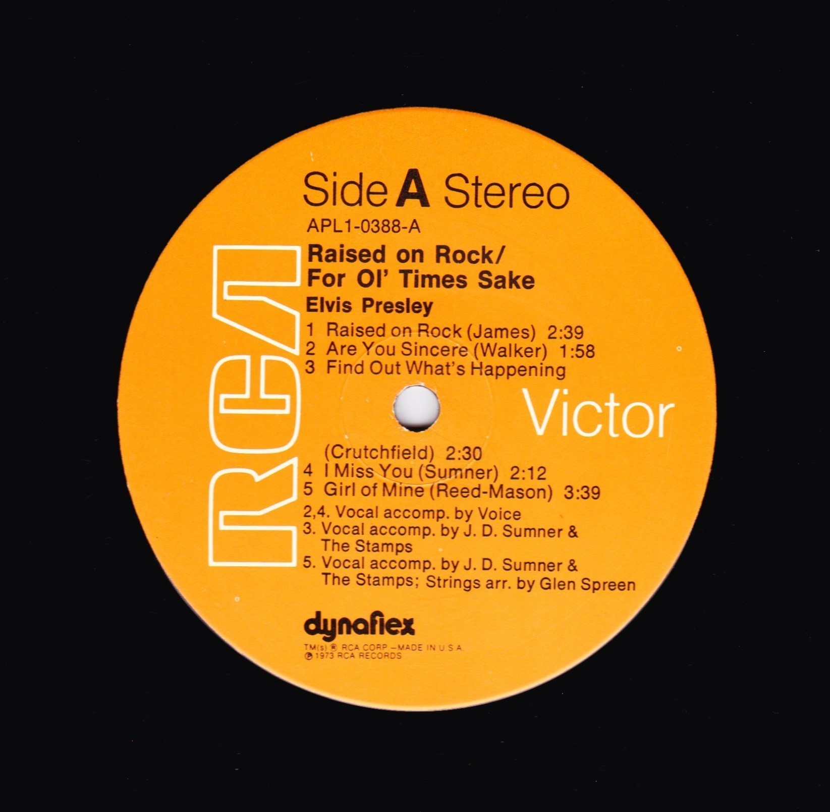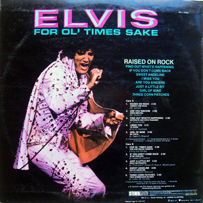 Stax Studio, Memphis, July 21, 1973 Brief History : Raised on Rock is a studio album by Elvis Presley released in 1973. It, along with the album Elvis, were both released after the massive success of Aloha From Hawaii (although the entire Elvis album contained material recorded before the 'Aloha' show). The record sold over 1 million copies worldwide. It was recorded at Stax Studios in Memphis in July 1973 and Presley's home in Palm Springs, California in September 1973. Two songs from these sessions would be retained for release on the Good Times album the following spring. The initial vocal tracks were recorded in July 1973. The album actually was one of the few that failed to chart in the UK, but the single "Raised on Rock"/"For Ol' Times Sake" did enter the British charts. The album had a very different sound about it, more funky and soul-like that many of the previous efforts and was certainly a change in direction. Some of the songs are well known covers like "Are You Sincere" which had been around for many years, but some new songs like the lead off single were actually written for Elvis, or written by writers Elvis trusted such as Mark James. Front Cover : Photo of Elvis. Title on top. Catalogue number right