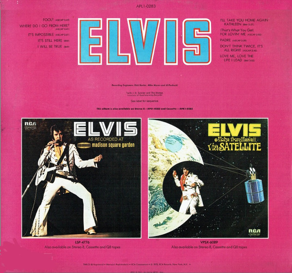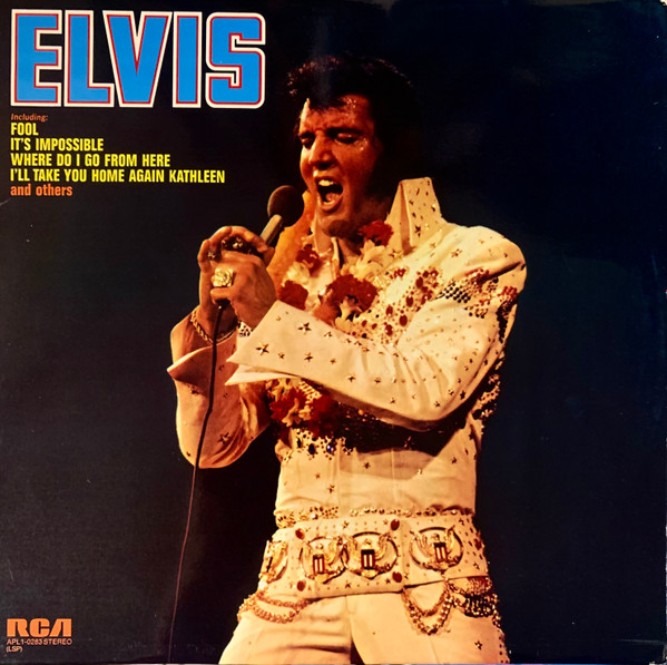 Lead - It's Still Here - It's Impossible Brief History : Elvis is Elvis Presley's self-titled 1973 album. This album is often called The Fool album after one of the songs included in it, in order to differentiate it from the 1956 album of the same title. The album sold over 1 million copies worldwide despite it being released soon after the much more successful Aloha from Hawaii album. Fool and Where Do I Go From Here were recorded in March 1972. It's Impossible is a live recording from the Hilton Hotel in Las Vegas from February 1972. Tracks 3, 4, 6-10 were leftovers from the March and May 1971 recording sessions at RCA's Studio B in Nashville. Three songs feature the King on piano: It's Still Here, I'll Take You Home Again, Kathleen and I Will Be True These three selections were all released together for a second time as part of the 1980 boxed set, Elvis Aron Presley. The song "Fool" was also released in this collection. Four other songs in this album were also reissued in other albums, as well; "It's Impossible" (Pure Gold, 1975), "Padre" (He Walks Beside Me, 1978), "(That's What You Get) For Lovin' Me" (A Canadian Tribute, 1978) and "Don't Think Twice, It's All Right" (Our Memories Of Elvis Volume 2, 1979). The title track "Fool" was issued as a single and managed to reach no 15 in the UK backed by a live version of "Steamroller Blues". On 12/1/2010 the album was certified 5 times Platinum by the RIAA. |