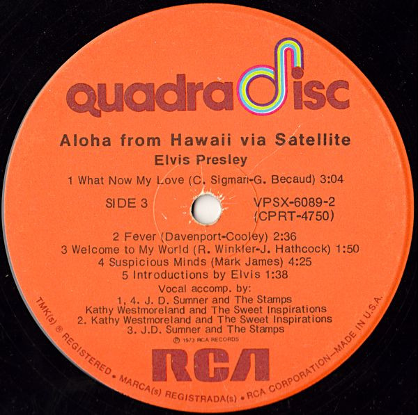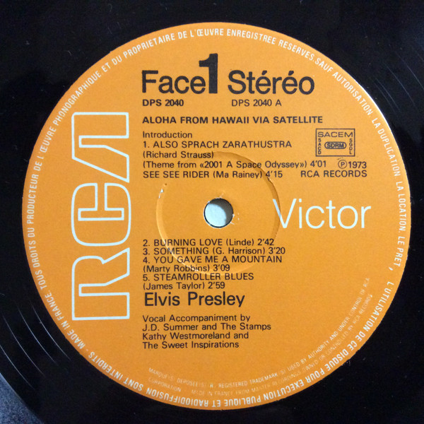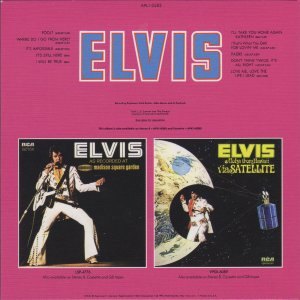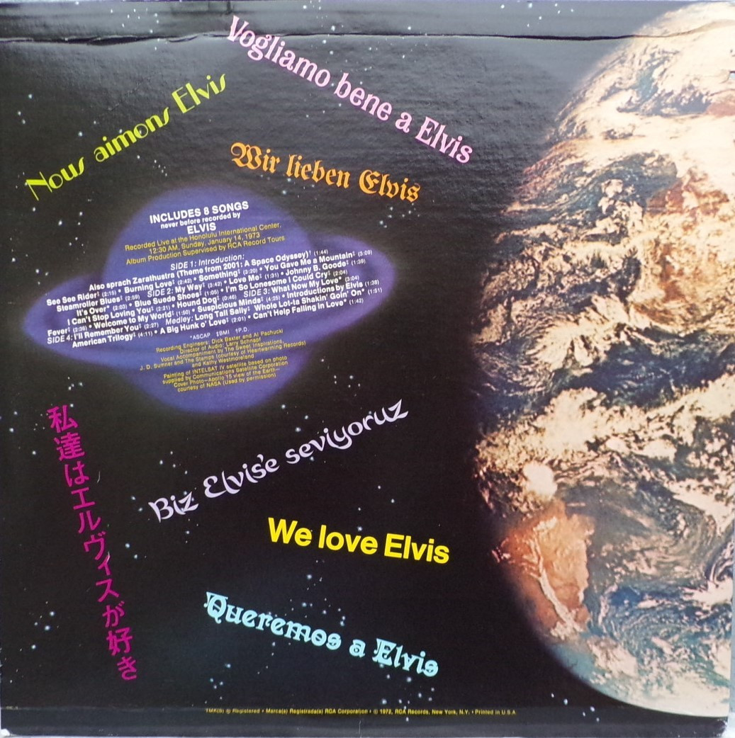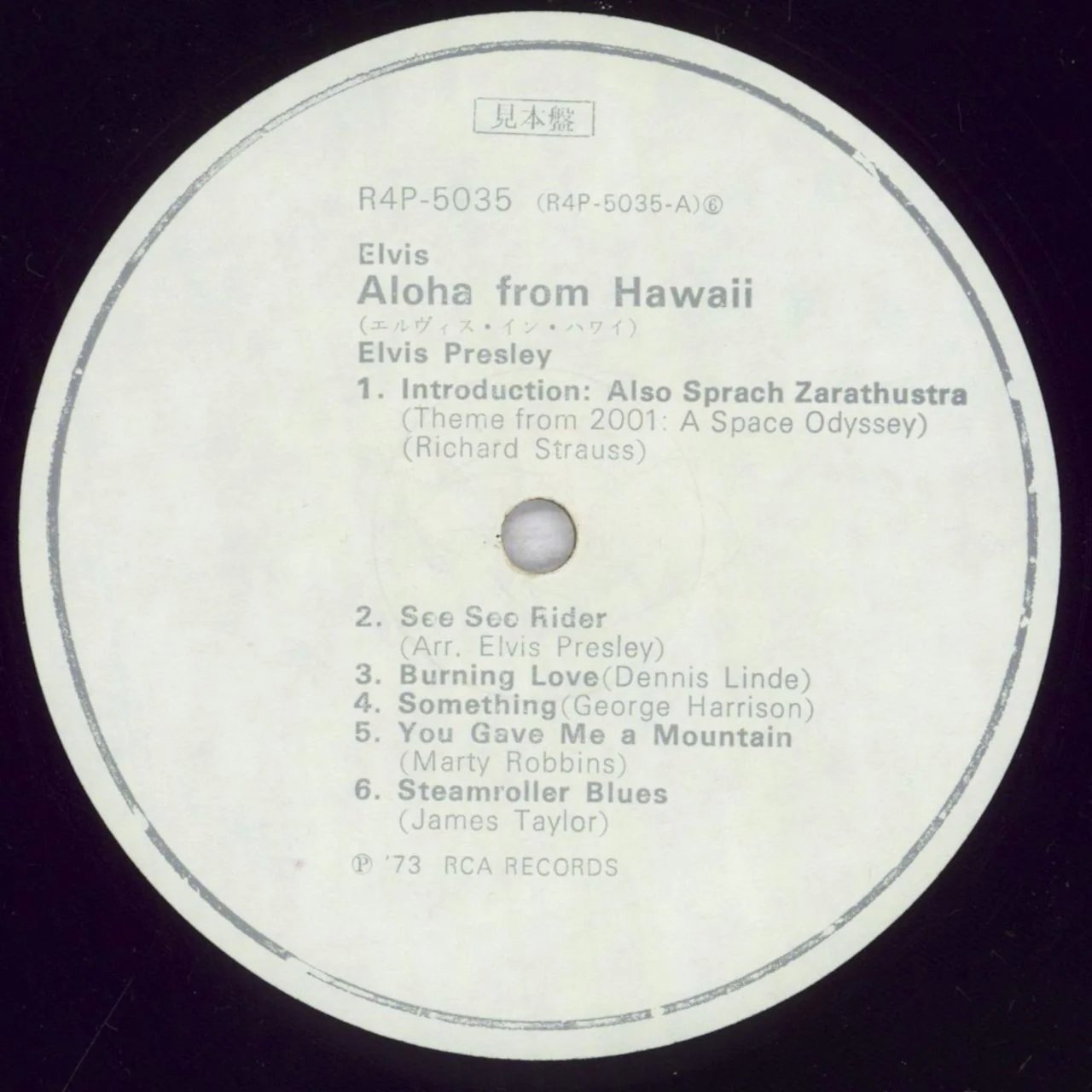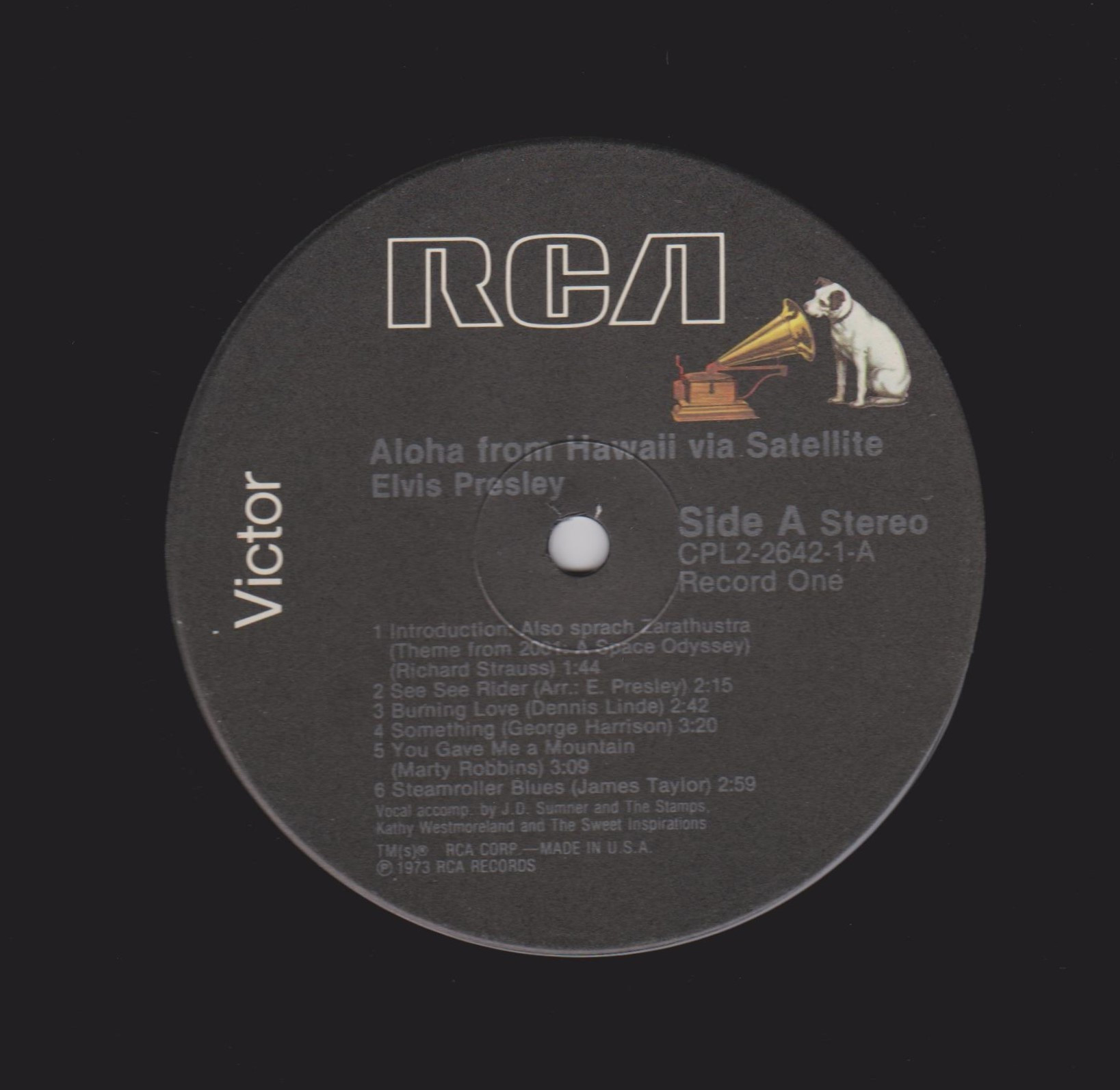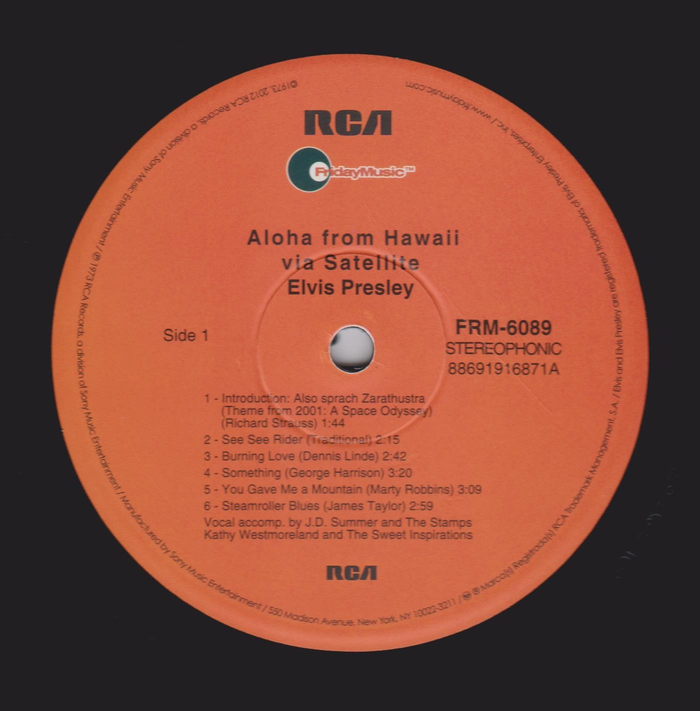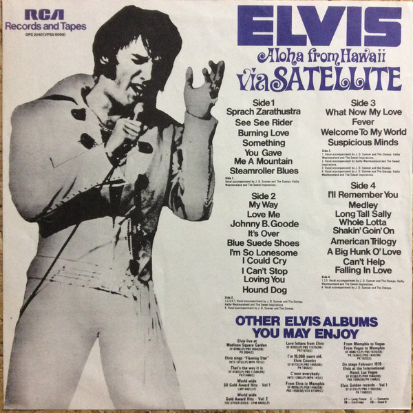 FROM HAWAII VIA SATELLITE (LP) (US) RCA VPSX 6089 Released: February 1973 Side 1 Introduction / Also Sprach Zarathustra * See See Rider * Burning Love * Something * You Gave Me A Mountain * Steamroller Blues * Side 2 My Way * Love Me * Johnny B. Goode * It's Over * Blue Suede Shoes * I'm So Lonesome I Could Cry * I Can't Stop Loving You * Hound Dog * Side 3 What Now My Love * Fever * Welcome To My World * Suspicious Minds * Introductions By Elvis * Side 4 I'll Remember You * Long Tall Sally / Whole Lotta Shakin' Goin' On * American Trilogy * Big Hunk O' Love * Can't Help Falling In Love * Closing Vamp * * Recorded: Honolulu International Centre,