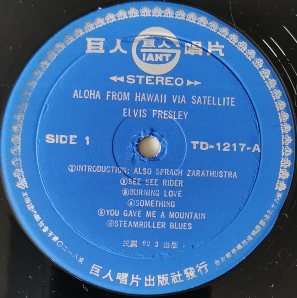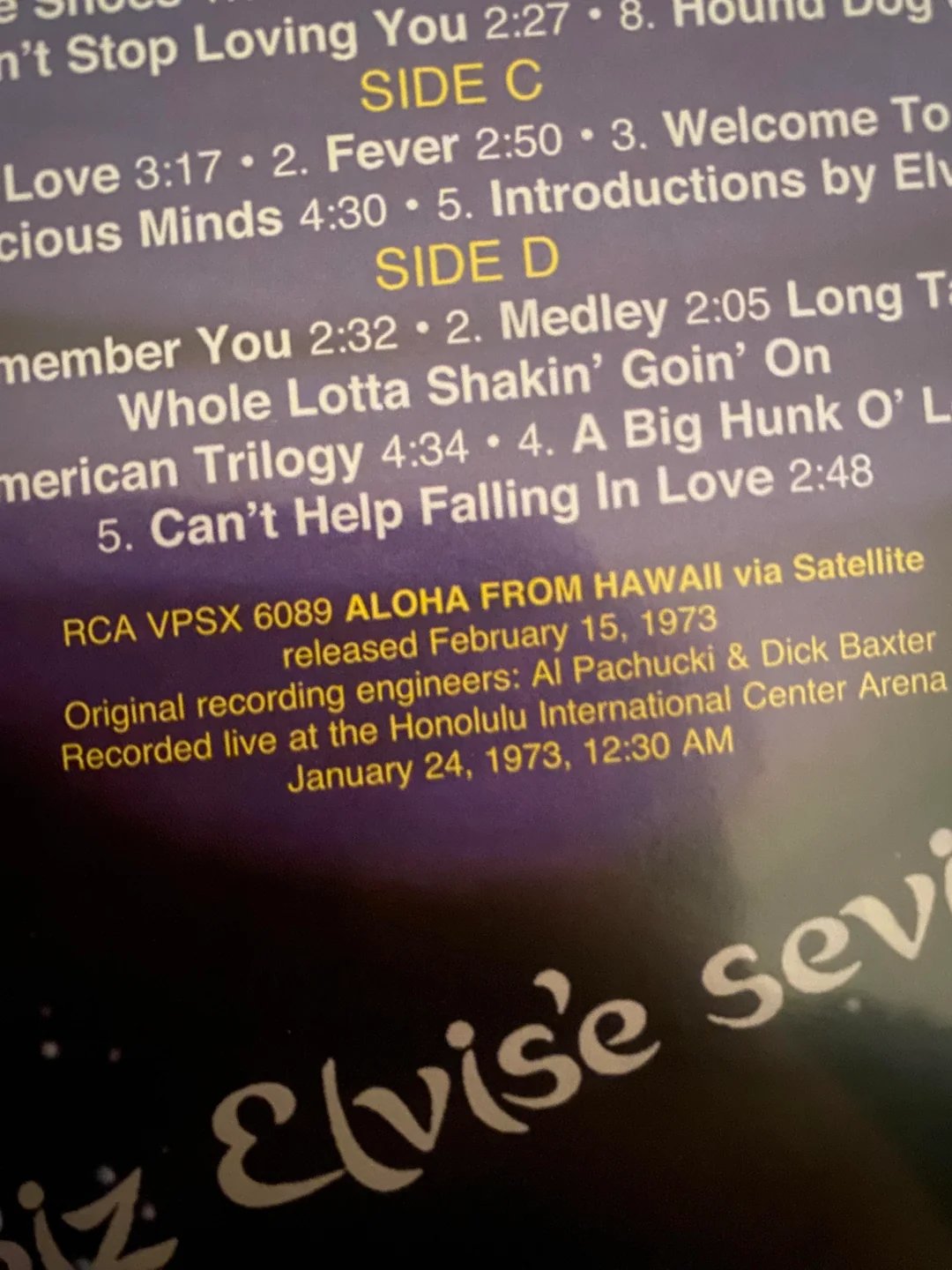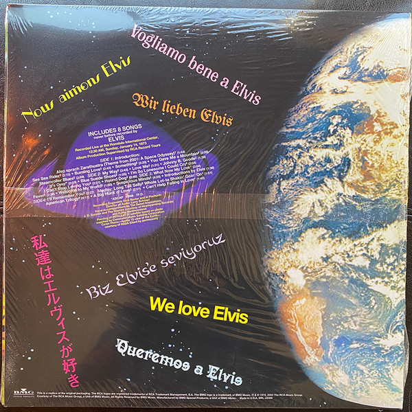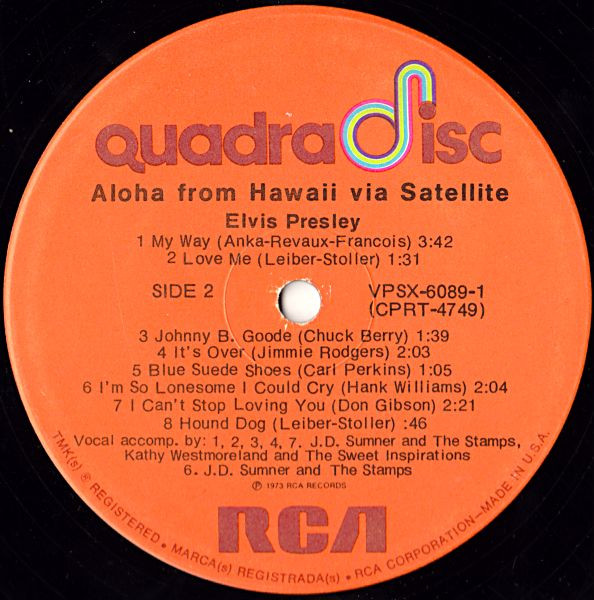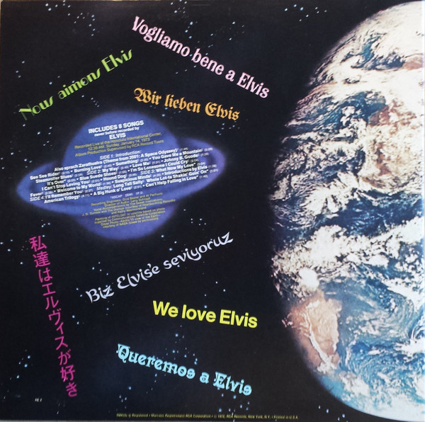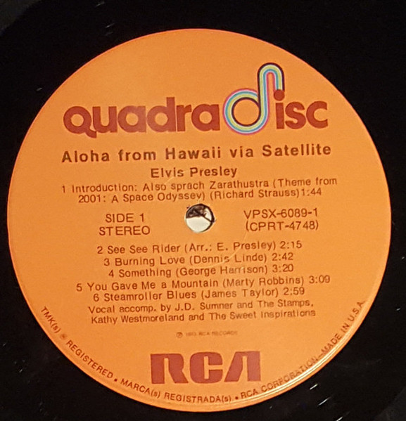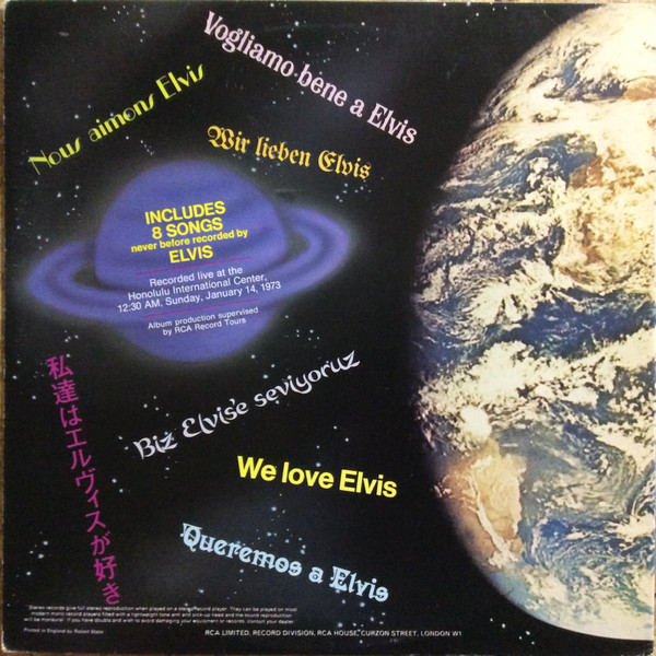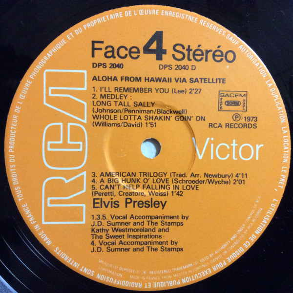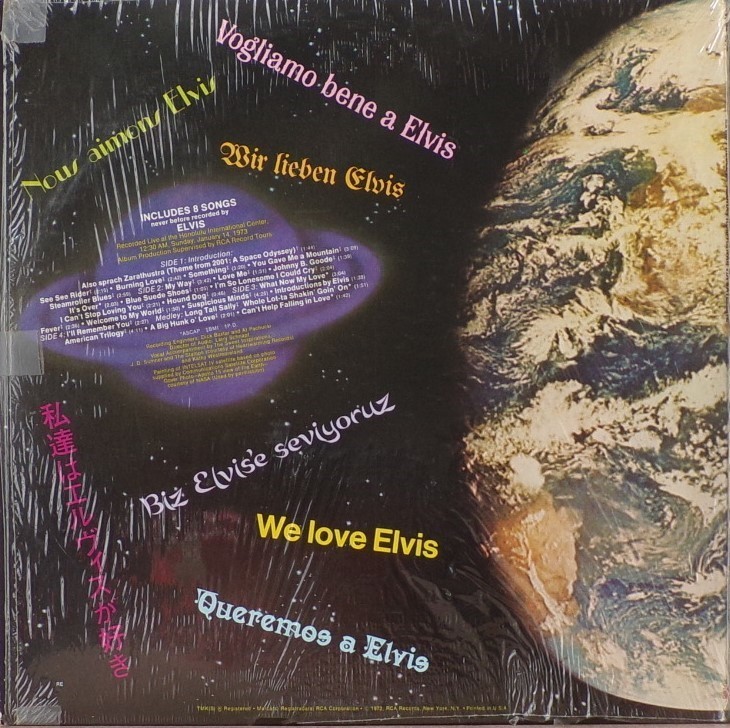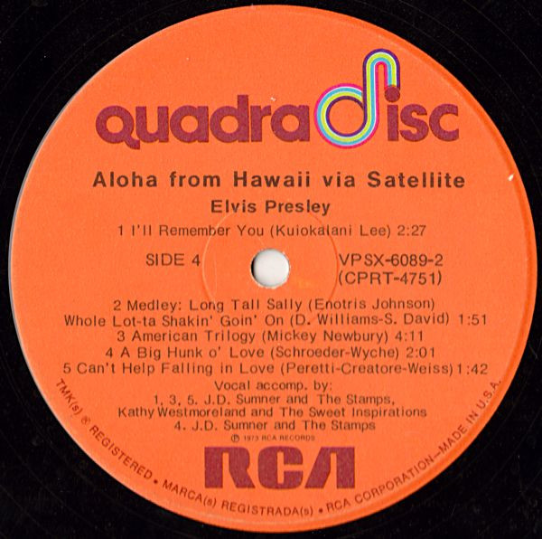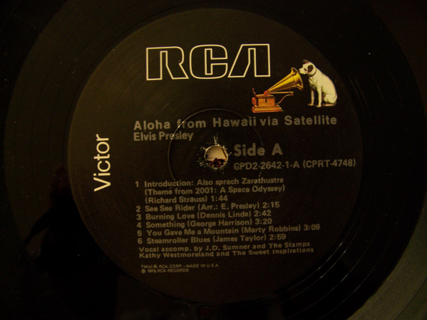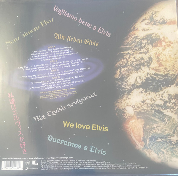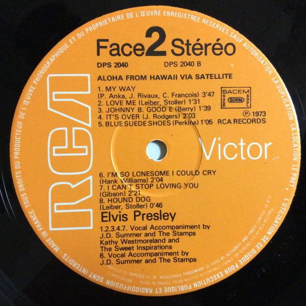 FROM HAWAII VIA SATELLITE (LP) (US) RCA VPSX 6089 Released: February 1973 Side 1 Introduction / Also Sprach Zarathustra * See See Rider * Burning Love * Something * You Gave Me A Mountain * Steamroller Blues * Side 2 My Way * Love Me * Johnny B. Goode * It's Over * Blue Suede Shoes * I'm So Lonesome I Could Cry * I Can't Stop Loving You * Hound Dog * Side 3 What Now My Love * Fever * Welcome To My World * Suspicious Minds * Introductions By Elvis * Side 4 I'll Remember You * Long Tall Sally / Whole Lotta Shakin' Goin' On * American Trilogy * Big Hunk O' Love * Can't Help Falling In Love * Closing Vamp * * Recorded: Honolulu International Centre,