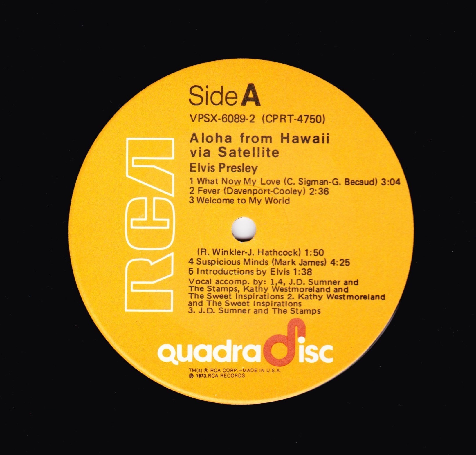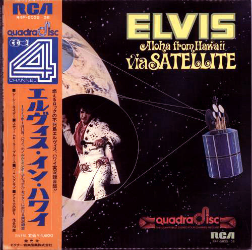 ELVIS PRESLEY Aloha From Hawaii Via Satellite (Rare 1973 Japanese only 24-track limited edition promo sample Quadradisc quadrophonic CD4 double LP with custom silver & white labels, fully compatible with normal stereo systems, great gatefold picture sleeve with integral 14-page full illustrated colour booklet. |