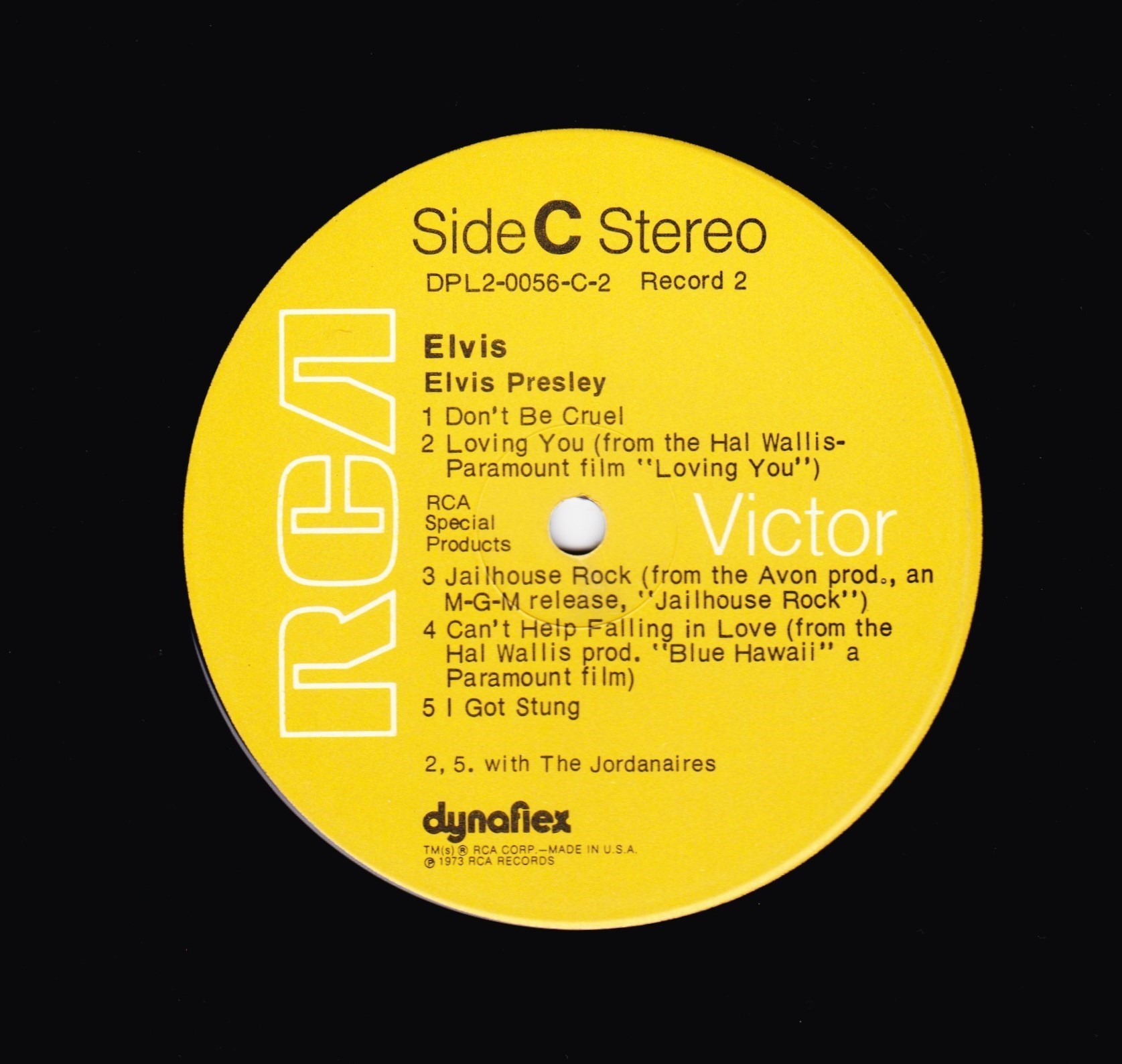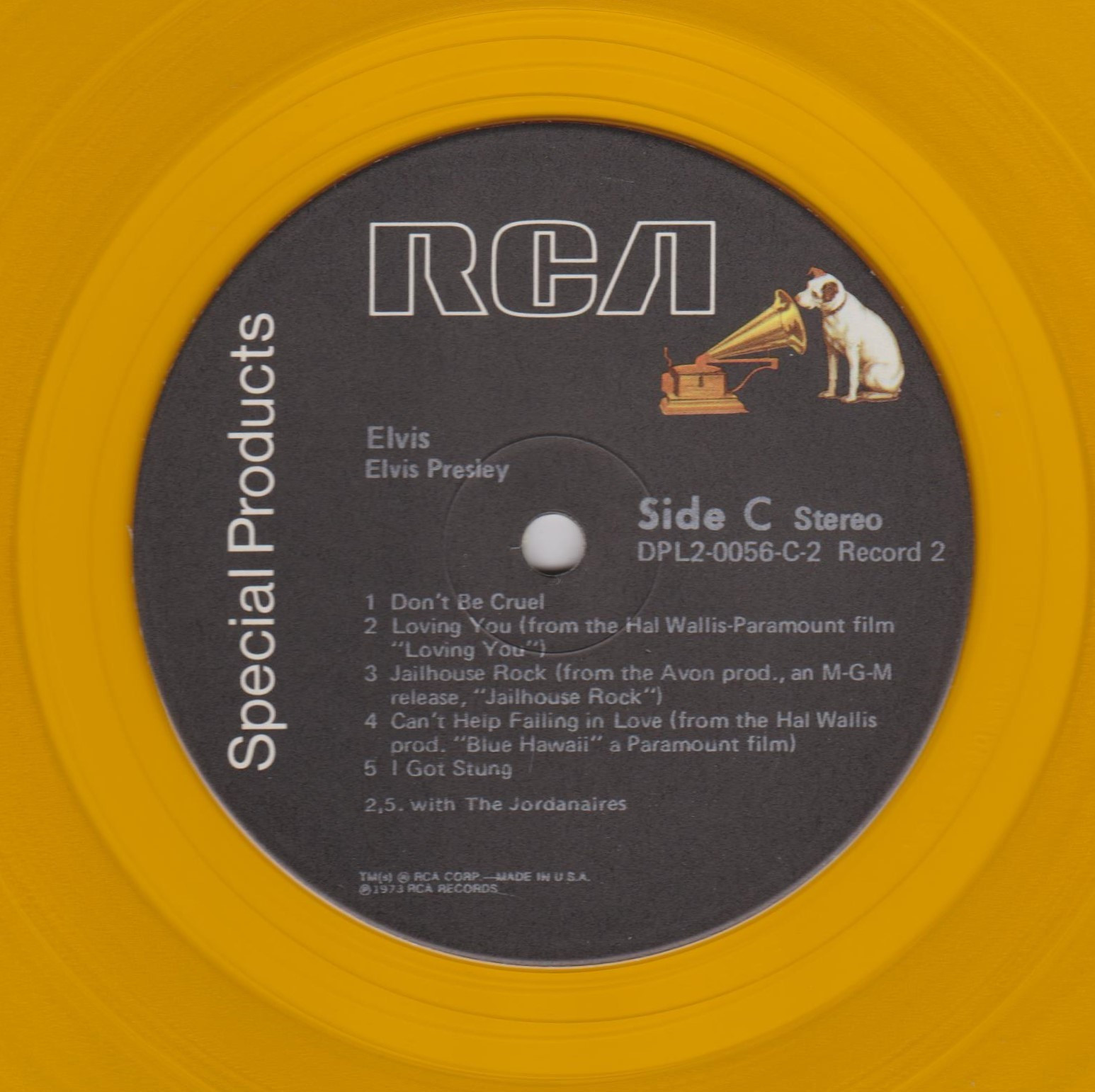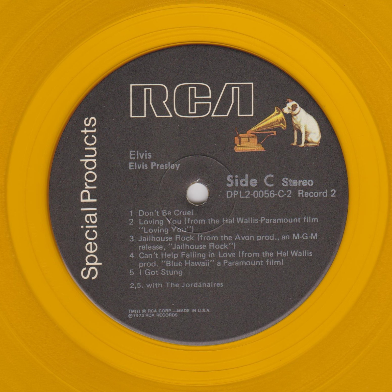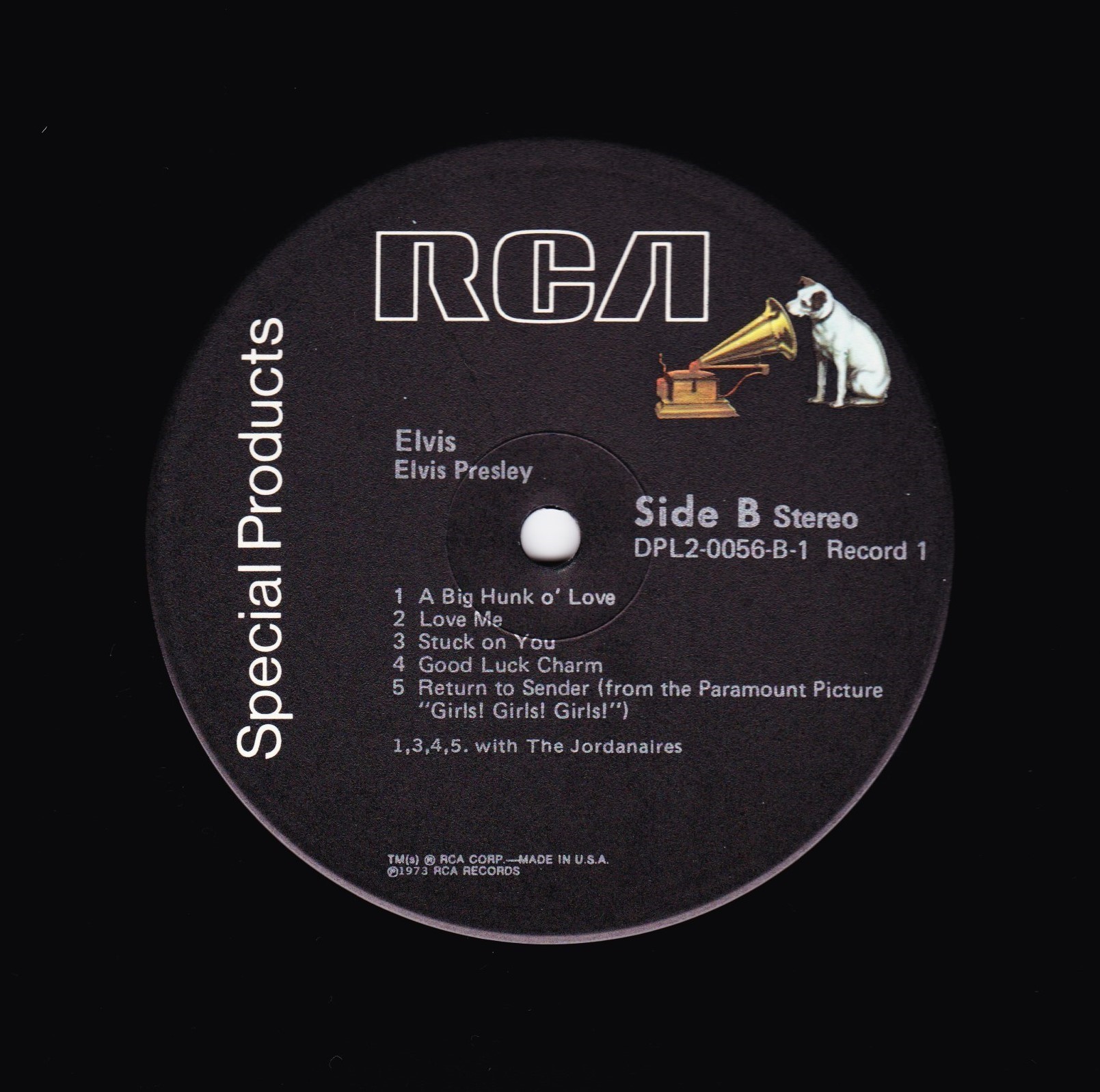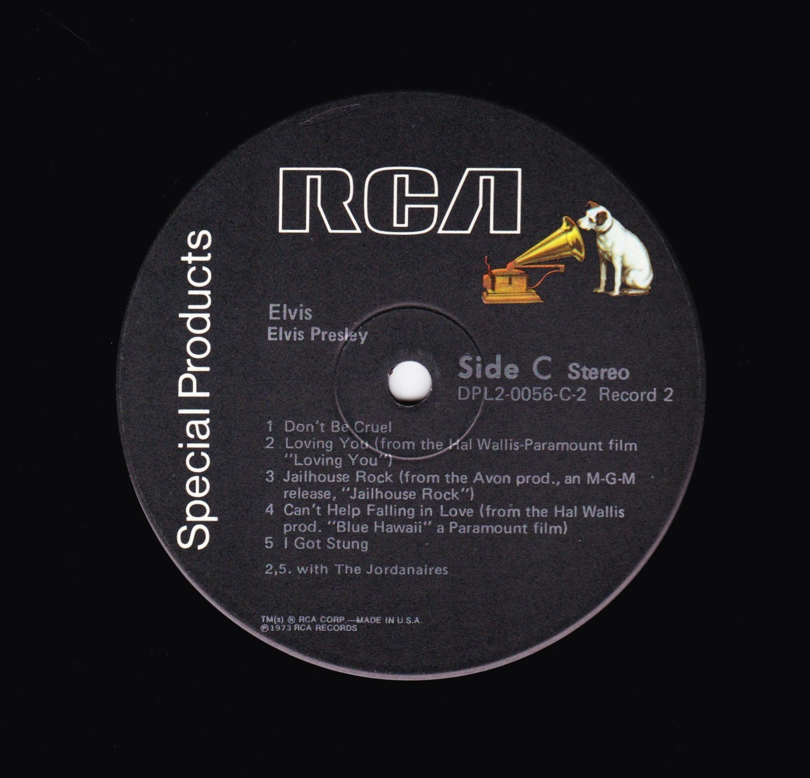 | Album Title : Elvis Catalogue Number : DPL2 - 0056 (e) Year Release : 02nd August 1973 Side 1 : Hound Dog I Want You, I Need You, I Love You All Shook Up Don't I Beg of You Side 2 : A Big Hunk o' Love Love Me Stuck On You Good Luck Charm Return To Sender Side 3 : Don't Be Cruel Loving You Jailhouse Rock Can't Help Falling In Love I Got Stung Side 4 : (Let Me Be Your) Teddy Bear Love Me Tender Hard Headed Woman It's Now Or Never Surrender Brief History : This was a single sleeve double album released on Brookville Records. The release is an RCA Special Products issue. Brookville Records logo is seen in the upper right hand corner of the front cover. The labels on this release were a mustard colour. Front Cover : Title bottom. Catalogue number top left under "Special