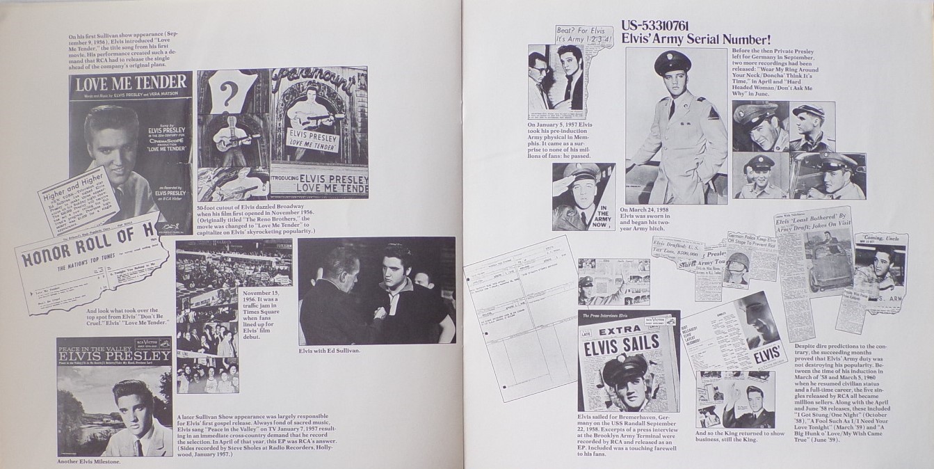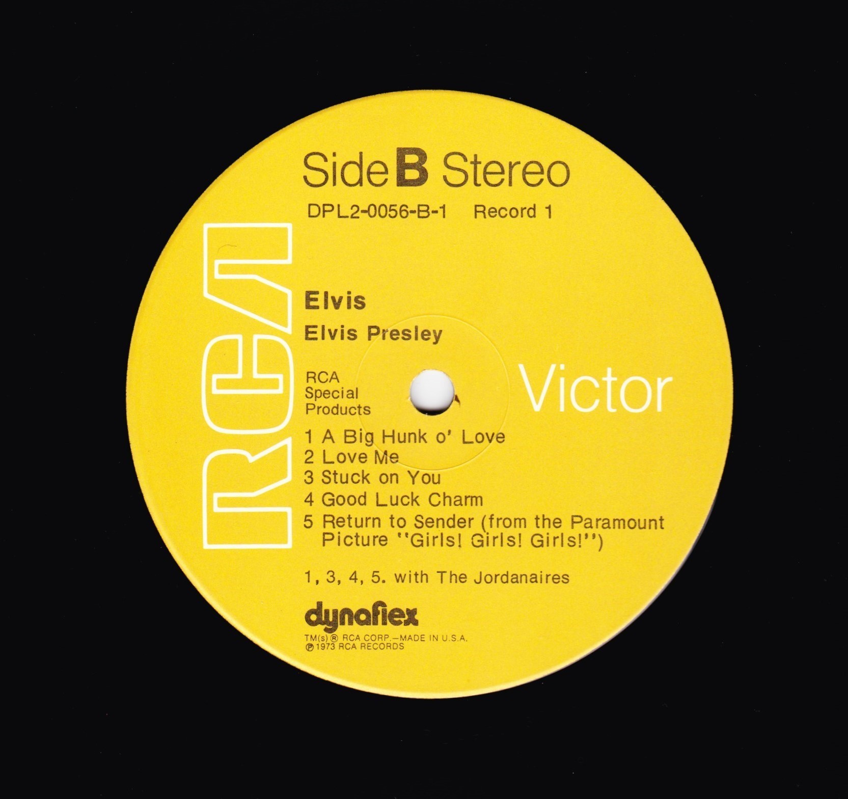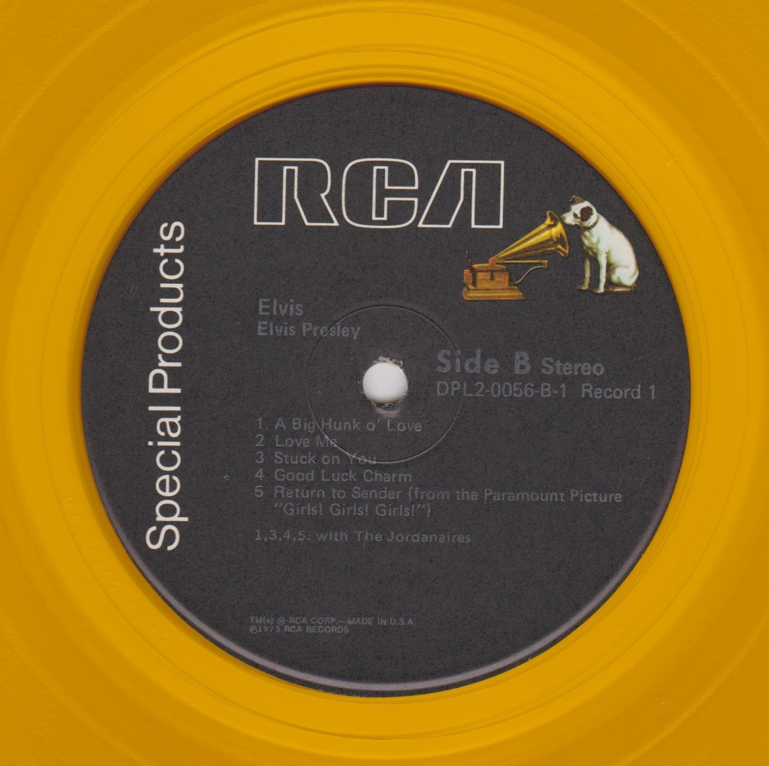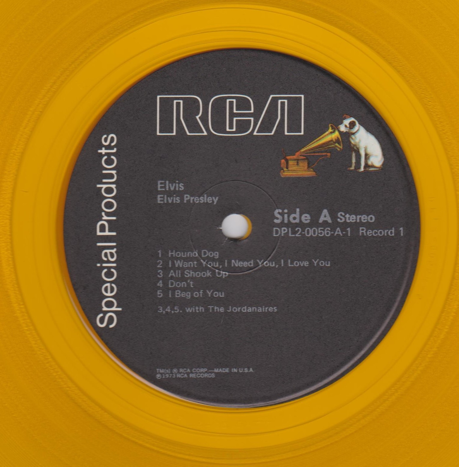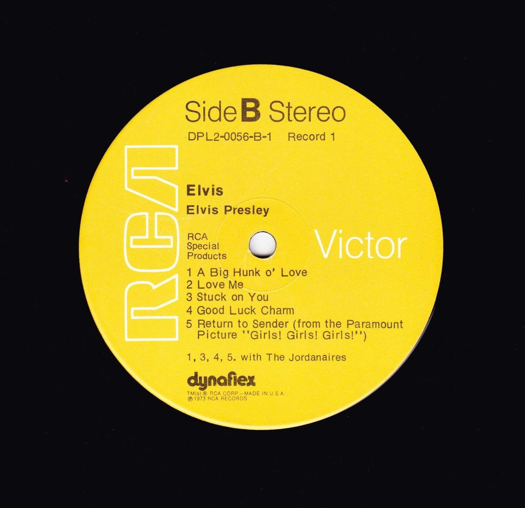 | Album Title : Elvis Catalogue Number : DPL2 - 0056 (e) Year Release : 02nd August 1973 Side 1 : Hound Dog I Want You, I Need You, I Love You All Shook Up Don't I Beg of You Side 2 : A Big Hunk o' Love Love Me Stuck On You Good Luck Charm Return To Sender Side 3 : Don't Be Cruel Loving You Jailhouse Rock Can't Help Falling In Love I Got Stung Side 4 : (Let Me Be Your) Teddy Bear Love Me Tender Hard Headed Woman It's Now Or Never Surrender Brief History : This was a single sleeve double album released on Brookville Records. The release is an RCA Special Products issue. Brookville Records logo is seen in the upper right hand corner of the front cover. The labels on this release were a mustard colour. Front Cover : Title bottom. Catalogue number top left under "Special