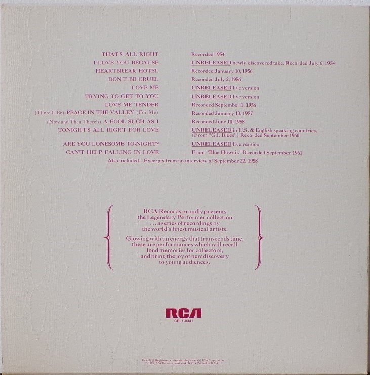 | Details : 1974 Release Front Cover : Die cut. Inner sleeve photo shows through die cut . Title on top. Rear Cover : Song titles. In brackets RCA statement about the Legendary Performer collections. Catalogue number & Printed in U.S.A. bottom centre. Label : Black. Side A : Volume 1 top under Elvis. Side B : Volume 1 top under Elvis. Pressing Plant : Indianapolis Matrix Number Side 1 : CPL1 - 0341 A - 6 A4 (Machine Stamped) J (Hand Etched) Matrix Number Side 2 : CPL1 - 0341 B - 4 B1 (Machine Stamped) A (Hand Etched) *NOTE* Second cover. Standard issue. Vinyl labels have Gold & Silver text. TM(s) RCA CORP - MADE IN U.S.A. white text. The front cover has a wood grain effect and "A Legendary Performer " the text is flat. |