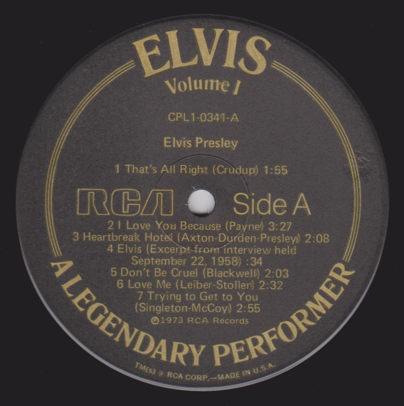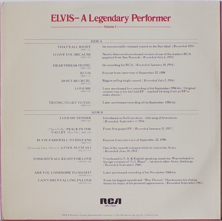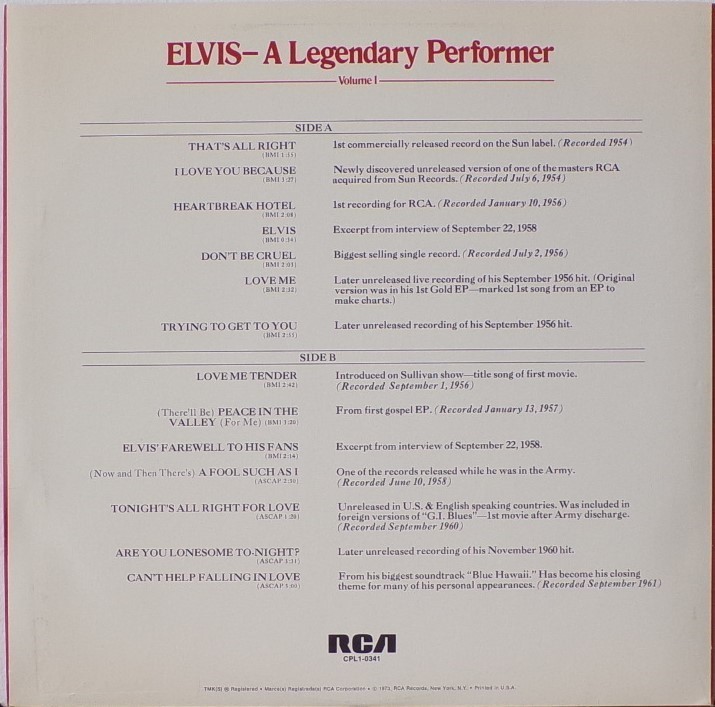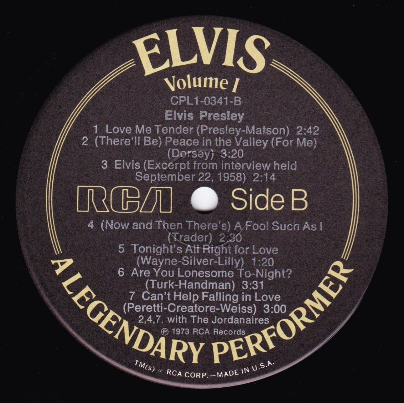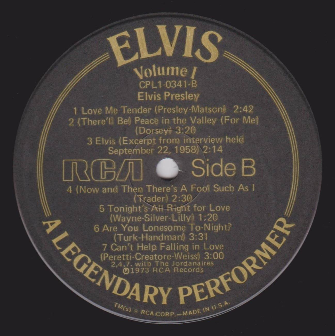 - A LEGENDARY PERFORMER, VOLUME 1 (LP) (US) RCA CPL1 0341 Released: November 1973 Side 1 That's All Right I Love You Because (Take 2) * Heartbreak Hotel Excerpt From "Elvis Sails" Don't Be Cruel Love Me *** Trying To Get To You *** Side 2 Love Me Tender Peace In The Valley Excerpt From "Elvis Sails" Fool Such As I Tonight's All Right For Love ** Are You Lonesome Tonight *** Can't Help Falling In Love *