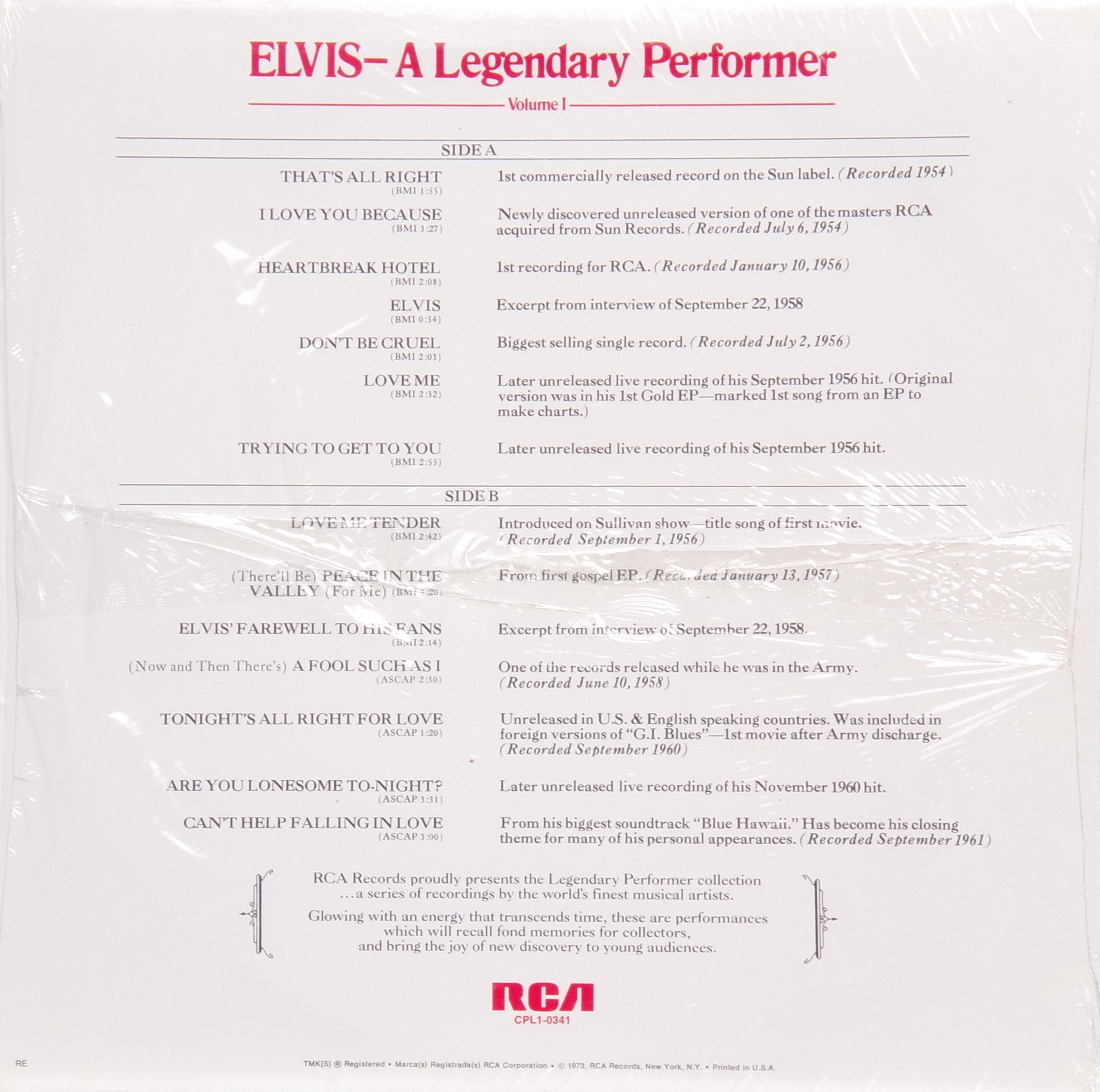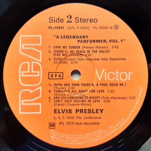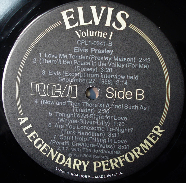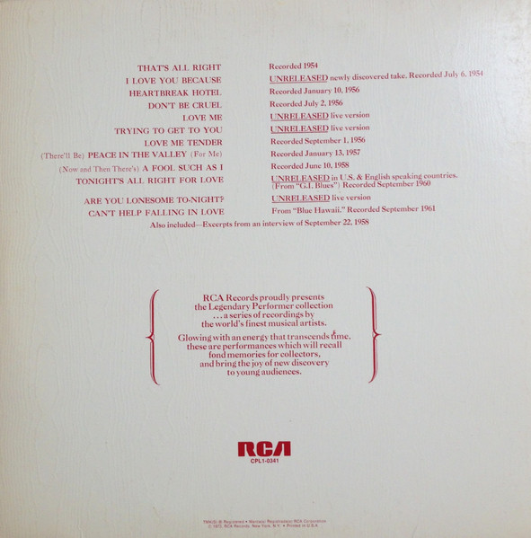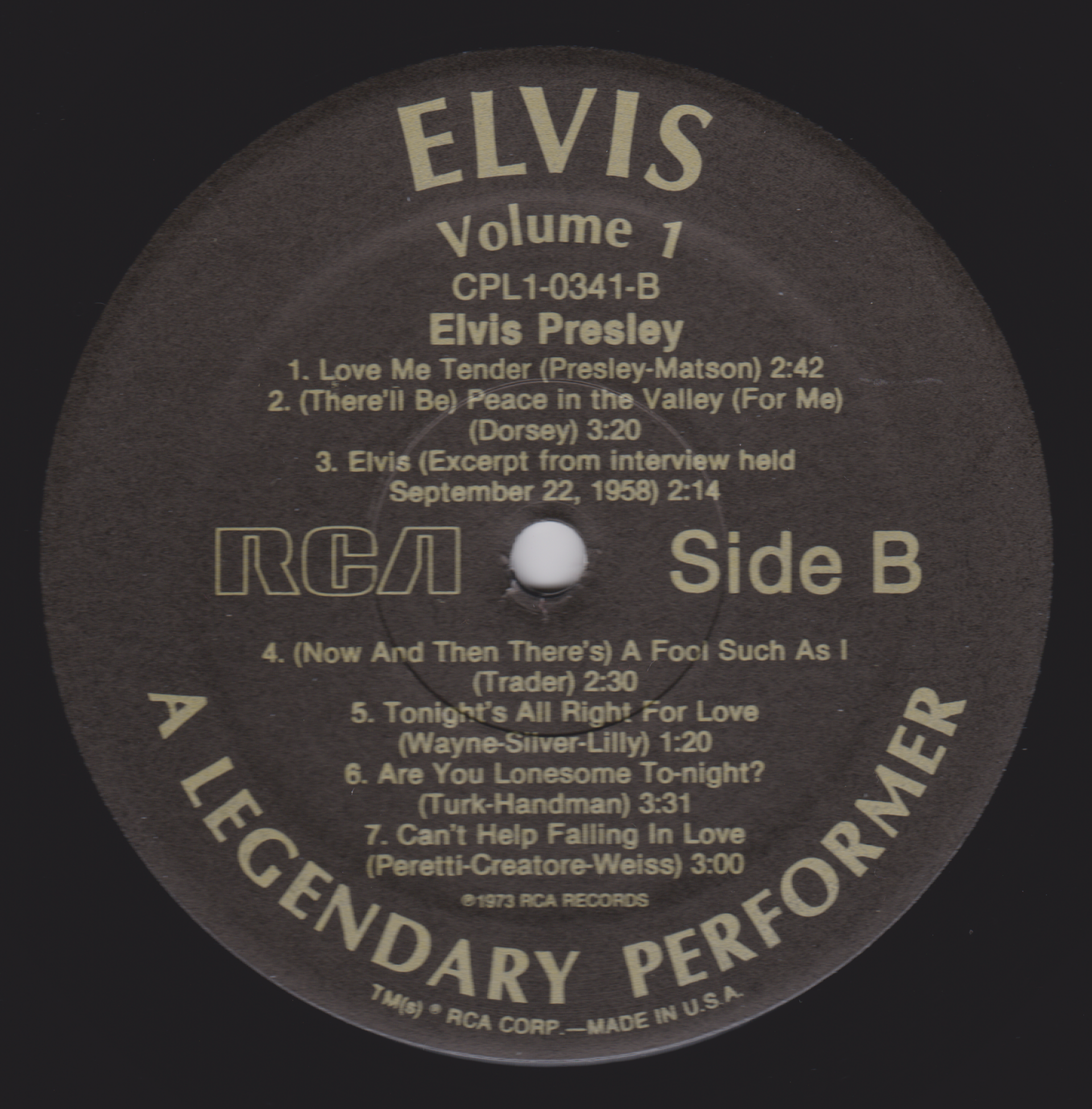 - A LEGENDARY PERFORMER, VOLUME 1 (LP) (US) RCA CPL1 0341 Released: November 1973 Side 1 That's All Right I Love You Because (Take 2) * Heartbreak Hotel Excerpt From "Elvis Sails" Don't Be Cruel Love Me *** Trying To Get To You *** Side 2 Love Me Tender Peace In The Valley Excerpt From "Elvis Sails" Fool Such As I Tonight's All Right For Love ** Are You Lonesome Tonight *** Can't Help Falling In Love *