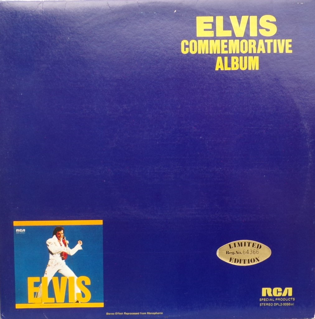 | Details : Gatefold September 1978 Reissue Front Cover : Title top right. Catalogue number bottom right. Rear Cover : Title top right. Catalogue number bottom right. Printed in USA bottom. Label : Black. Dog near top. Side A : RCA logo at top. Side B : RCA logo at top. Side C : RCA logo at top. Side D : RCA logo at top. Pressing Plant : Indianapolis Matrix Number Side 1 : DPL2 - 0056 A - 3 A1C (Machine Stamped) A (Hand Etched) Matrix Number Side 2 : DPL2 - 0056 B - 2 C11 (Machine Stamped) W (Hand Etched) Matrix Number Side 3 : DPL2 - 0056 C - 7 AJ5 (Machine Stamped) JJ (Hand Etched) Matrix Number Side 4 : DPL2 - 0056 D - 5 A2 (Machine Stamped) SS (Hand Etched)* NOTE* This reissue was released on "Gold Vinyl" with a black label. It is the same as the "Brookville" release titled "Elvis". The title on the front cover is shown as "The Commemorative Album". It comes with a "Certificate" of authenticity with matching serial number inserted inside the cover. The Gold Limited Edition sticker has the number "Reg.No. 64366". The enclosed certificate matches this. The bottom left of the front & rear covers has a small photo of the original release. |